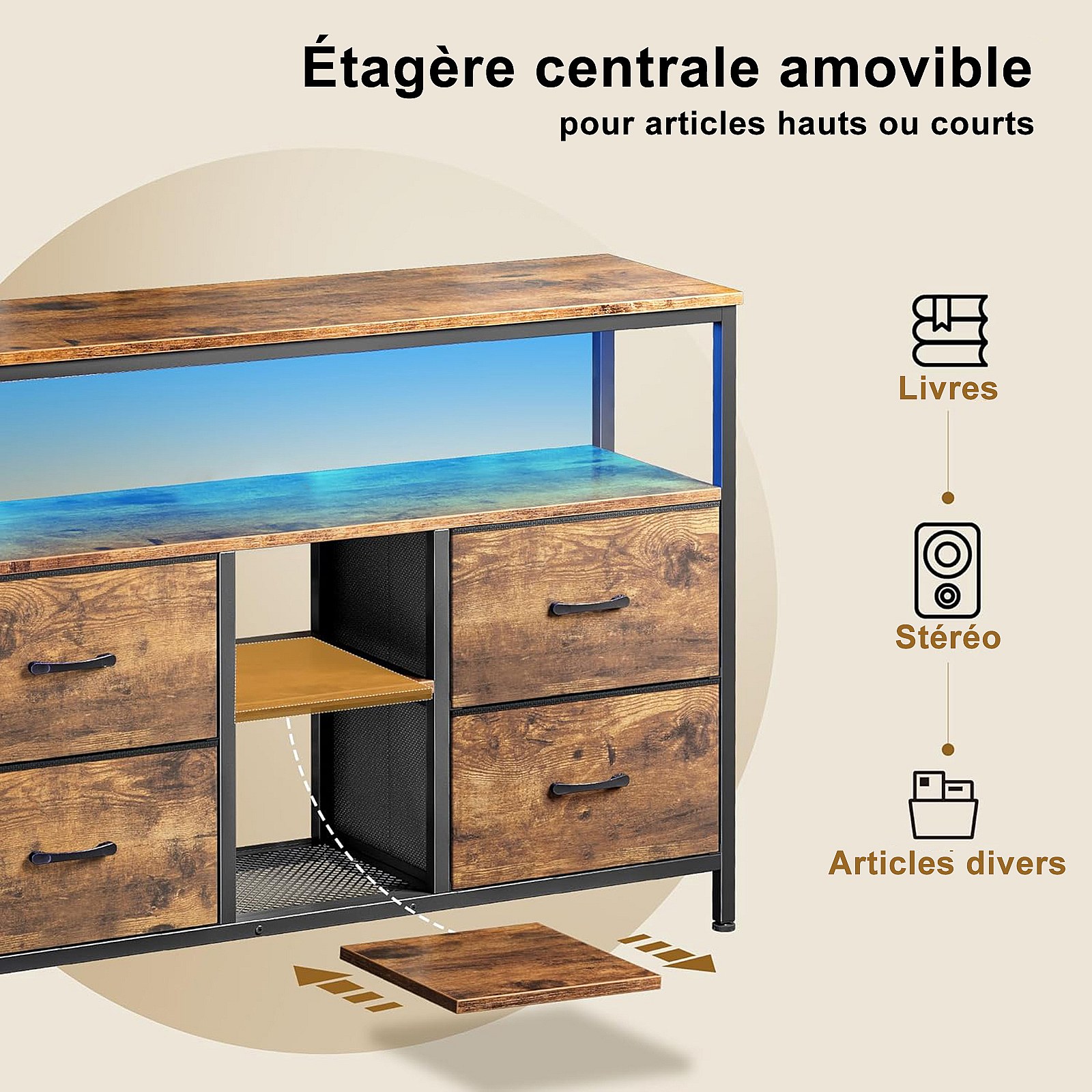 LED TV-meubel met 4 lades, 137x30x78cm Retro TV-meubel Dressoir, Lade in tijgerhuidkleur