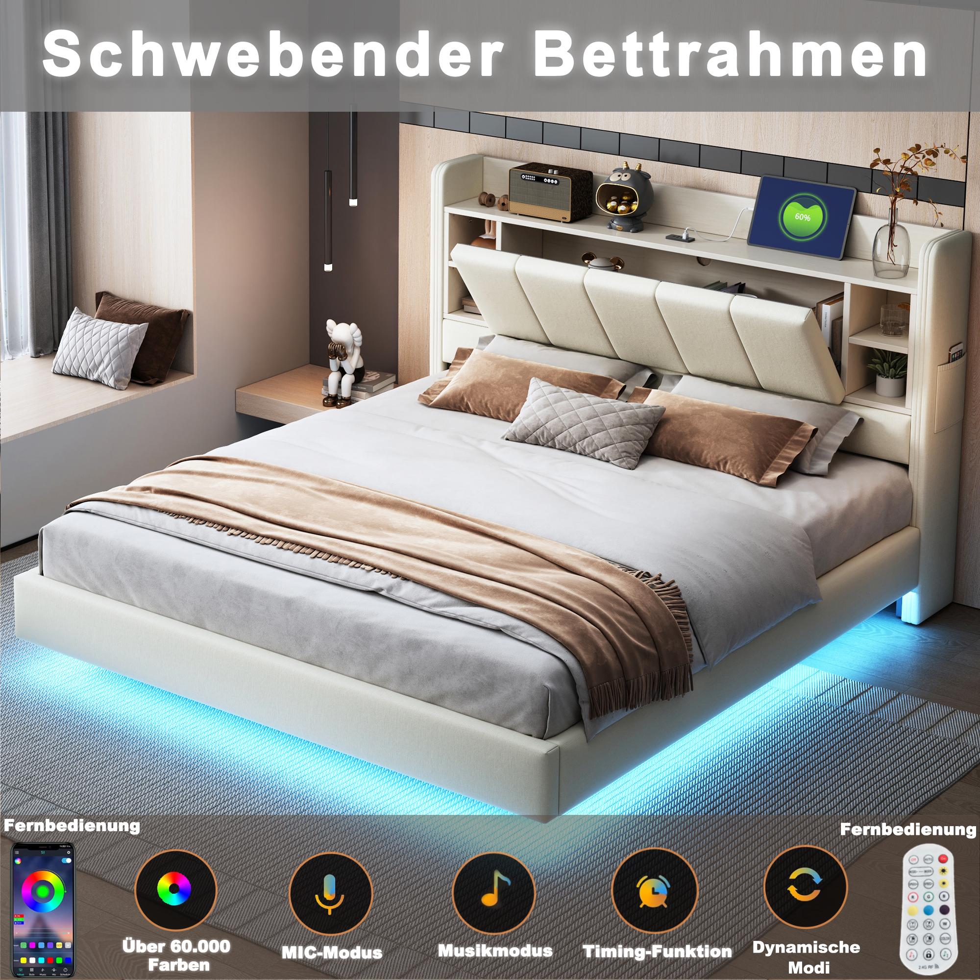 Leren bed, 160x200 cm met USB, lichtstrip, omkeerbaar hoofdbord met planken en opbergruimte (214,5x165x114 cm)