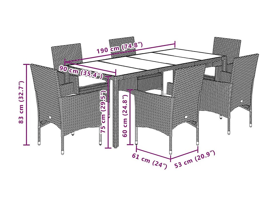 Magnir 7-delige Tuinset met kussens poly rattan grijs