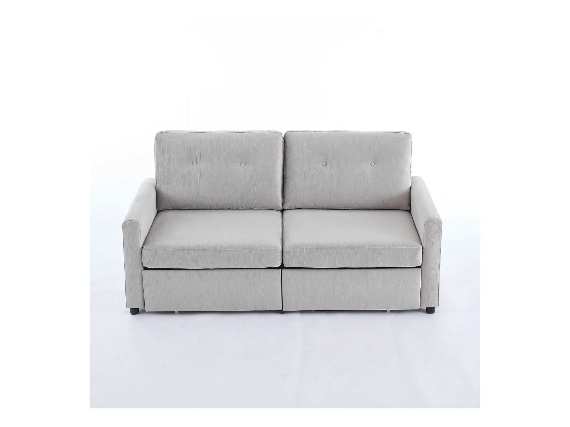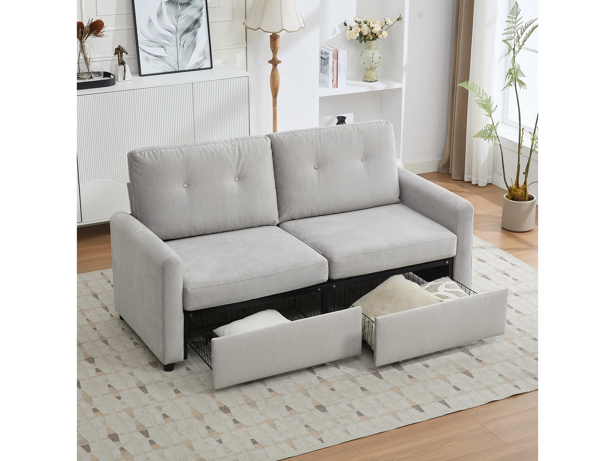 Lichtgrijze 2-zitsbank met 2 lades, hout en stof.