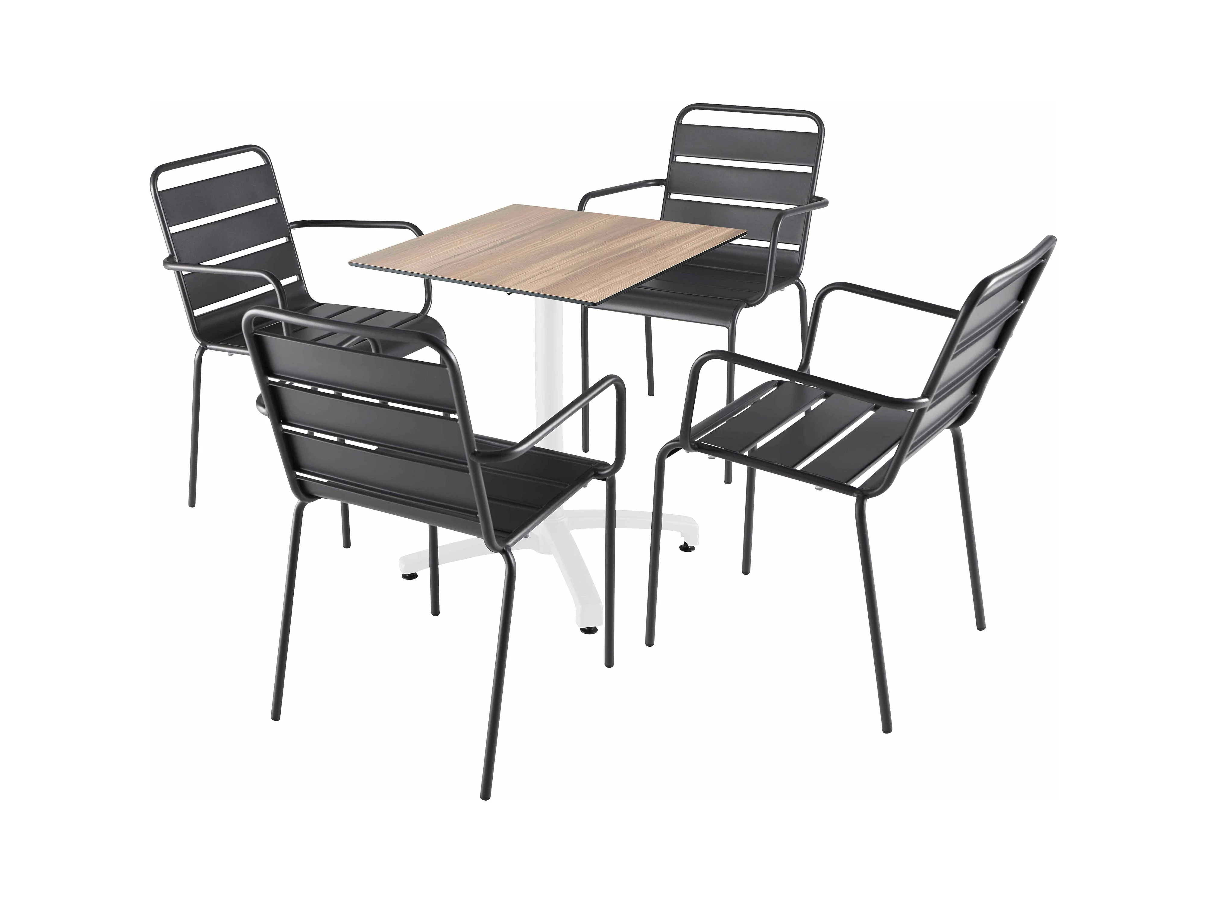 Liggende tafel van leisteenlaminaat, 60x60 cm, en 4 grijze stoelen