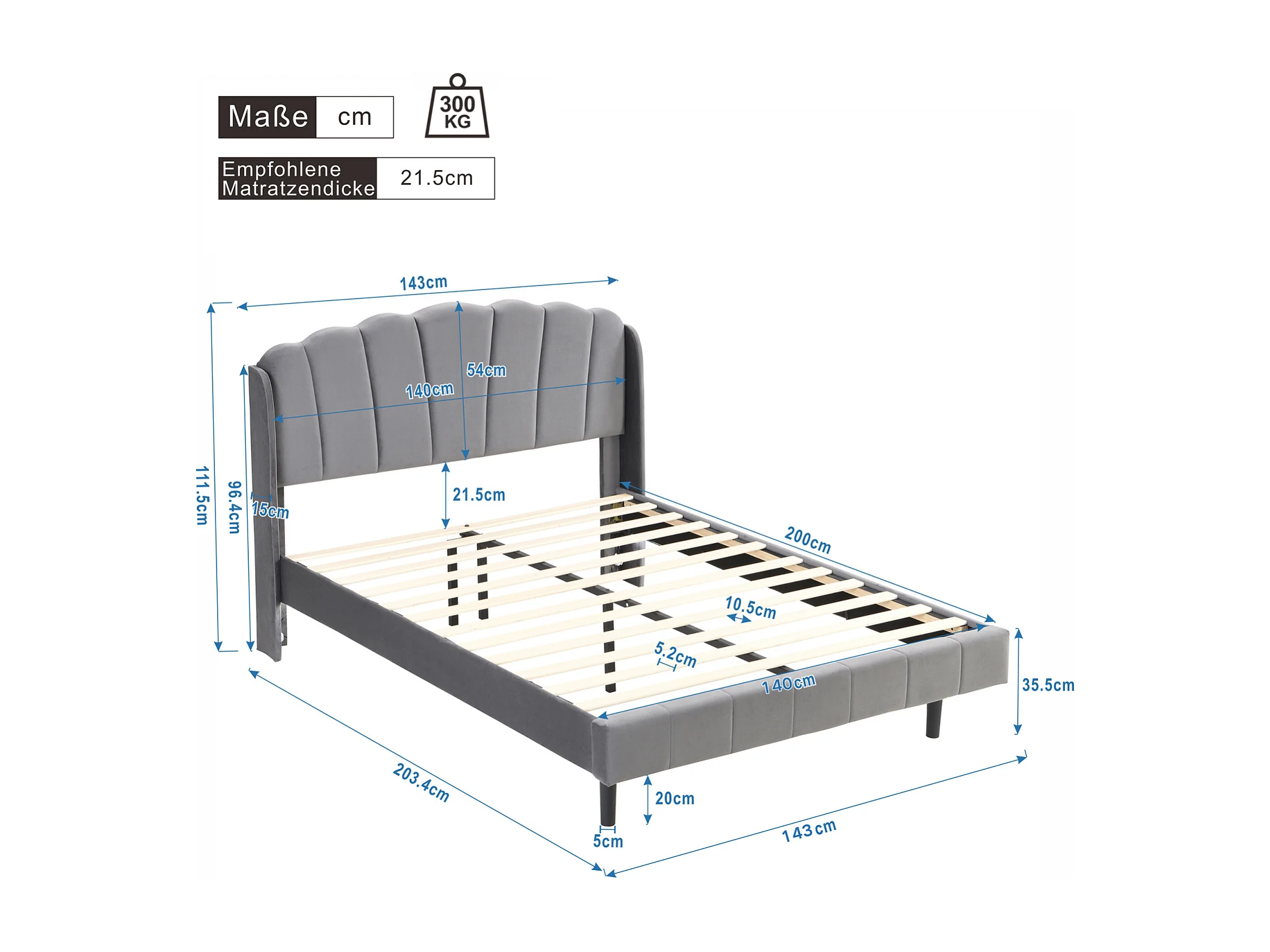 Gestoffeerd volwassen bed, met bewegingsgevoelige LED-verlichting, lattenbodem en hoofdbord, grijs 140x200cm