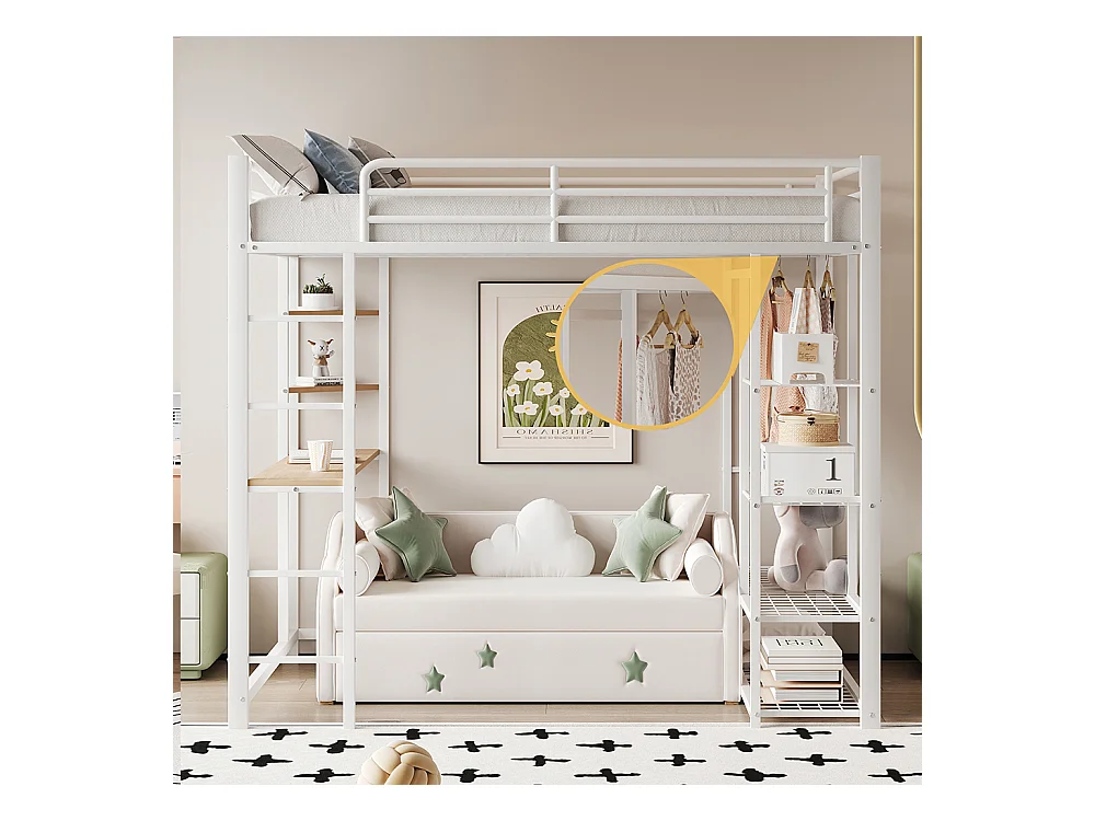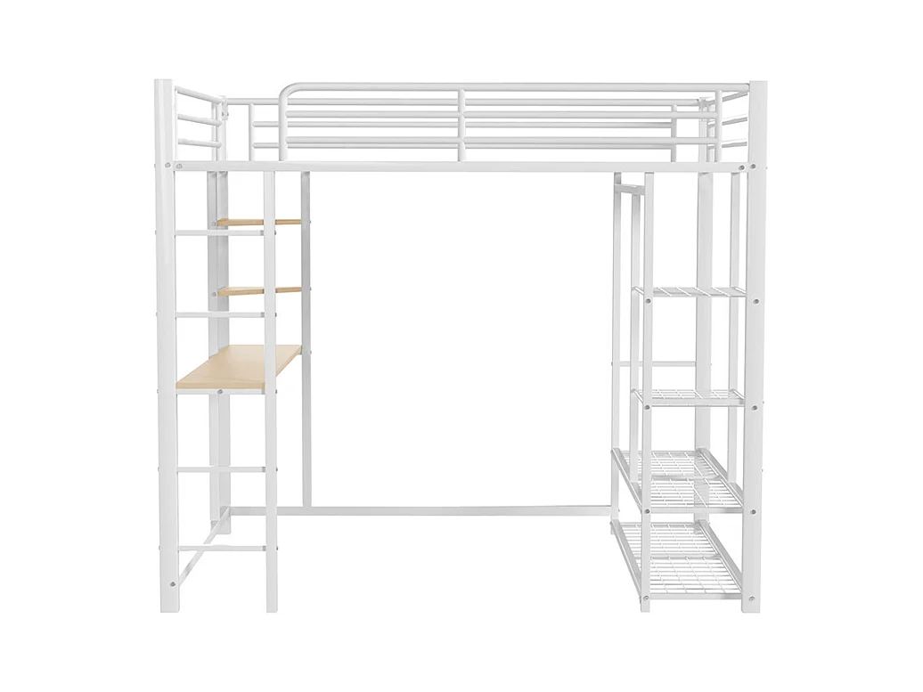 Lit mezzanine en métal avec échelle 140*200 cm, lit double avec cintres simples et compartiments de rangement, blanc