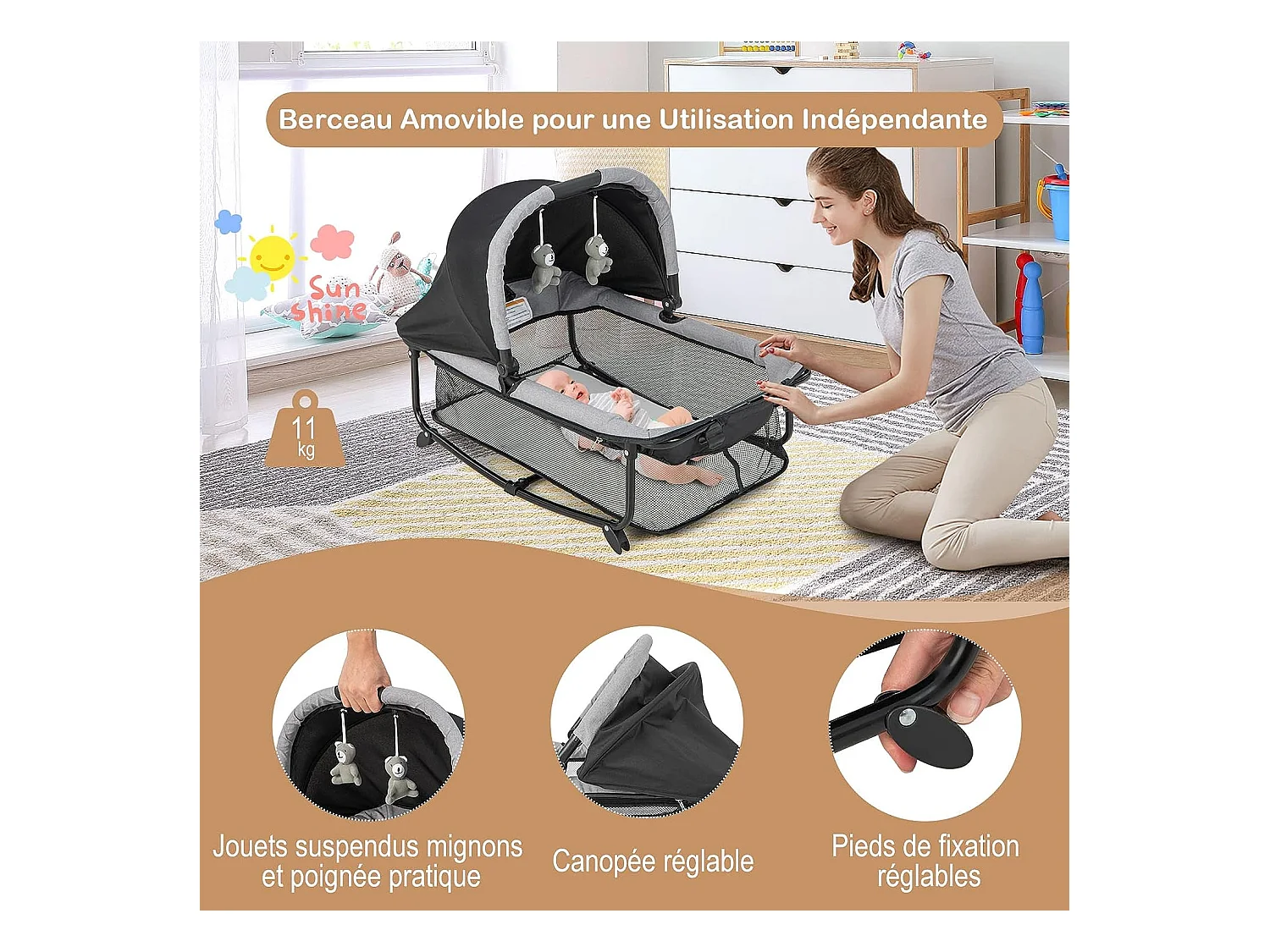 Lit Parapluie Bébé Pliable 5 en 1 Matelas Table à Langer en Forme U avec Auvent Réglable,2 Jouets, Entrée Latérale Noir