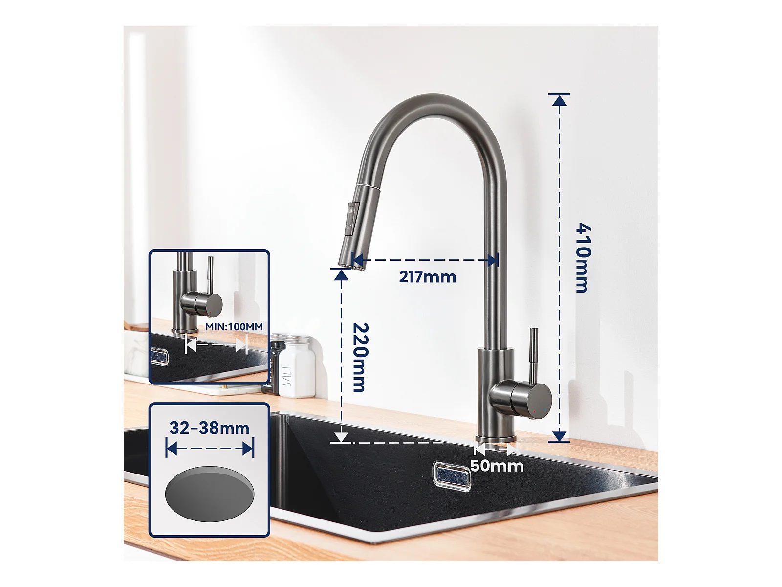 AURALUM MAX Keukenkraan met Uittrekbare Handdouche 2 Jets Draaibare Messing Wastafelmengkraan 360° Koud/Warm Water Kranen, Granietgrijs