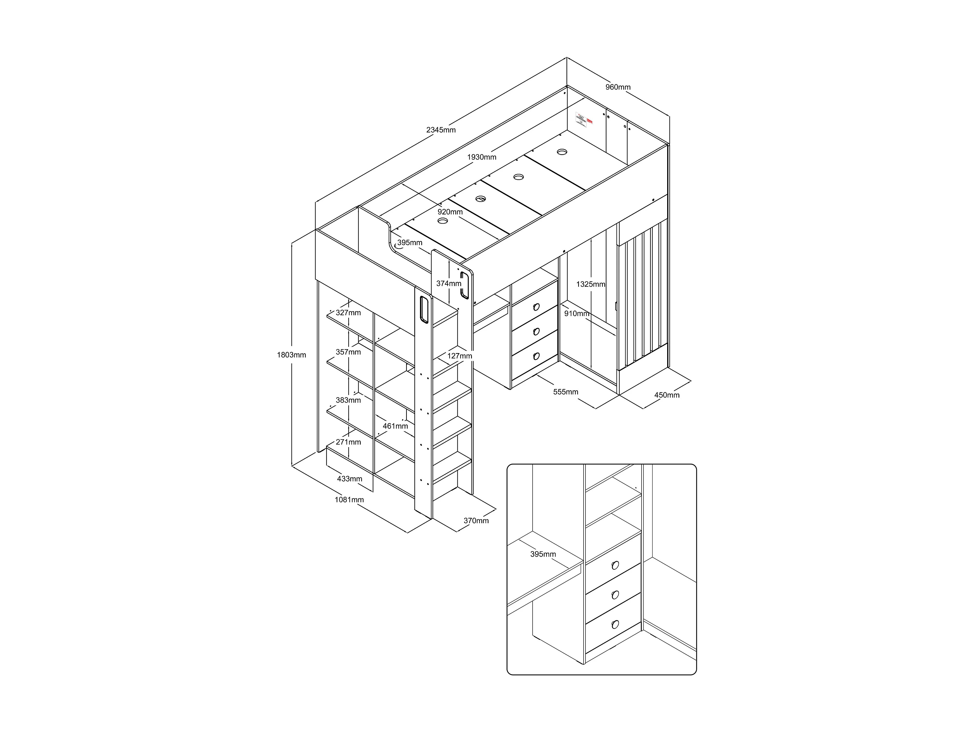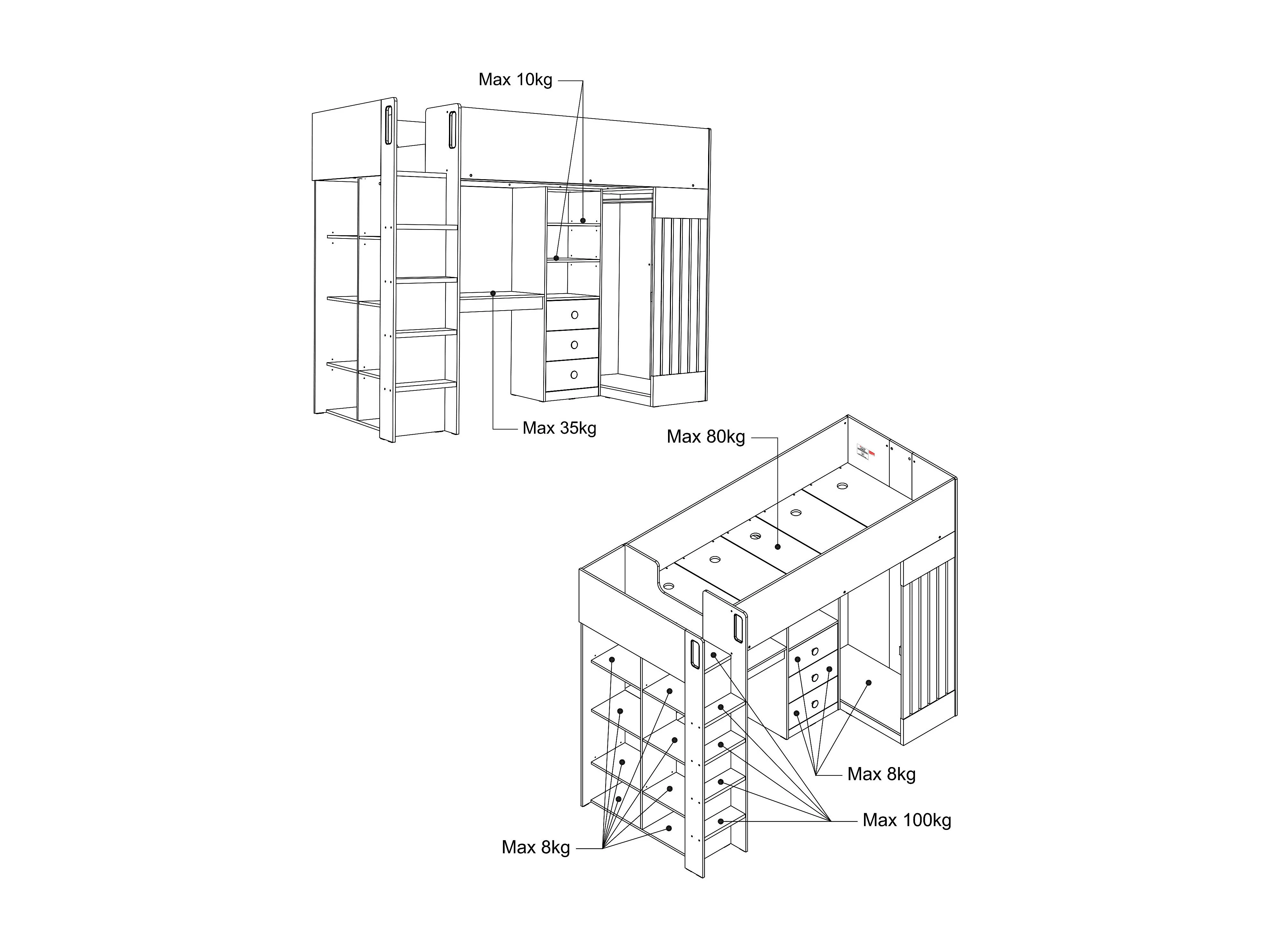 Hoogslaper 90 x 190 cm met bureau en hangkast - Kleur: wit en naturel - LORINTI