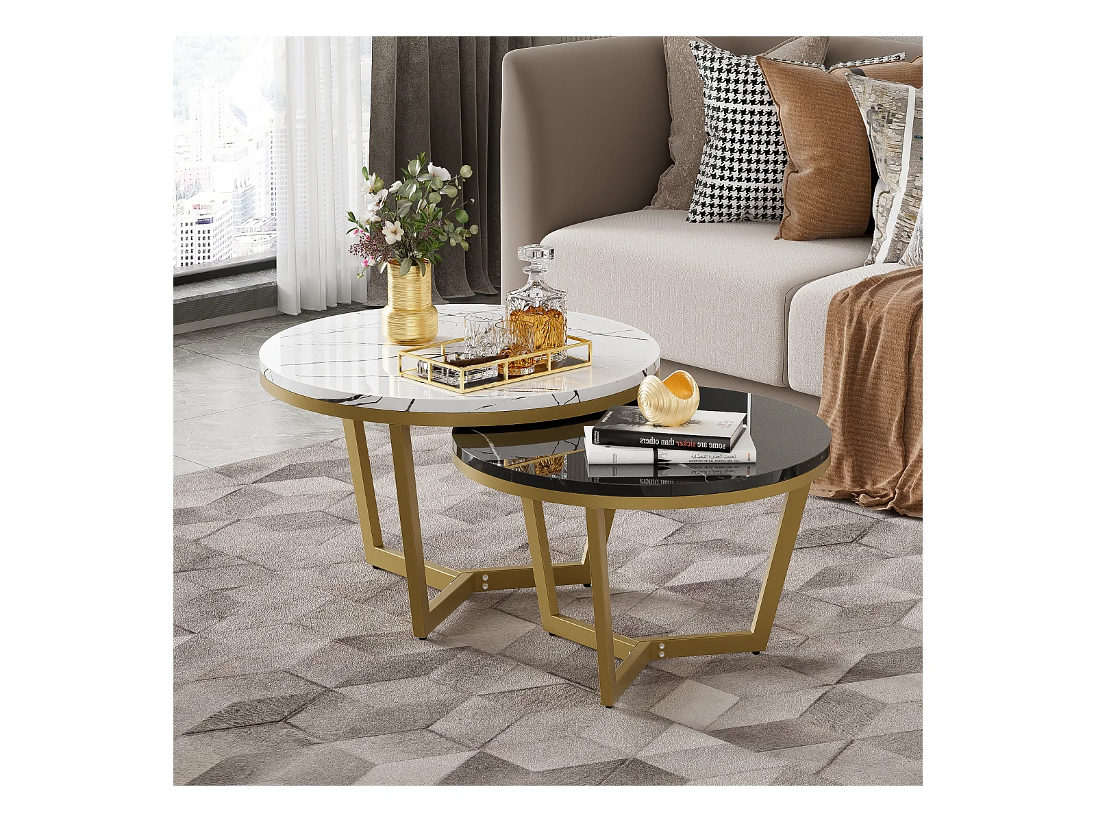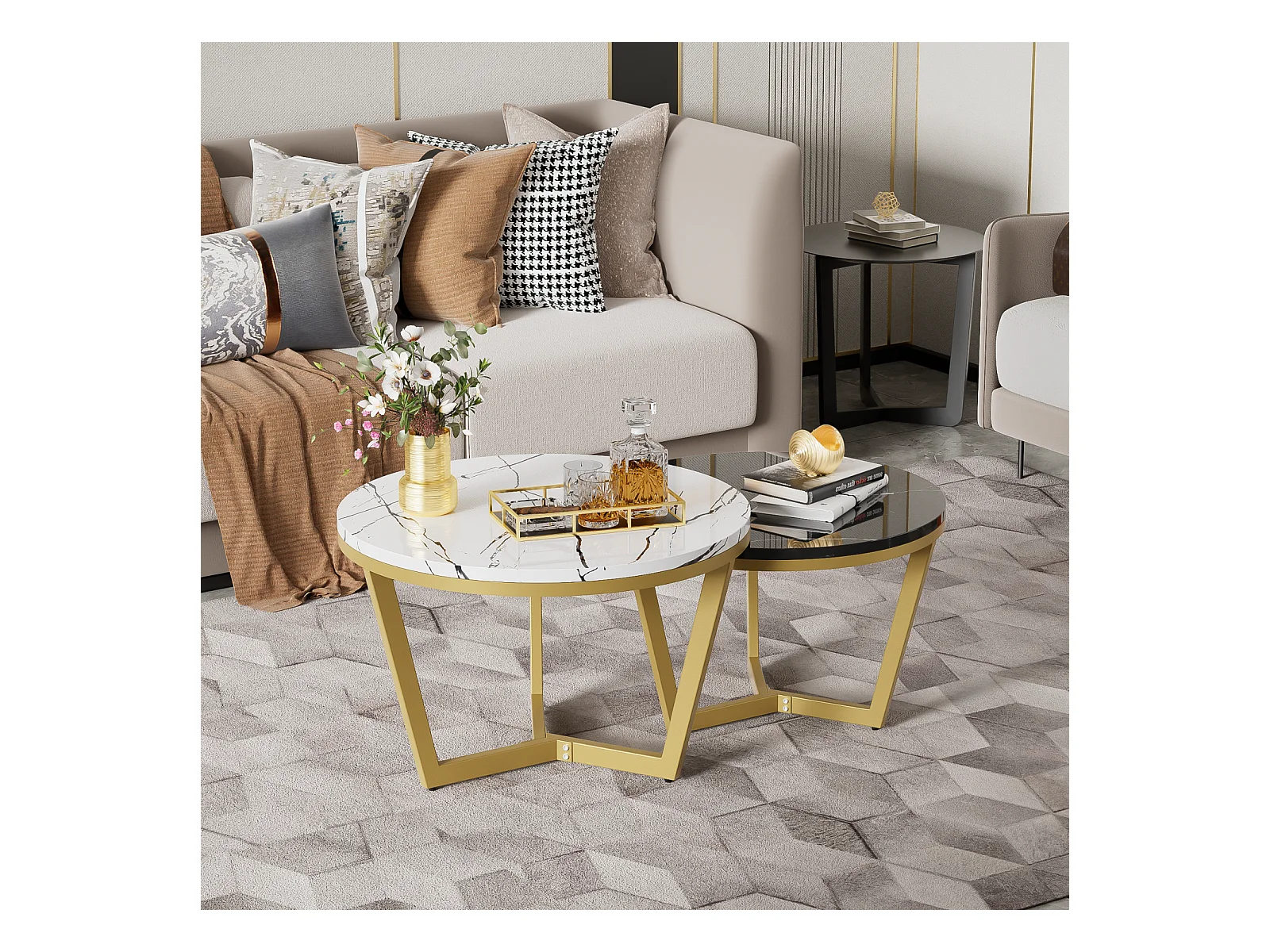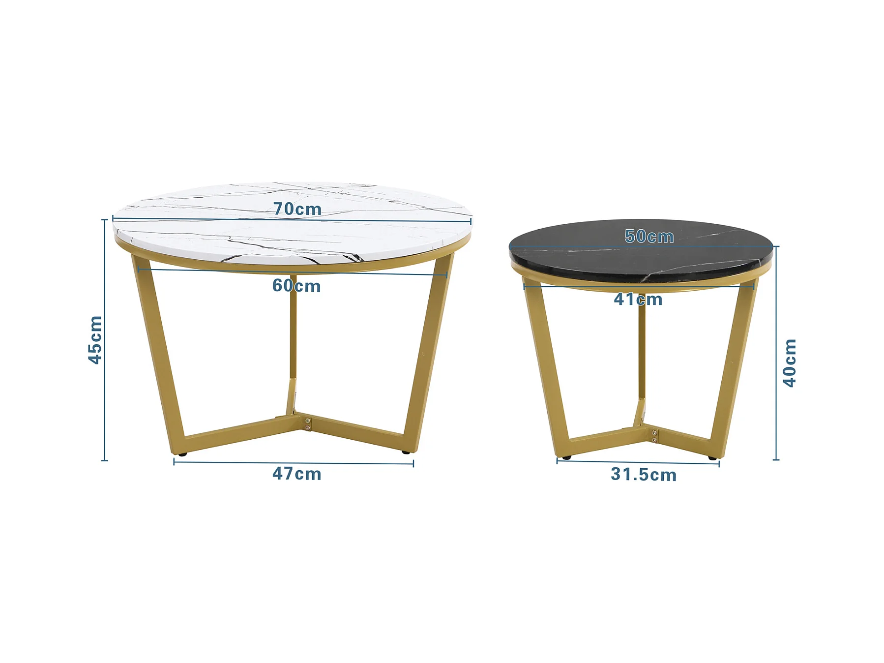 Set van 2 in elkaar passende salontafels, elegante modulaire, marmeren effect bijzettafel, gouden metalen structuur, MDF, wit en zwart
