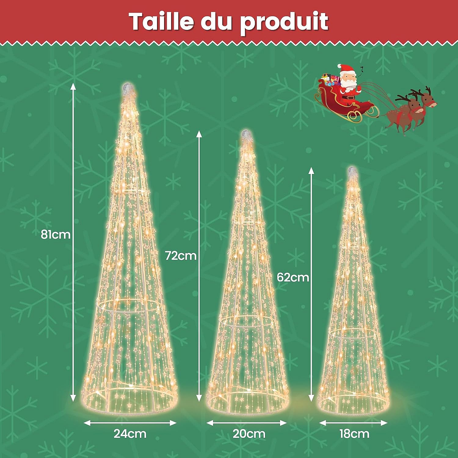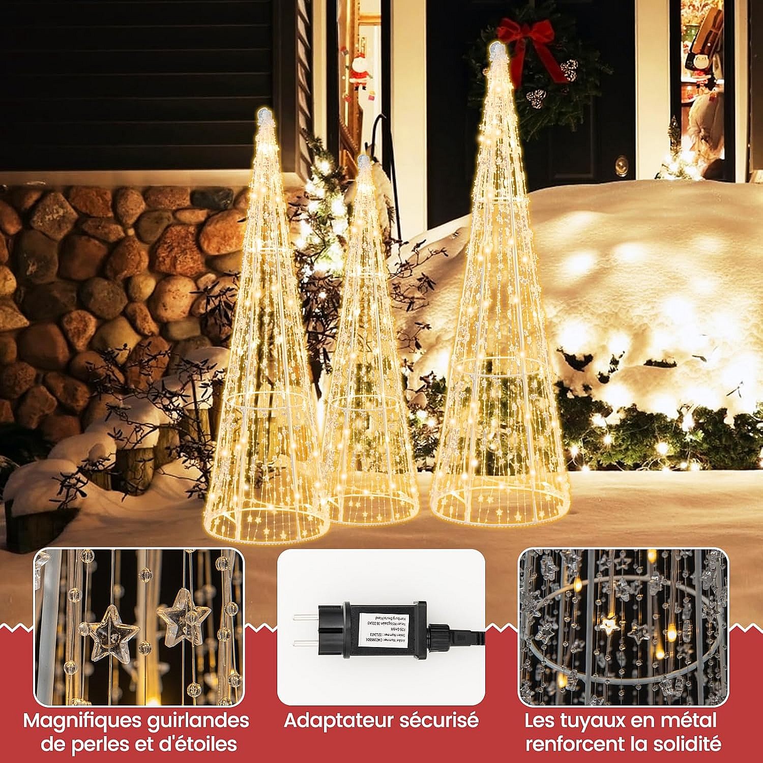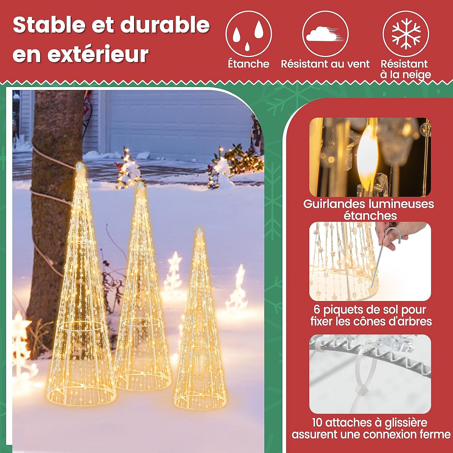 Lot de 3 cônes de noël pré-éclairés avec 90 lumières led blanc chaud