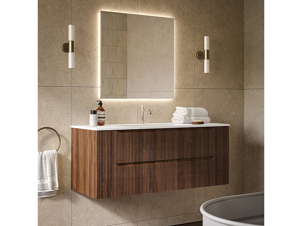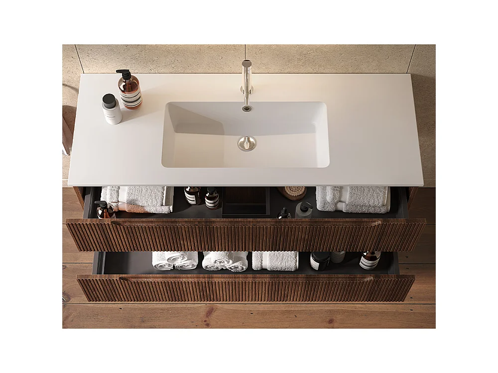 Lynea Badkamerkast Geribbelde Versie, Canaletto Walnootafwerking, 2 Lades En Centrale Wastafel