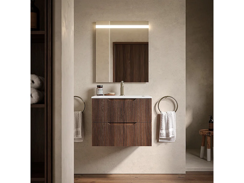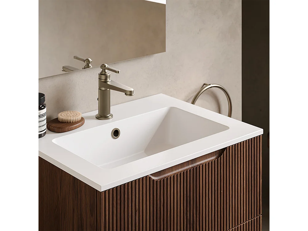 Lynea Badkamerkast Geribbelde Versie, Canaletto Walnootafwerking, 2 Lades En Centrale Wastafel