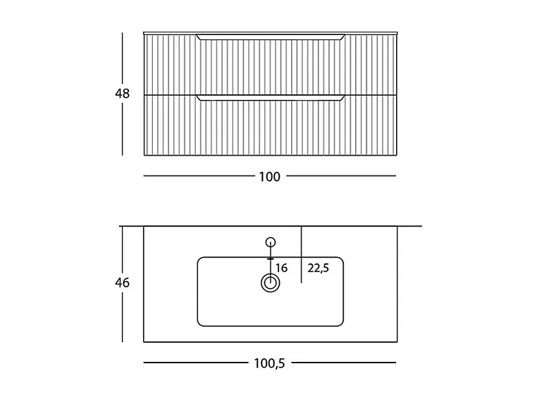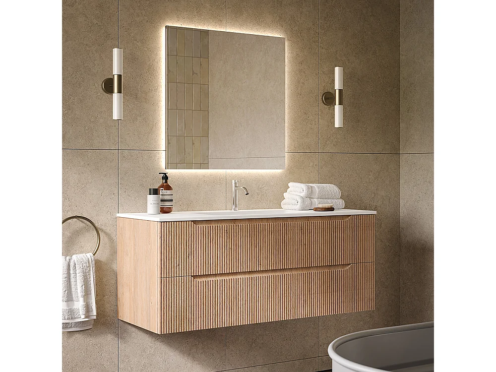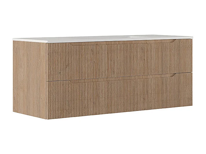 Lynea Badkamerkast Geribbelde Versie, Natuurlijke Eikenhouten Afwerking, 2 Lades En Centrale Wastafel.