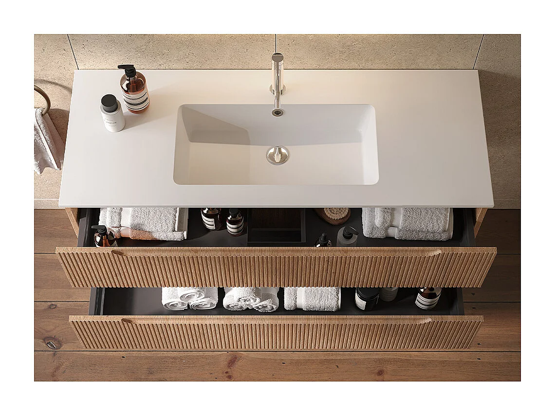 Lynea Badkamerkast Geribbelde Versie, Natuurlijke Eikenhouten Afwerking, 2 Lades En Centrale Wastafel.