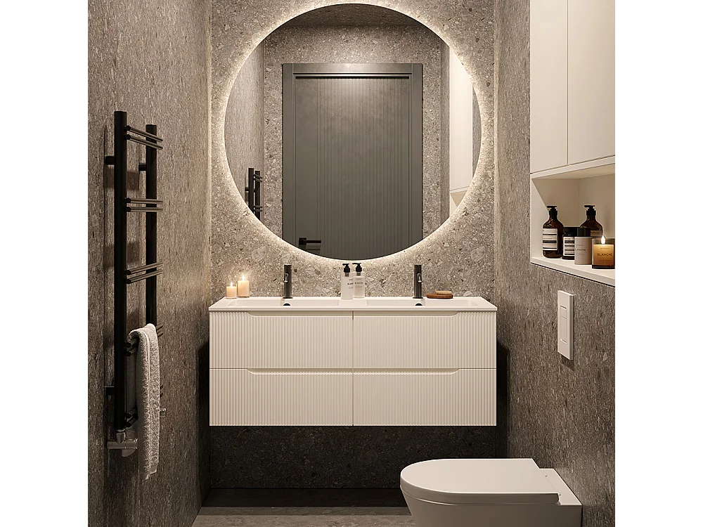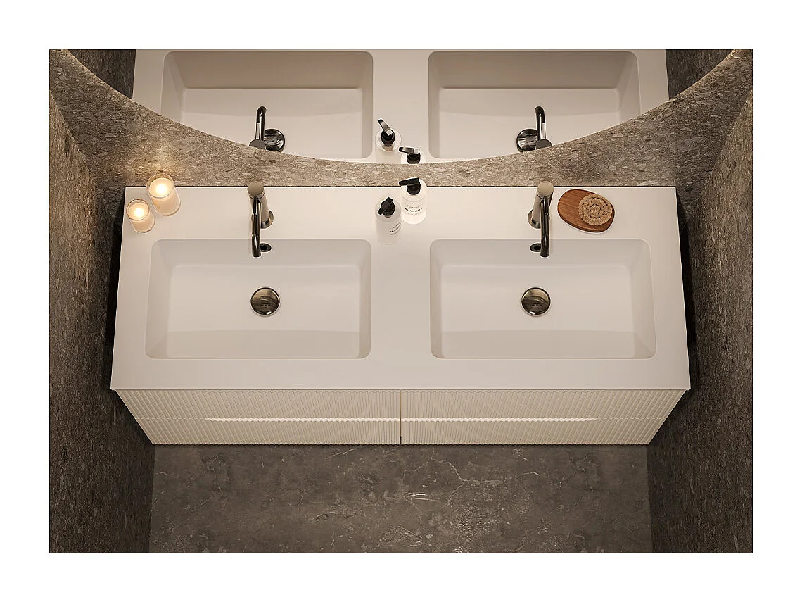Lynea Badkamerkast Geribde Versie, Witte Afwerking, 4 Lades En 2 Wastafels