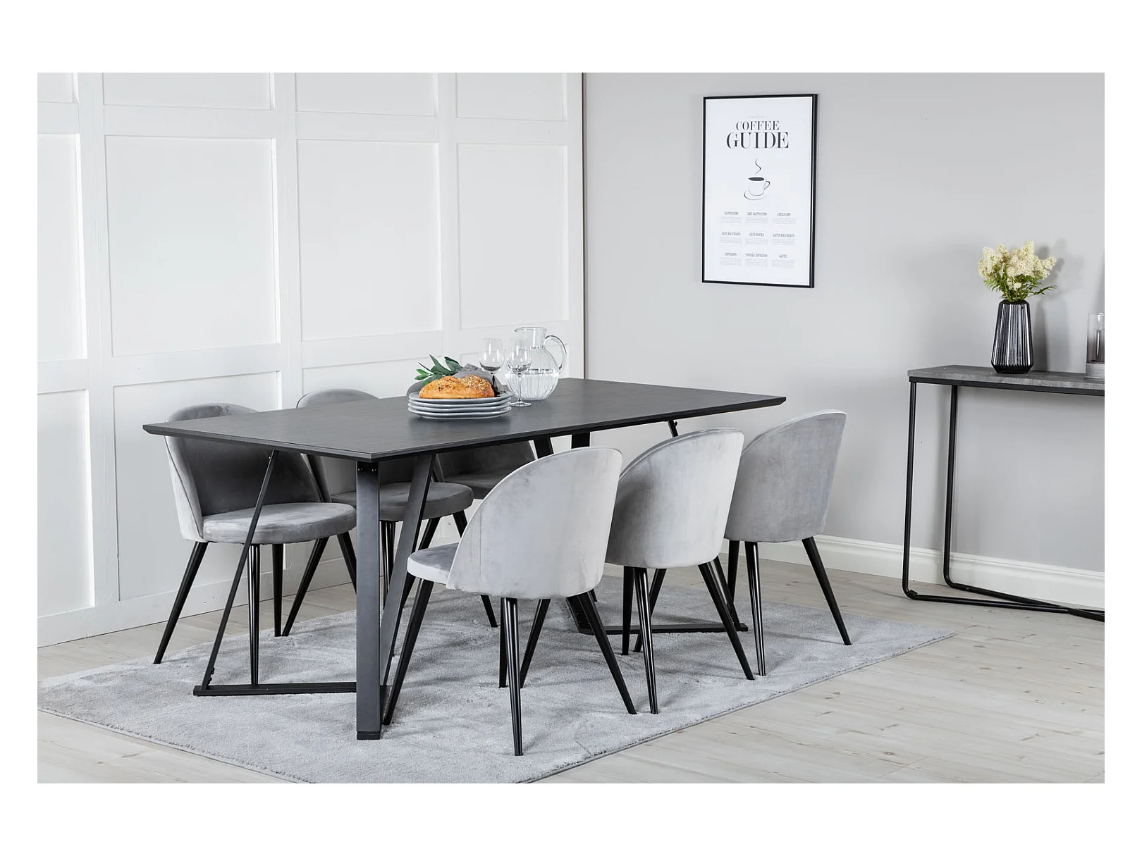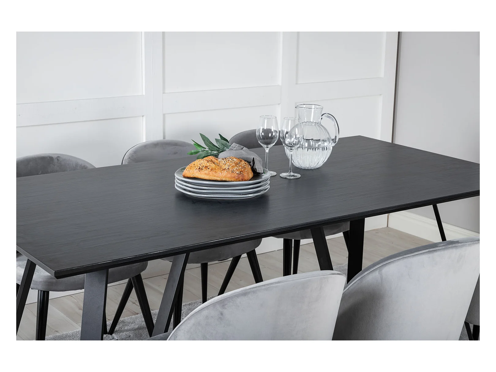 MarinaBLBL eethoek eetkamertafel zwart en 6 Velvet eetkamerstal fluweel lichtgrijs, zwart.
