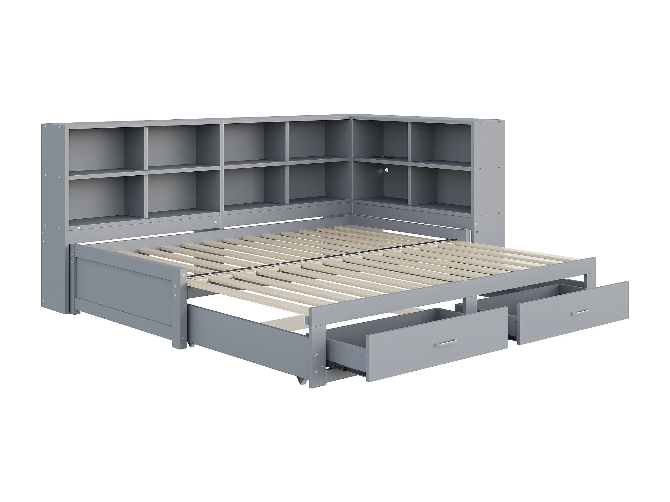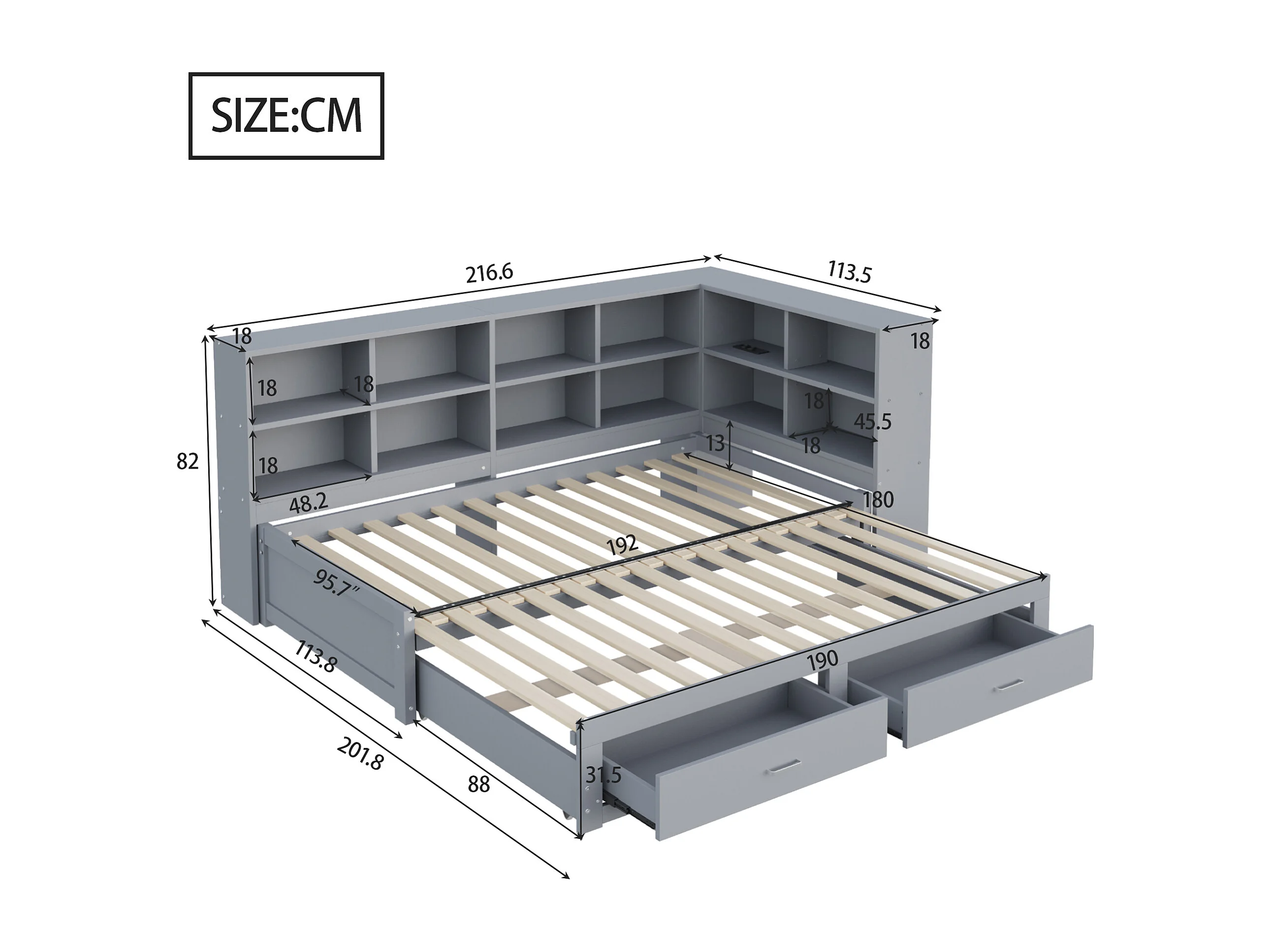 Massief houten slaapbank met lades en opbergruimte, multifunctioneel stopcontact, 90/180\190 cm, grijs (216,6x201,8x82 cm)