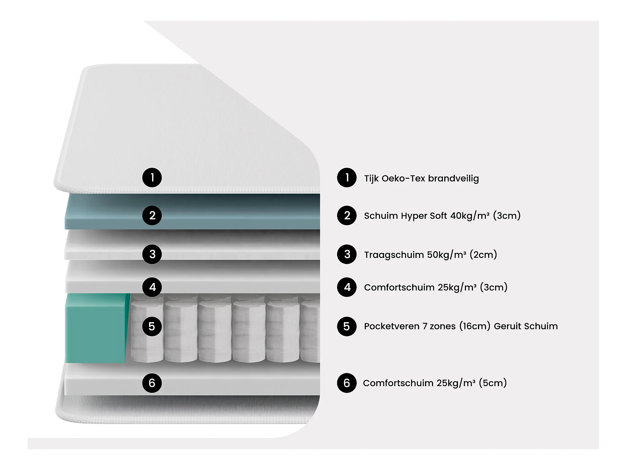 • Pocketveren met 7 comfortzones + hyper soft traagschuim
