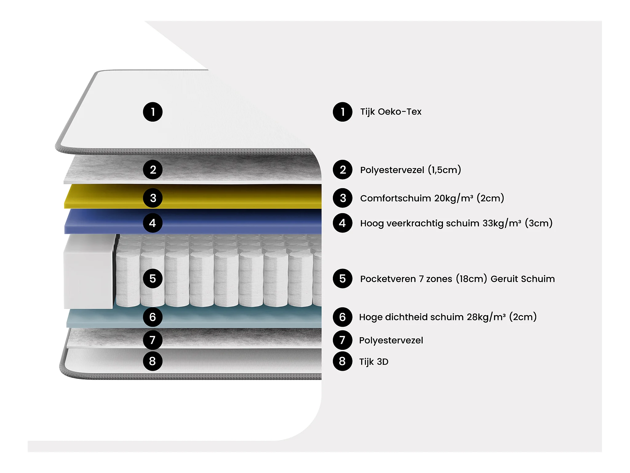 • Een robuuste hoes: De omhulling versterkt de matrasstructuur voor betere duurzaamheid.
