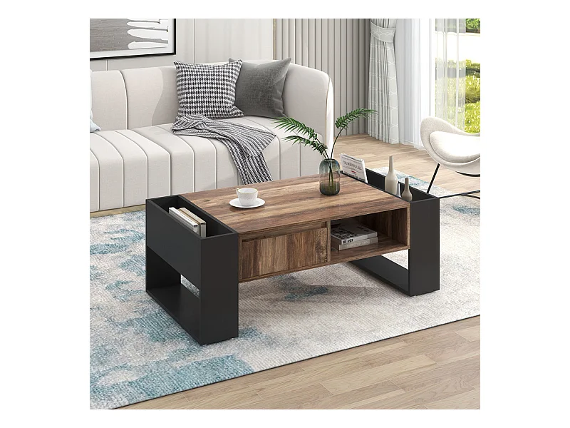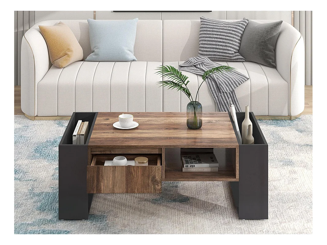 Moderne salontafel met lade en opbergvakken, natuurlijke houtnerf, grijszwart