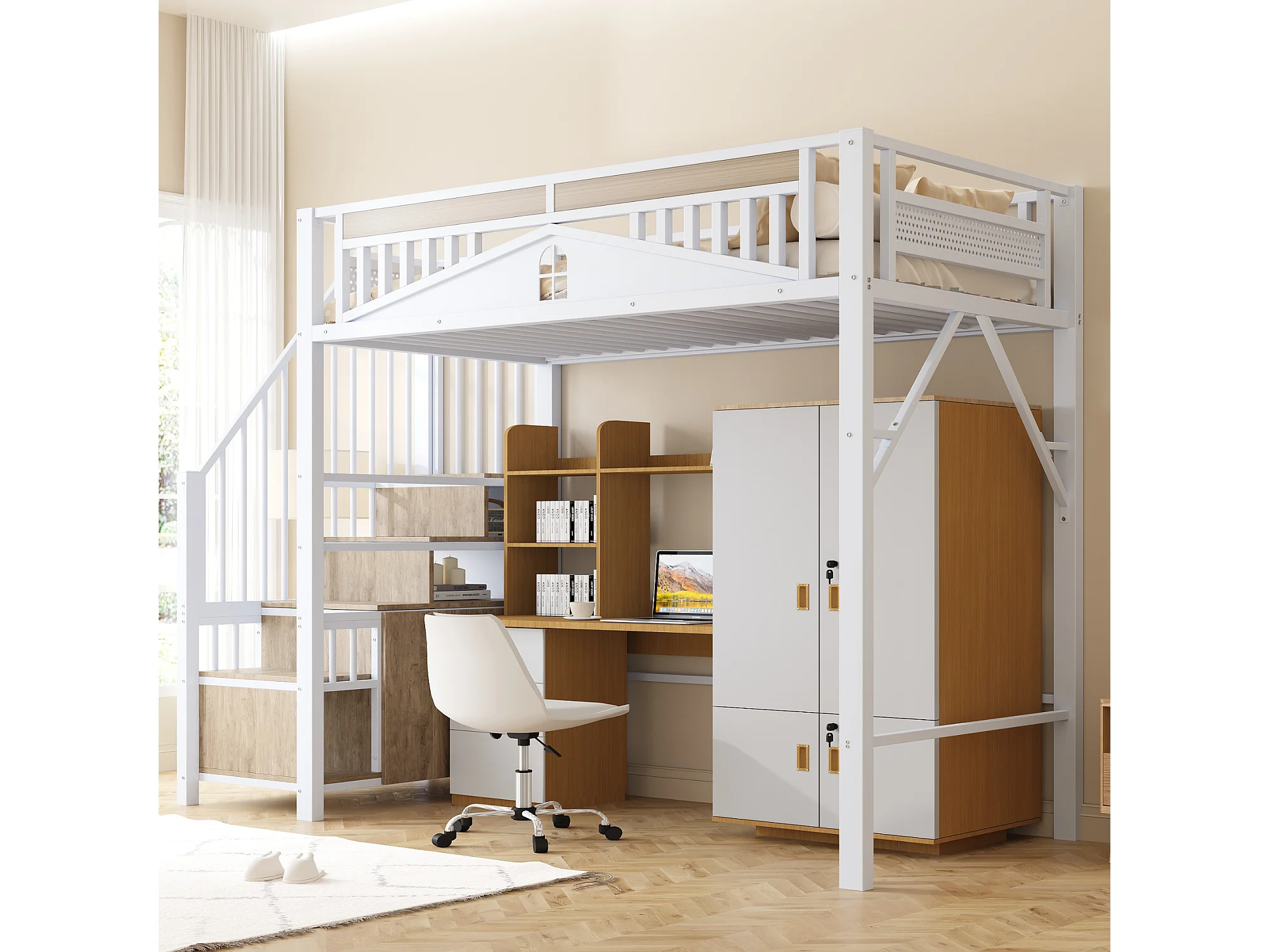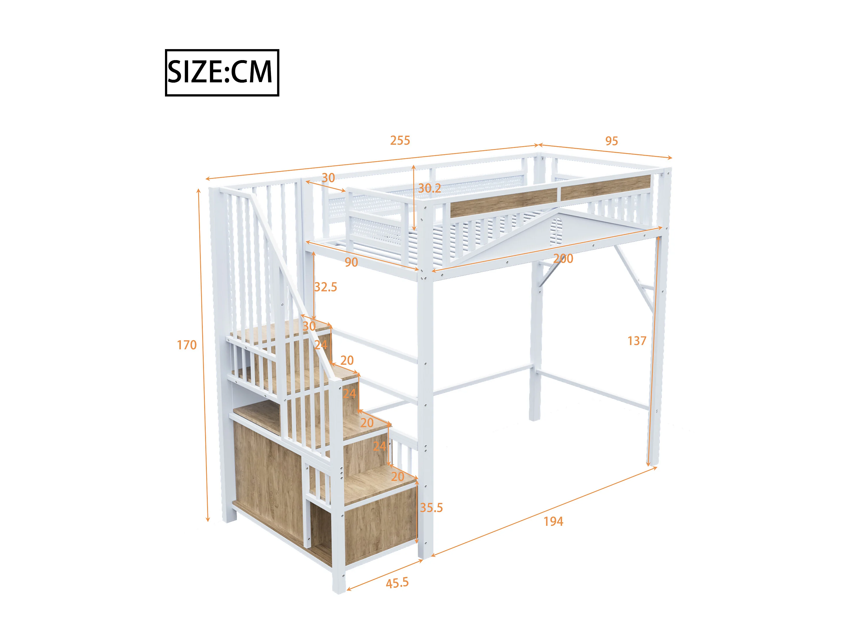 Metalen hoogslaper 90 x 200 cm, versterkte beveiliging met ramen, veilige ladder en geïntegreerde opbergruimte, wit (255x95x170 cm)