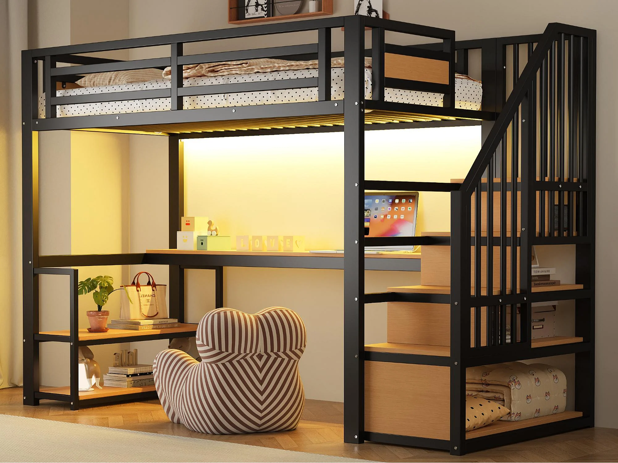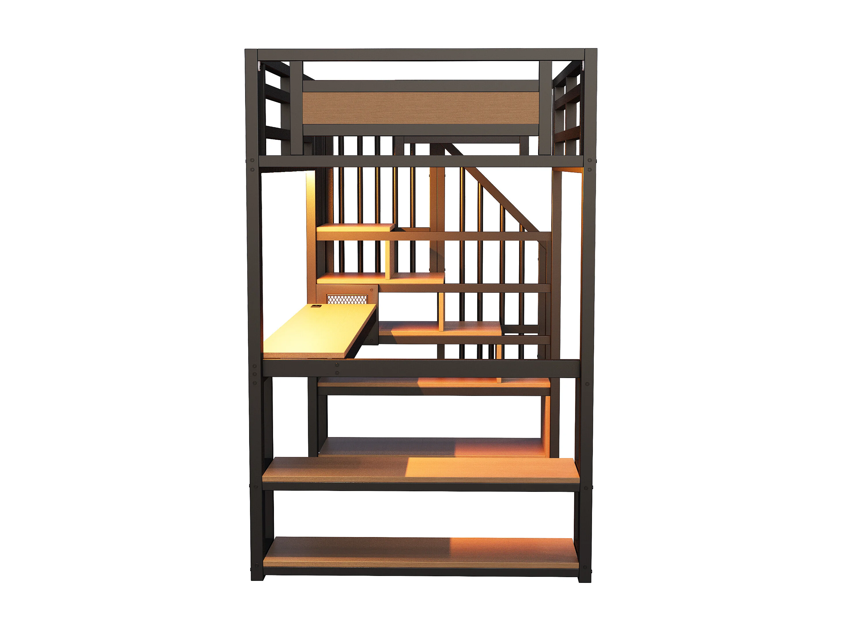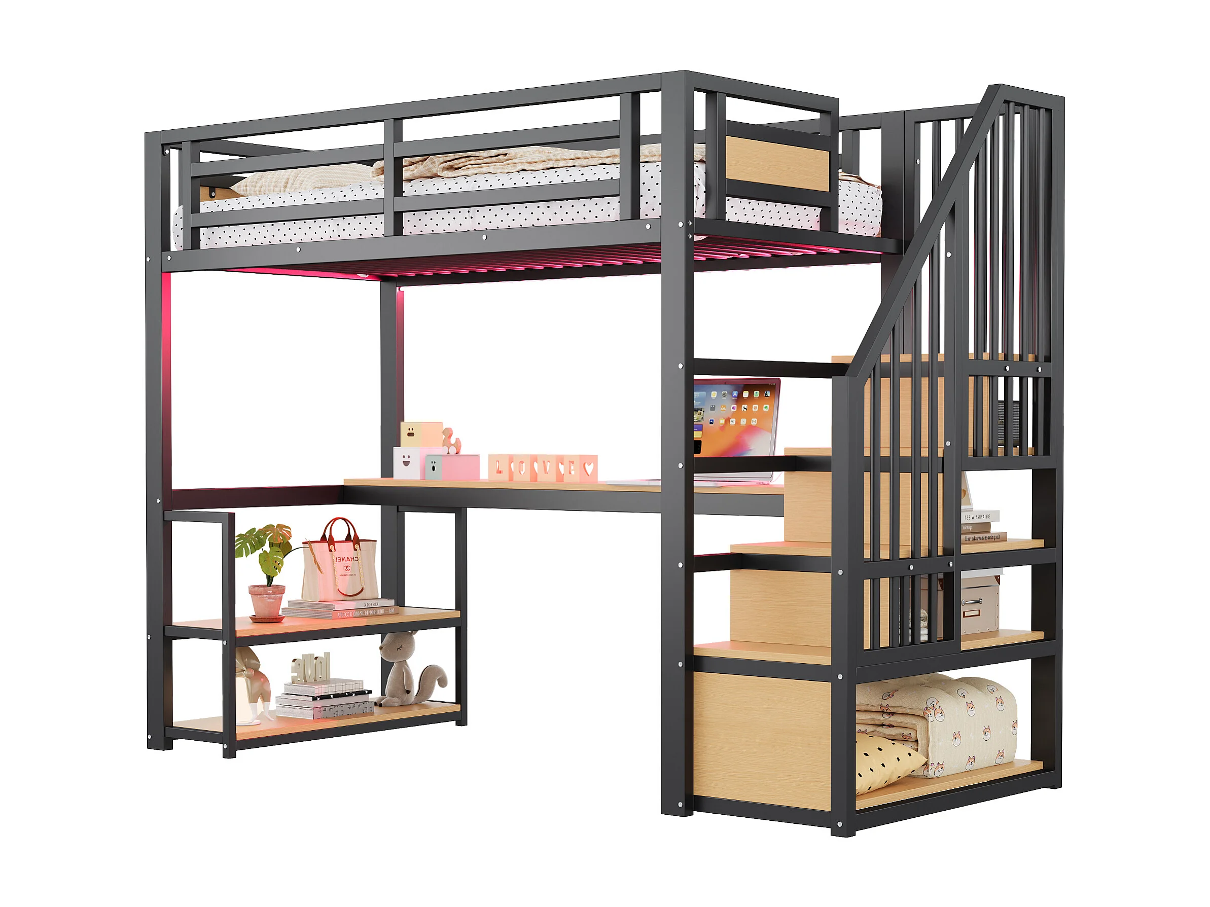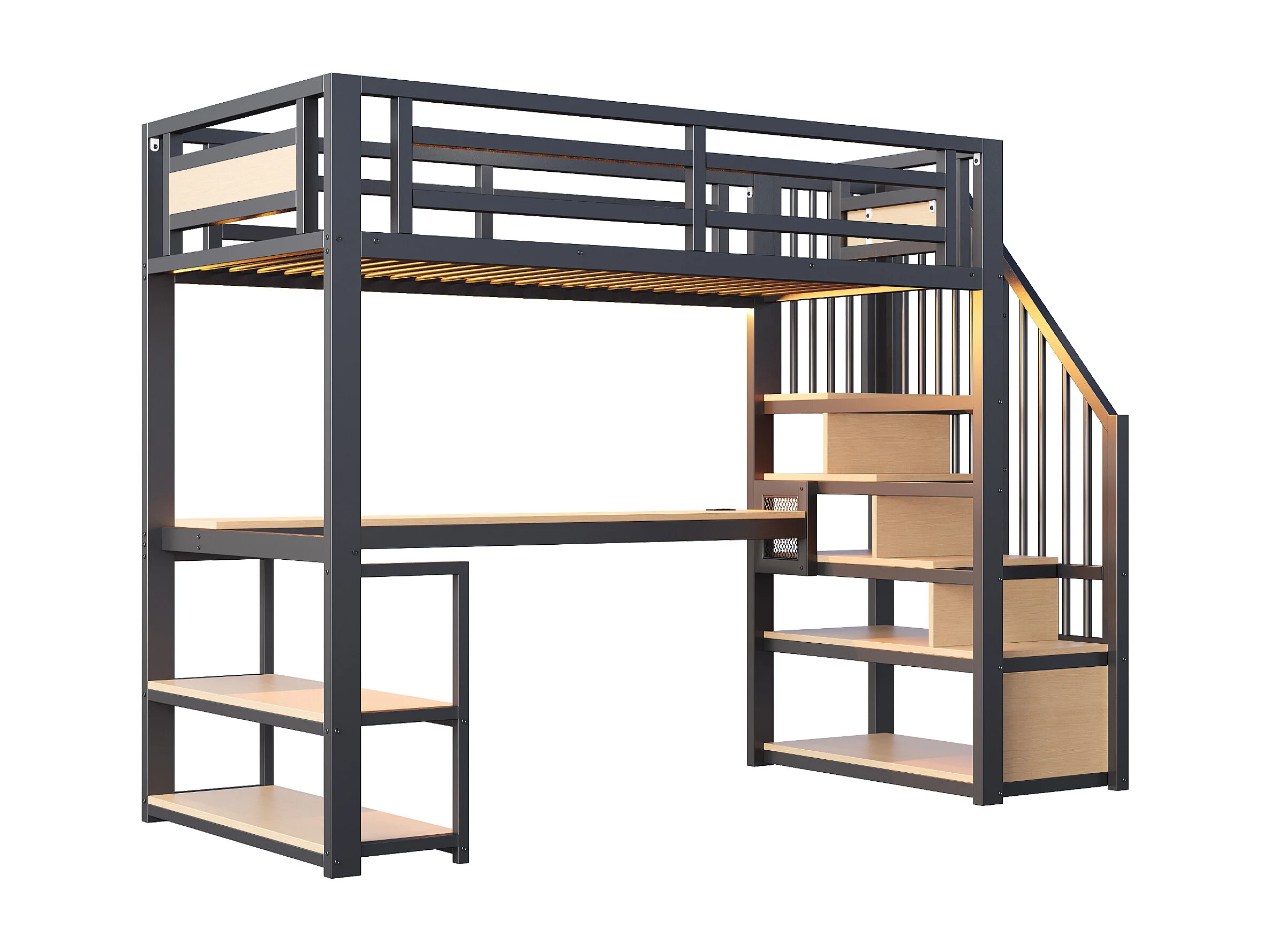 Metalen hoogslaper 90x200 - met LED-verlichting - met stopcontact - met opbergtrap - met planken + tafel - zwart​ (Matras niet inbegrepen)