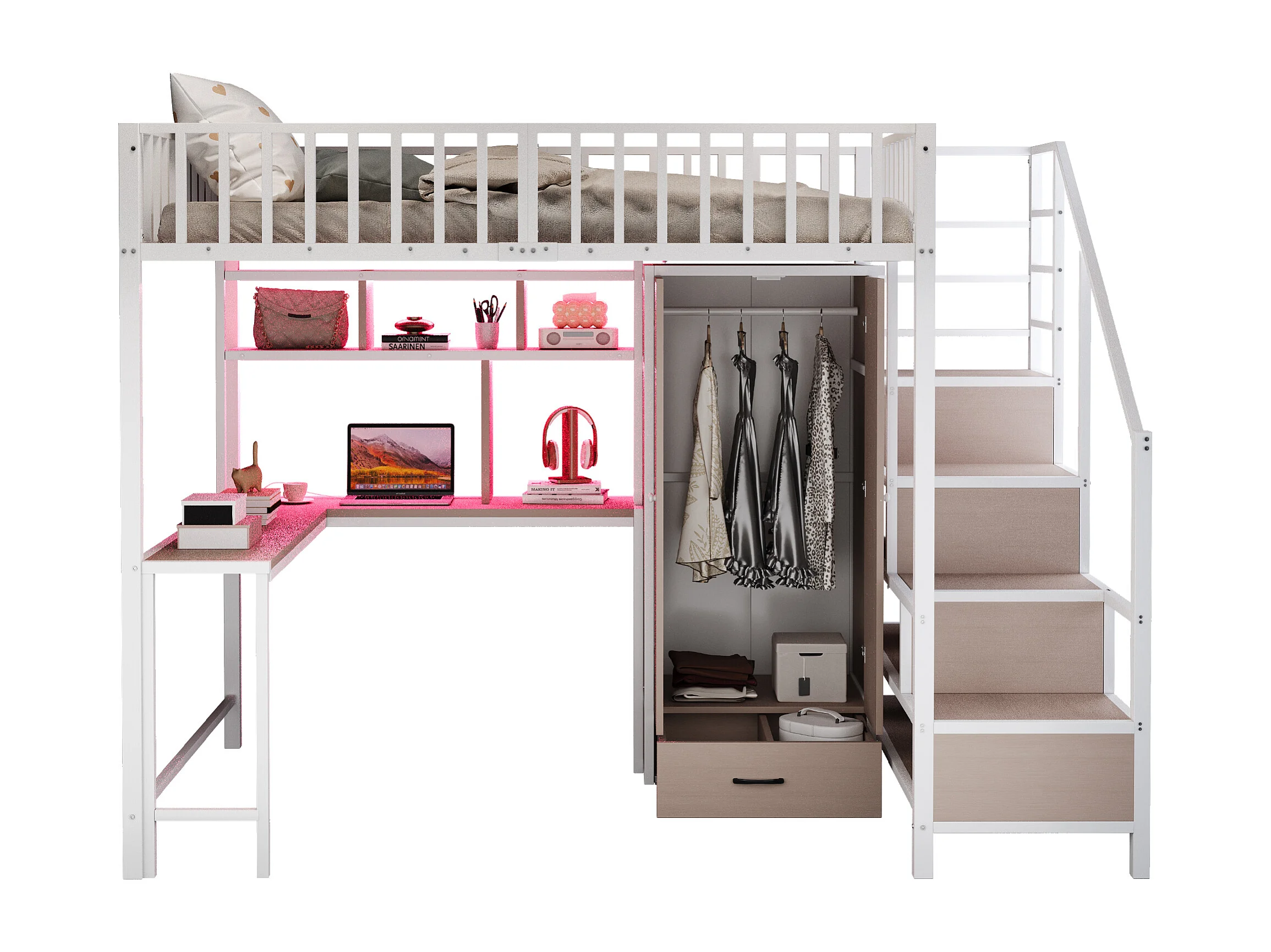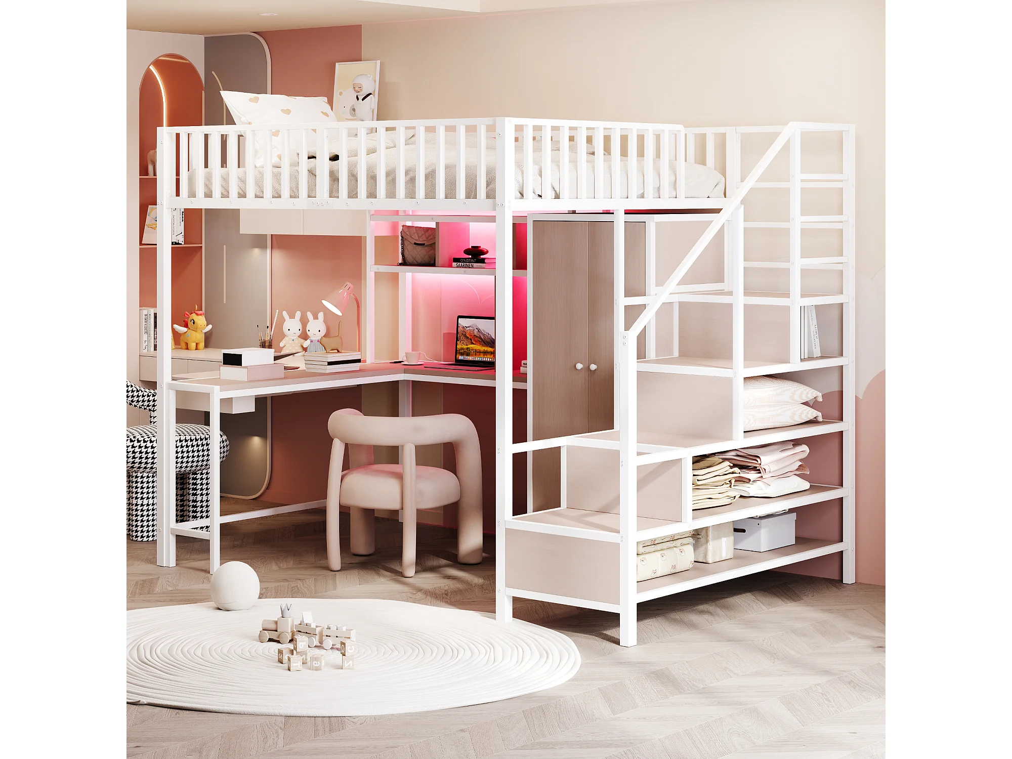 Metalen hoogslaper voor kinderen - 140 x 200 cm - met bureau + plank + kledingkast + lade + opbergtrap + ledverlichting - wit