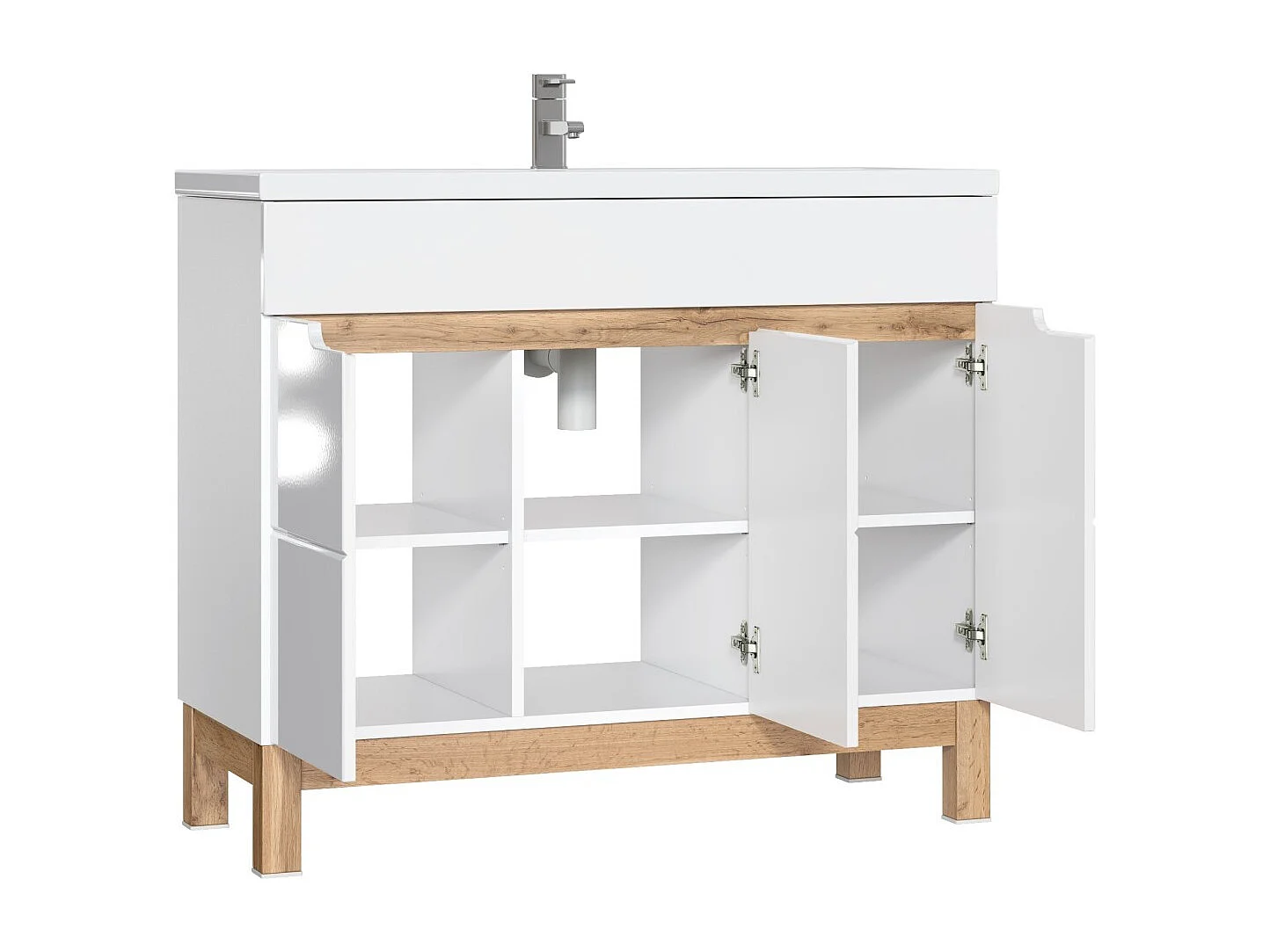 Meubel onder wastafel ERMANO - Licht eiken en hoogglans wit - 100x84 cm - 3 deuren - Om te plaatsen
