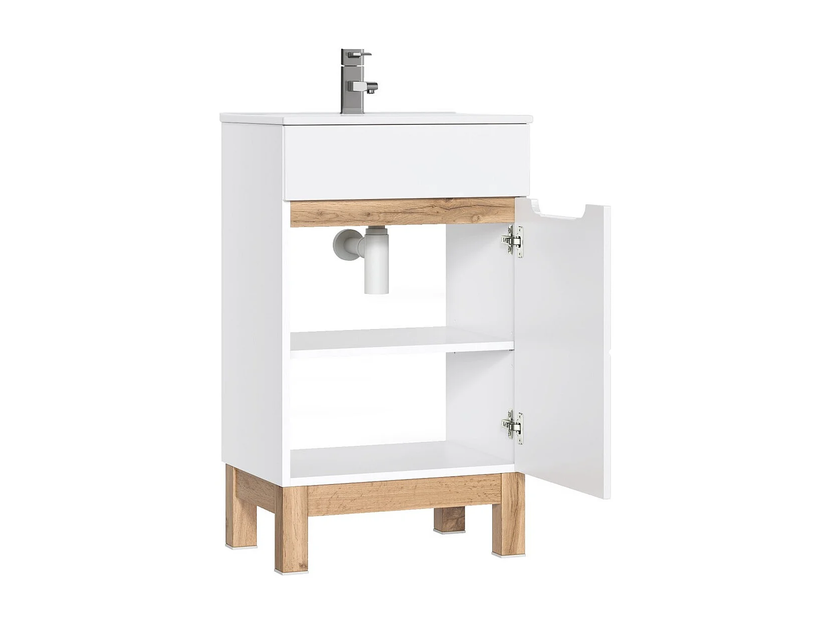 Meubel onder wastafel ERMANO - Licht eiken en hoogglans wit - 50x84 cm - 1 deur - Op poten