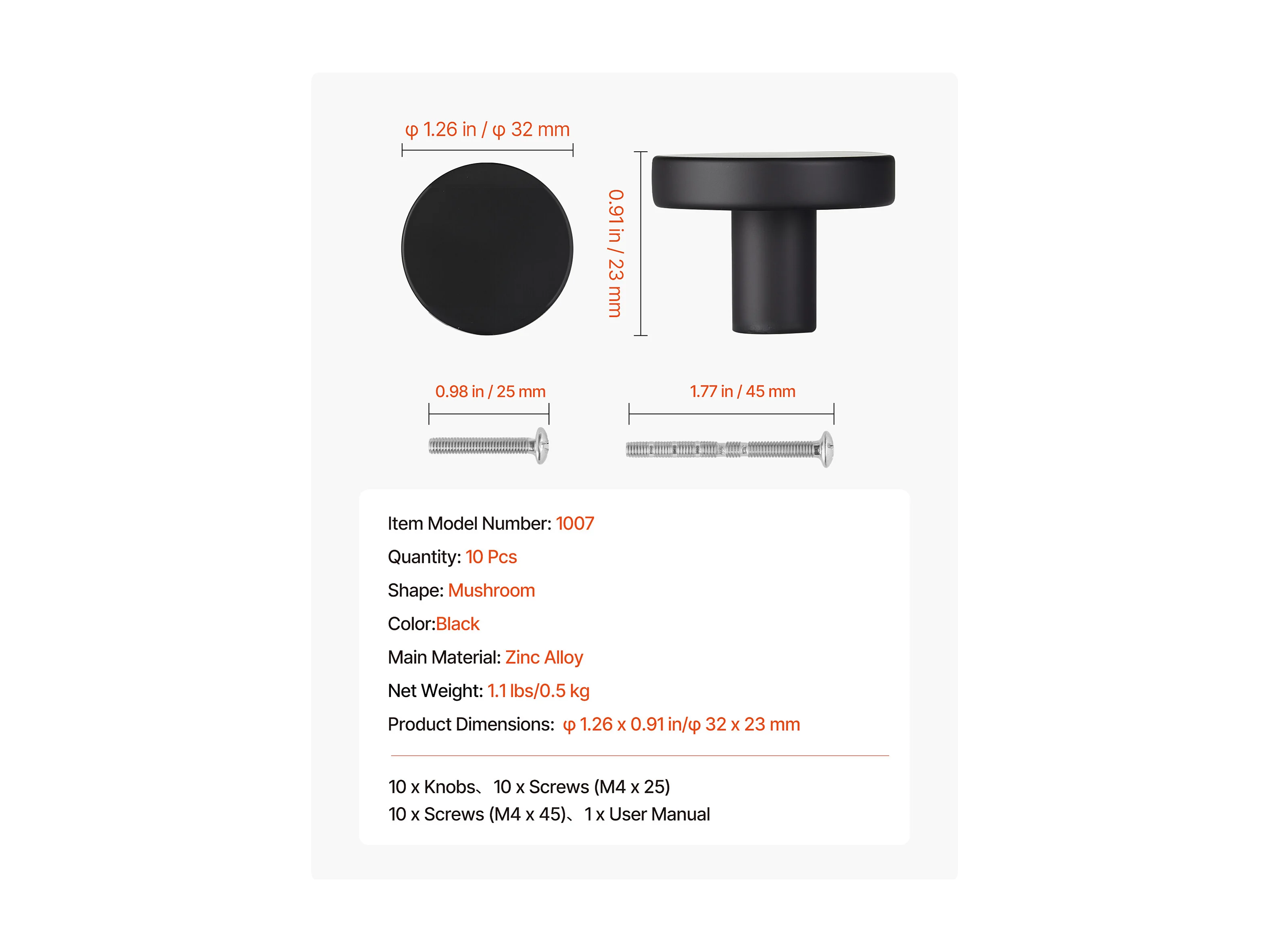 Meubelknoop SucceBuy, Set van 10, Kastknop, 3,2 cm, in Zinklegering, Paddenstoelvorm, met Schroeven, Knop voor Lades, Deuren, Commodes, Zwart