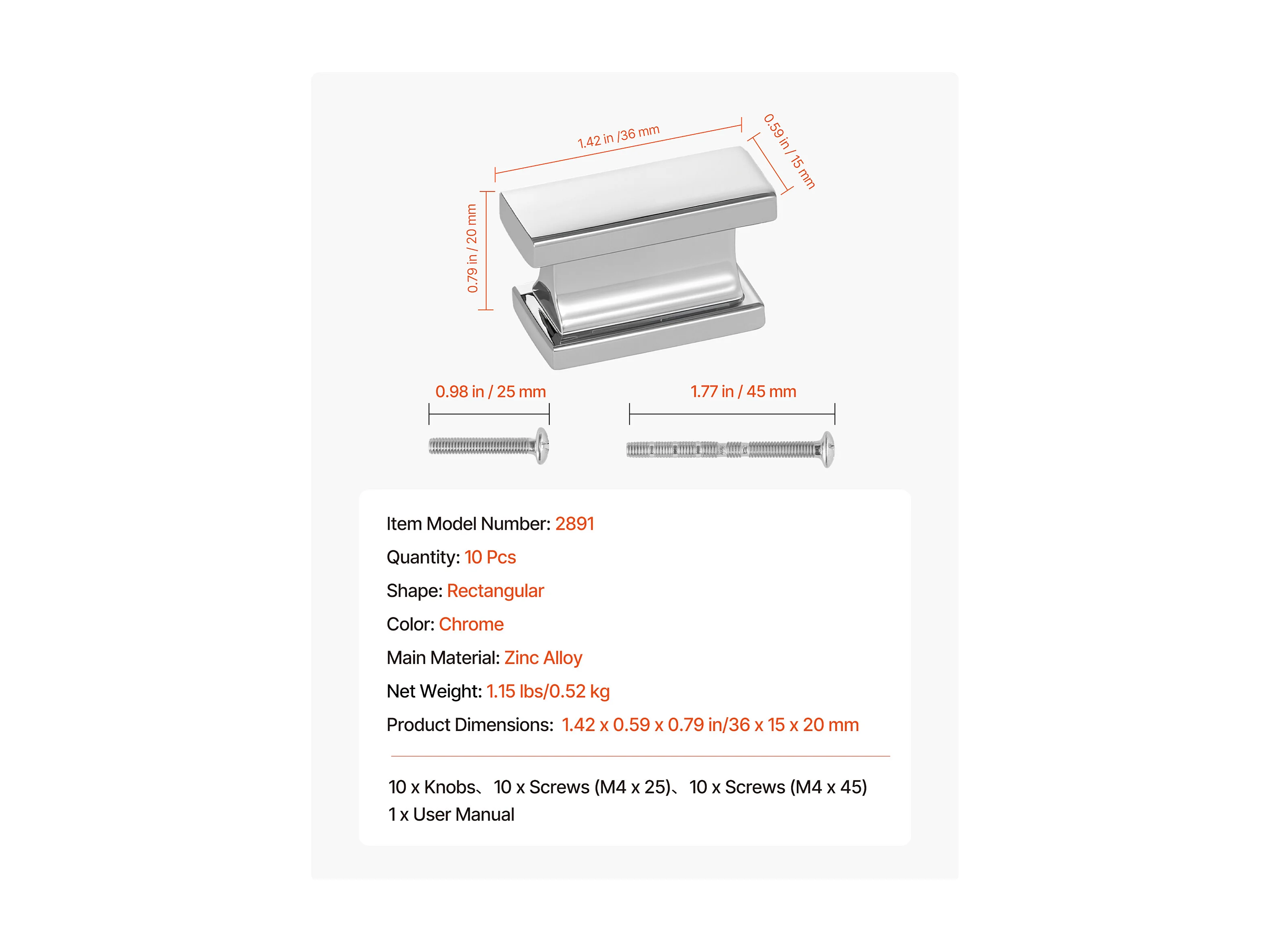 Meubelknoop SucceBuy, Set van 10, Kastknop, 3,6 cm, in Zinklegering, Rechthoekig, met Schroeven, Knop voor Lades, Deuren, Commodes