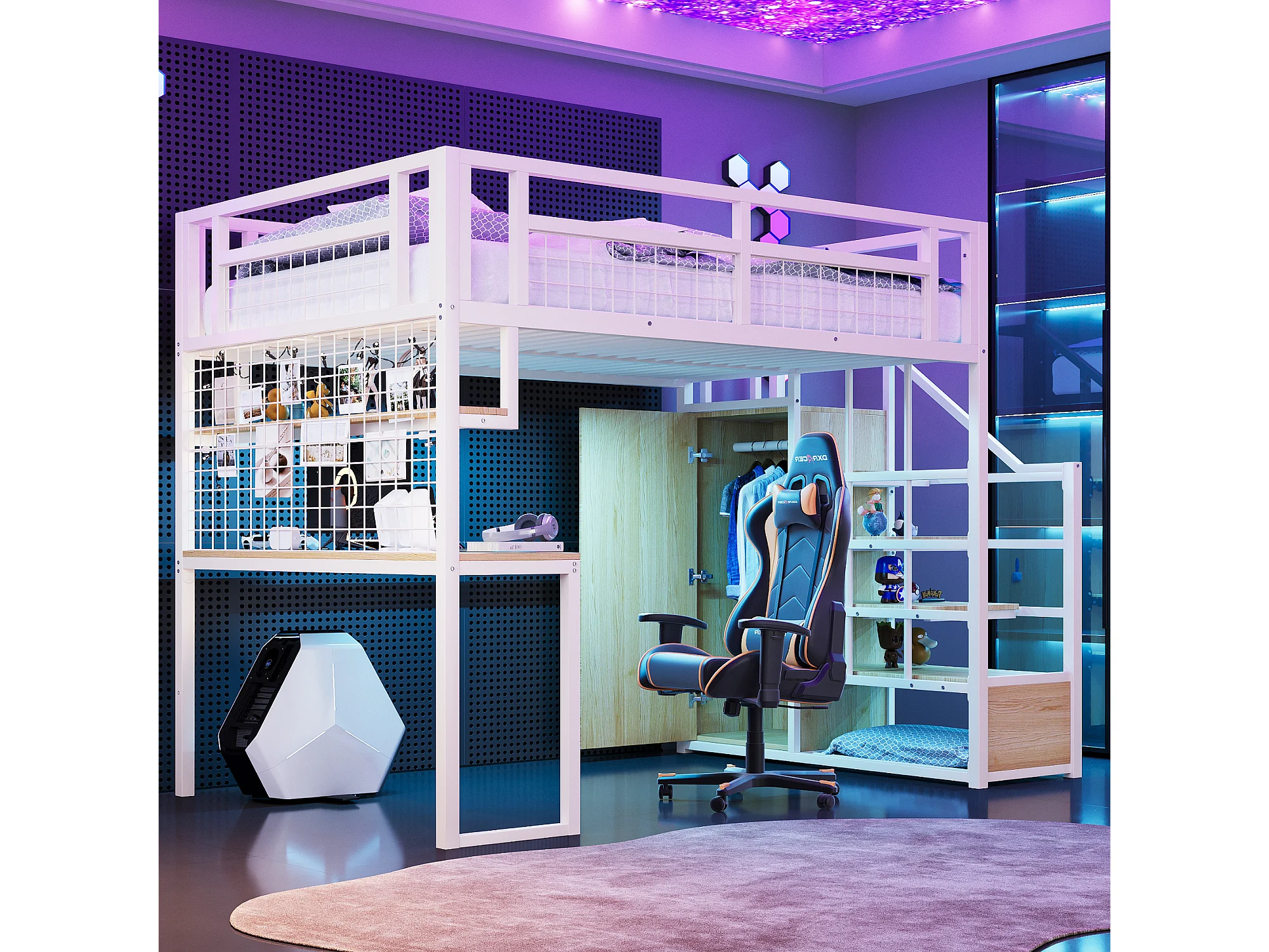 Mezzanine bed 140x200 cm - met LED-verlichting en stopcontacten - met opbergladder - met garderobekast - opbergruimte en bureau - wit