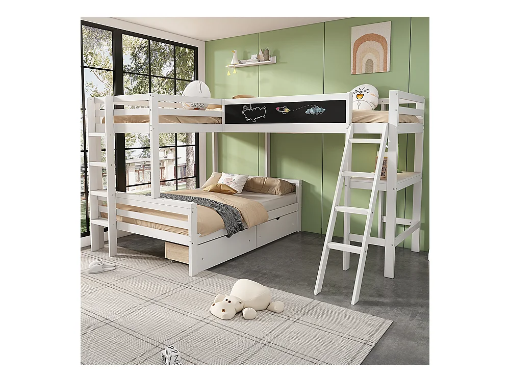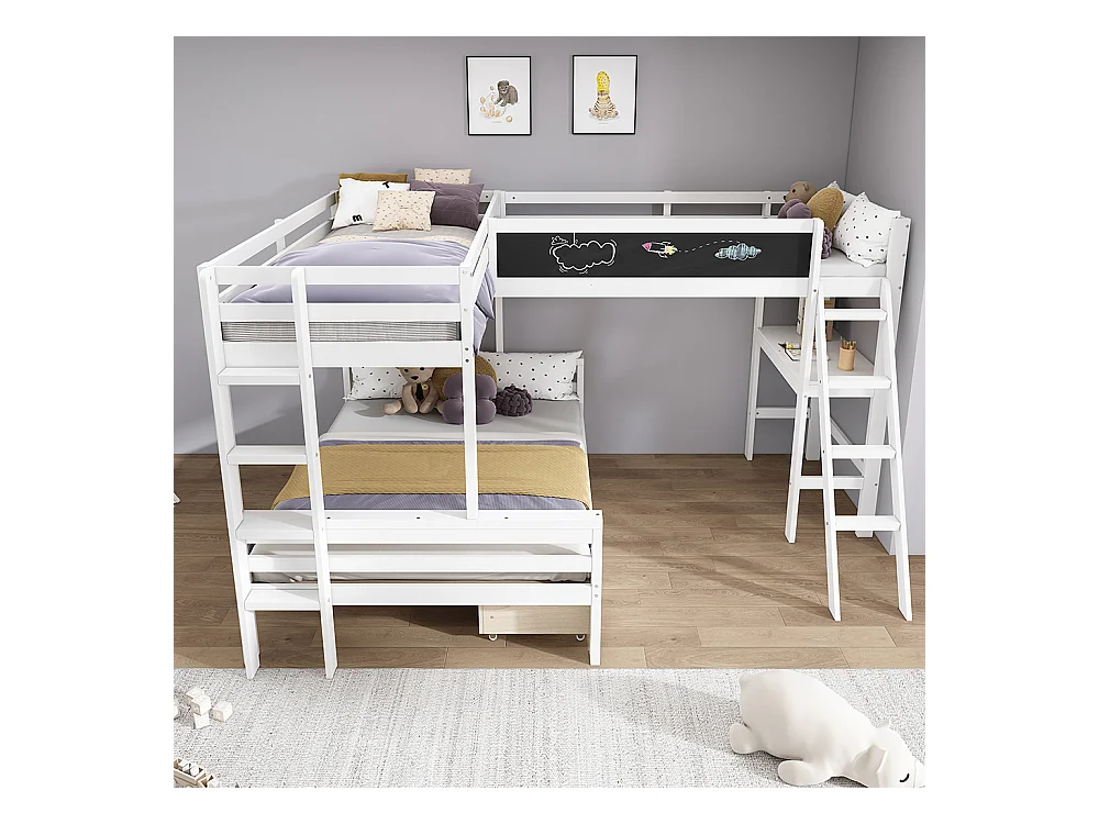 Mezzanine kinderbed, voor drie kinderen, met bureau en plank, 140*200cm, 90*200cm, wit