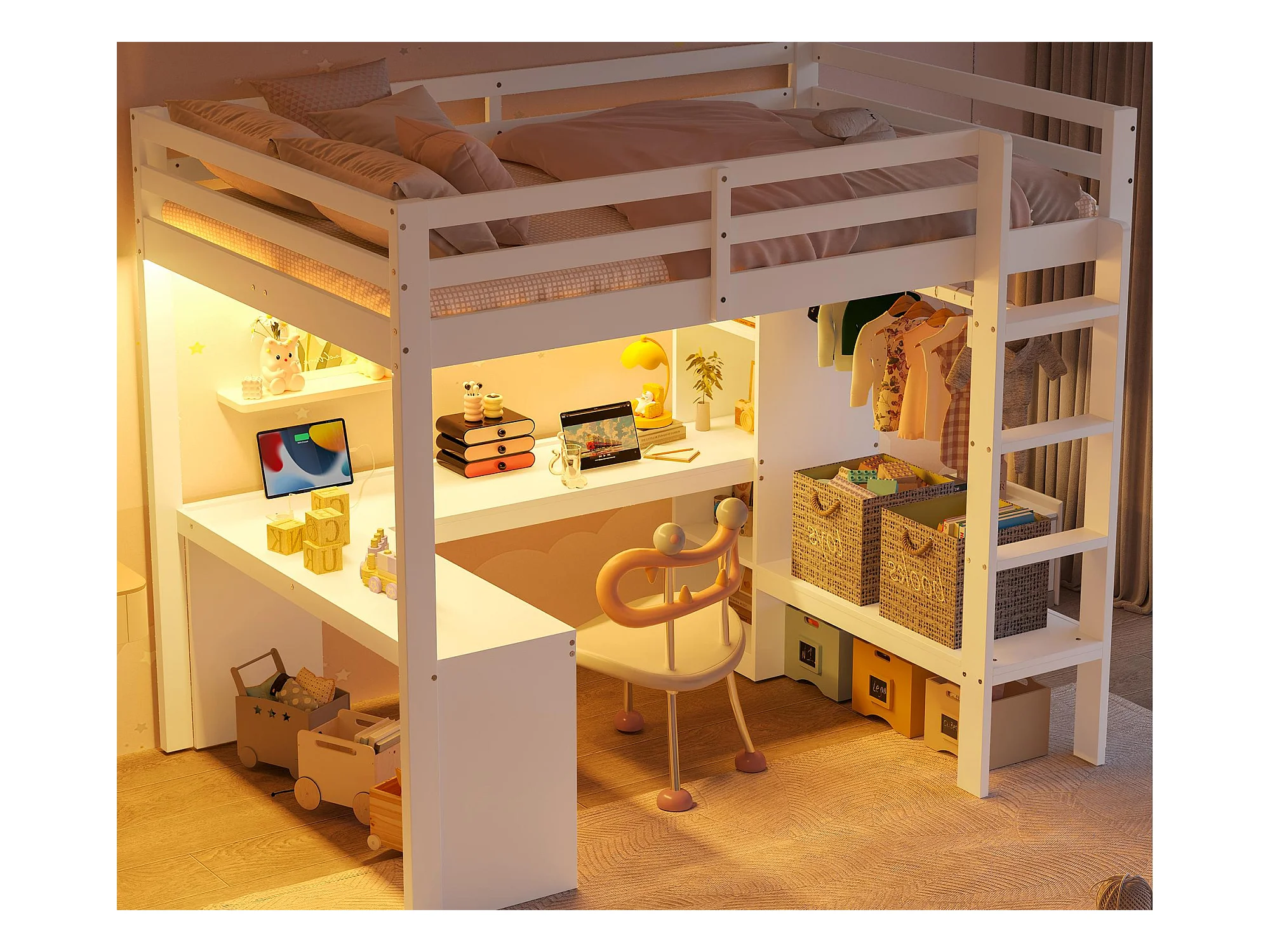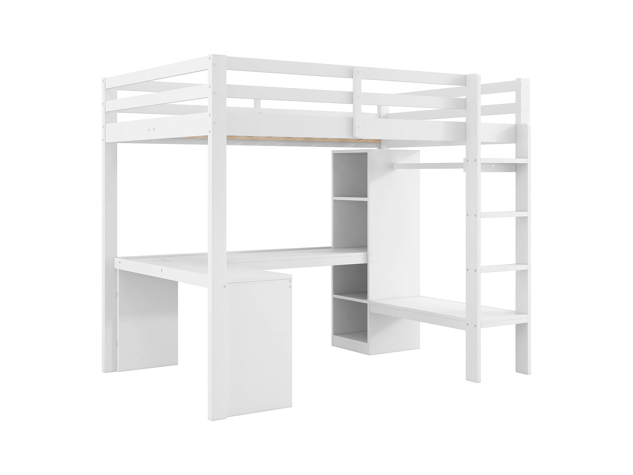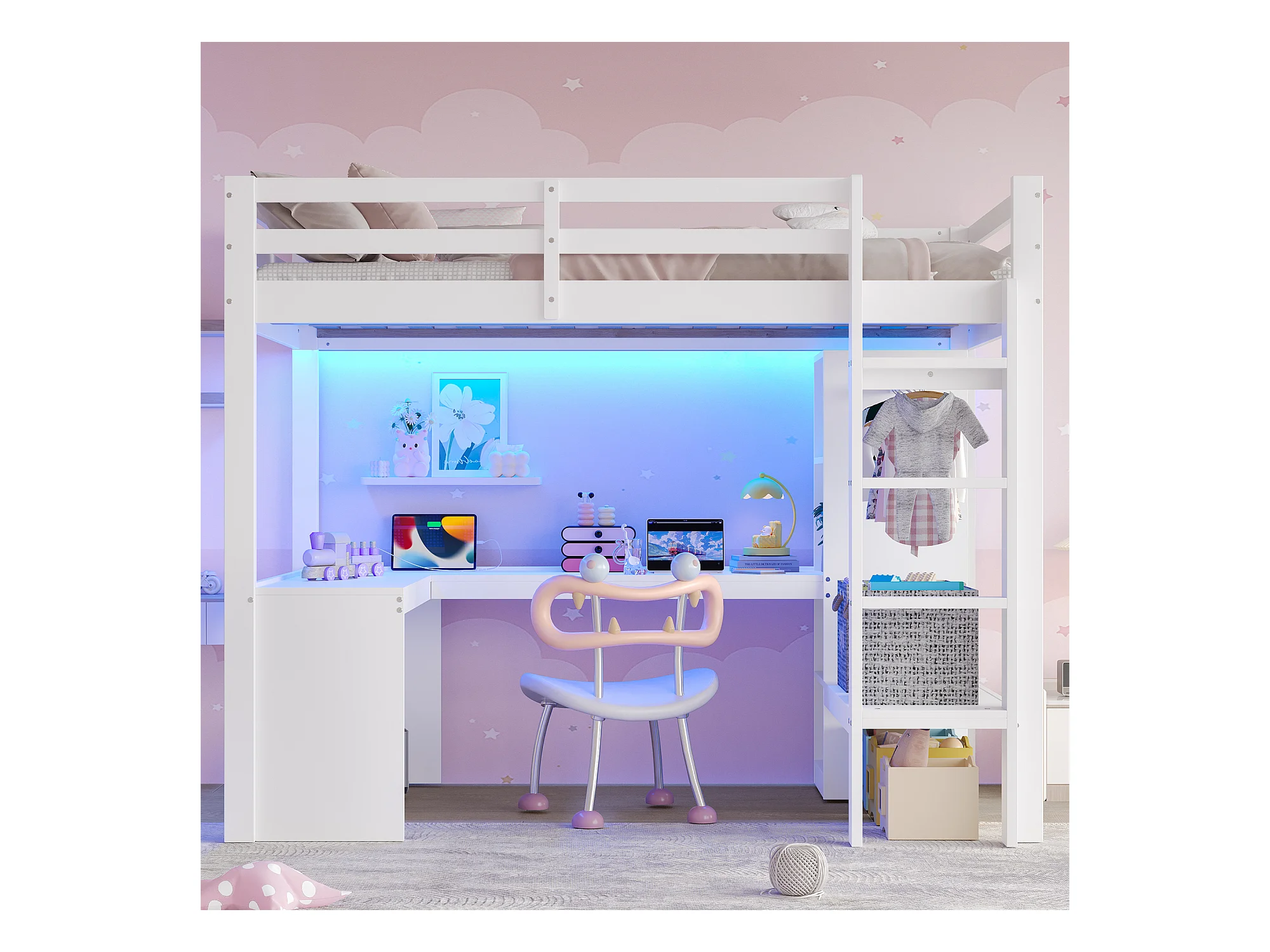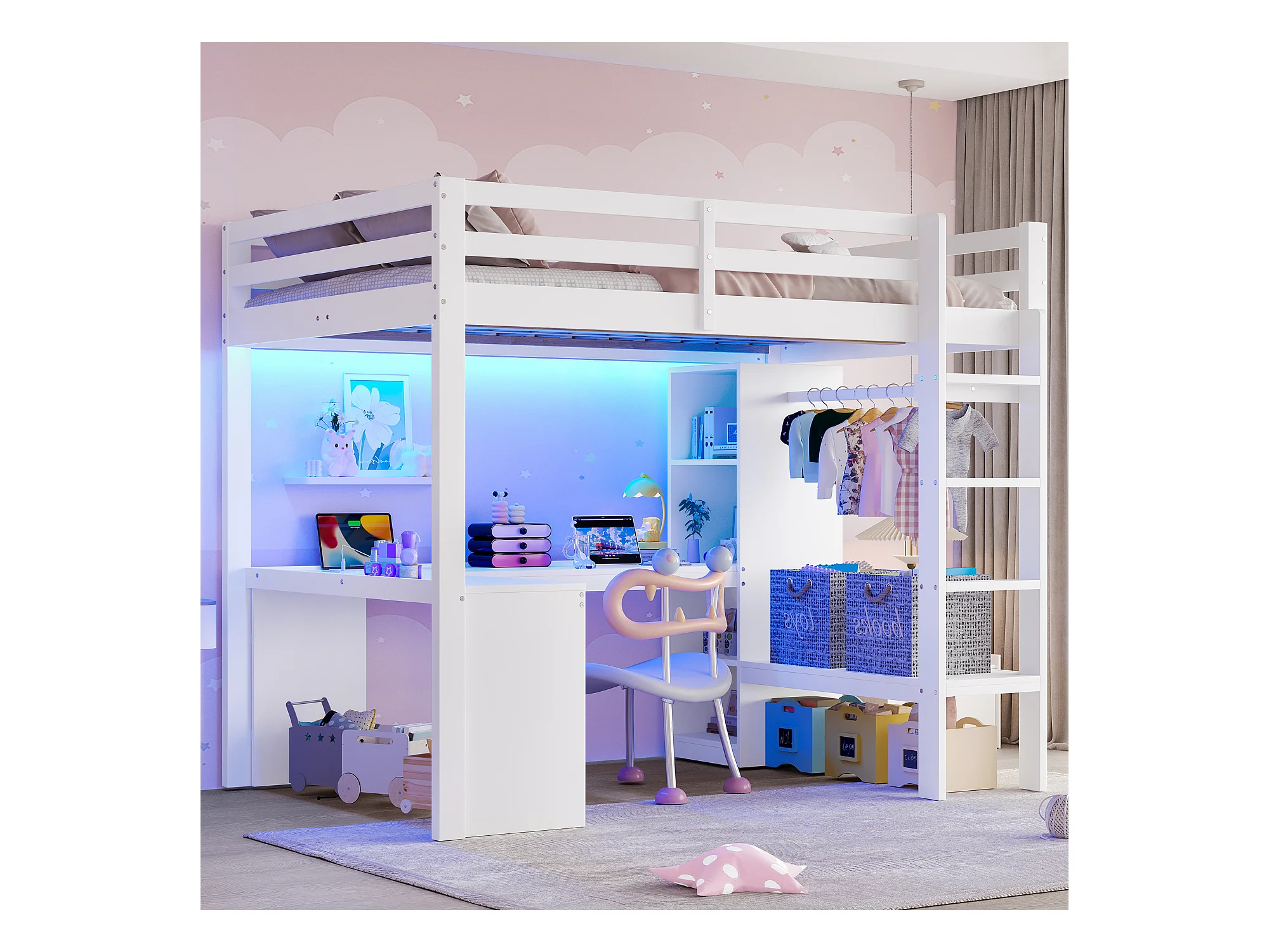 Mezzaninebed 140x200 cm - met bureau - met open kledingkast - met LED-verlichting en USB-poort - wit (matras niet inbegrepen)