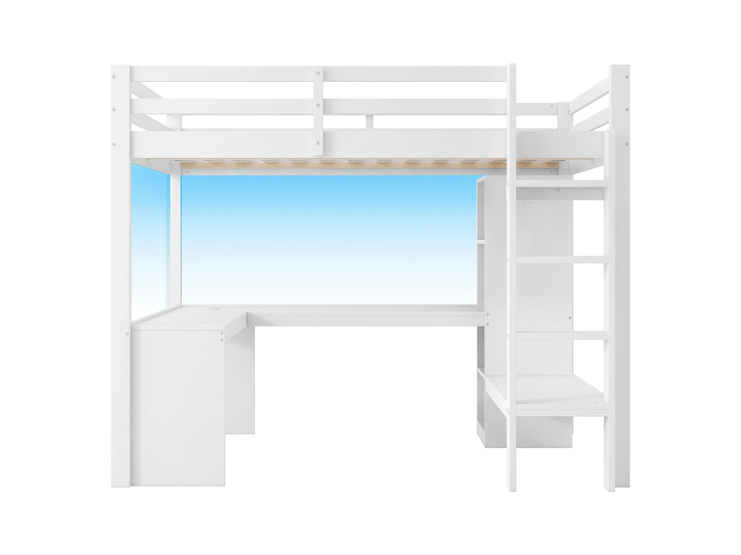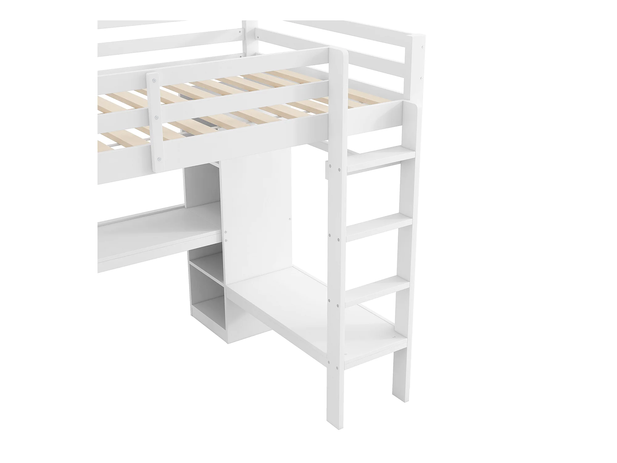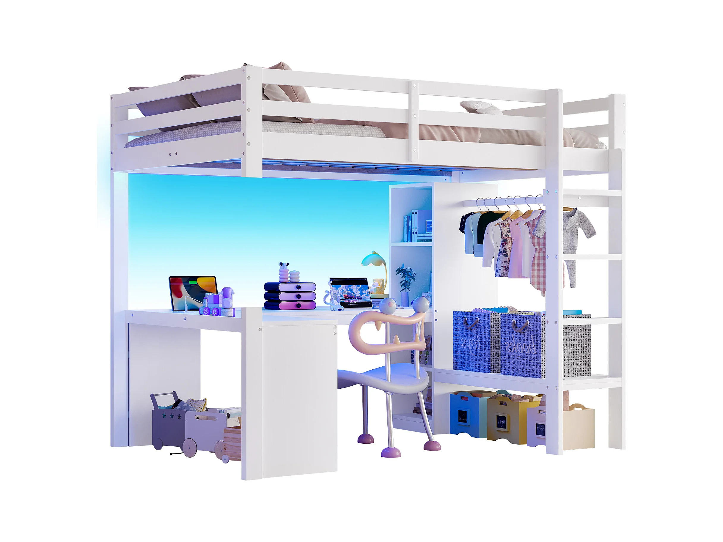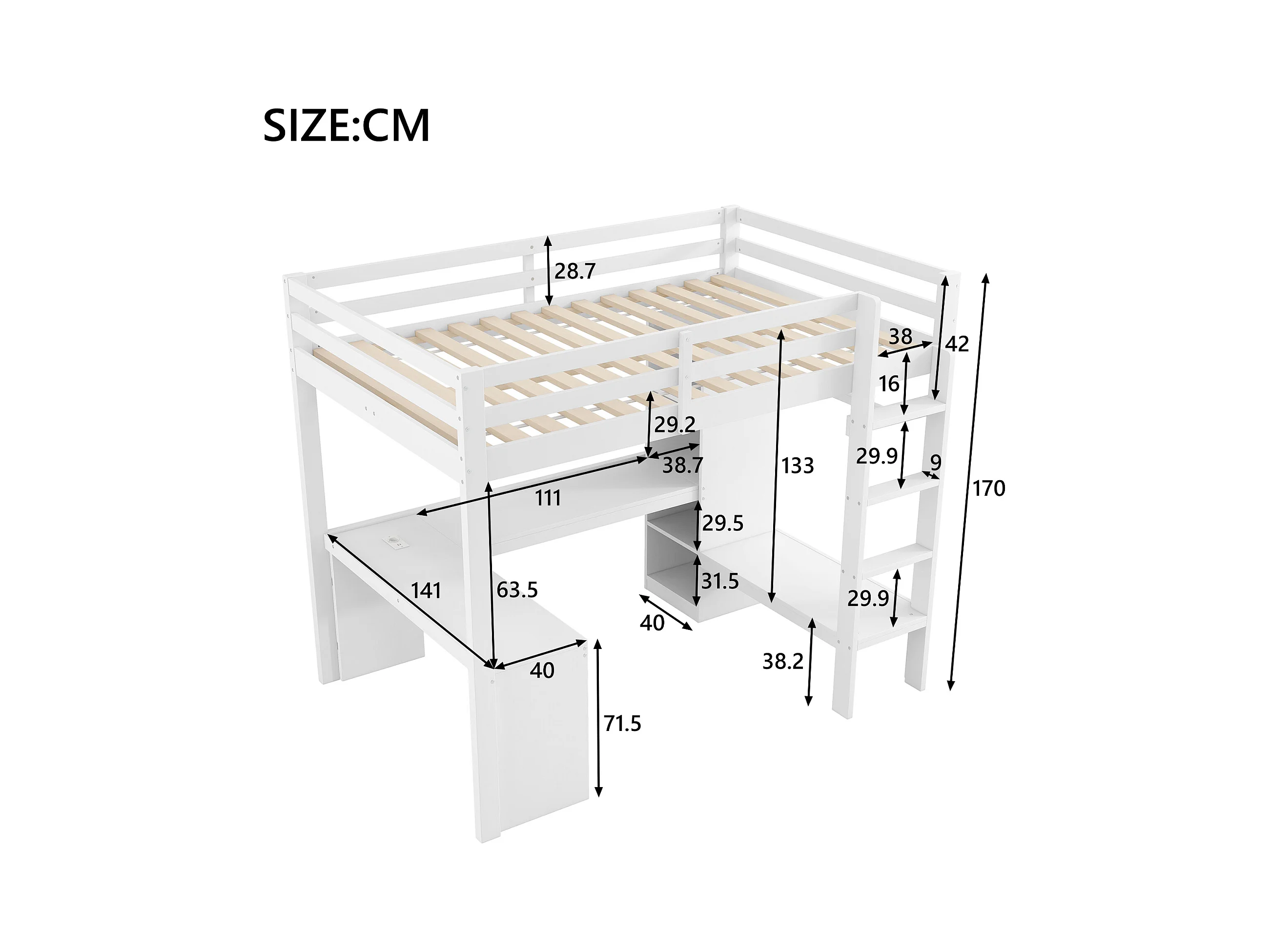 Mezzaninebed 140x200 cm - met bureau - met open kledingkast - met LED-verlichting en USB-poort - wit (matras niet inbegrepen)