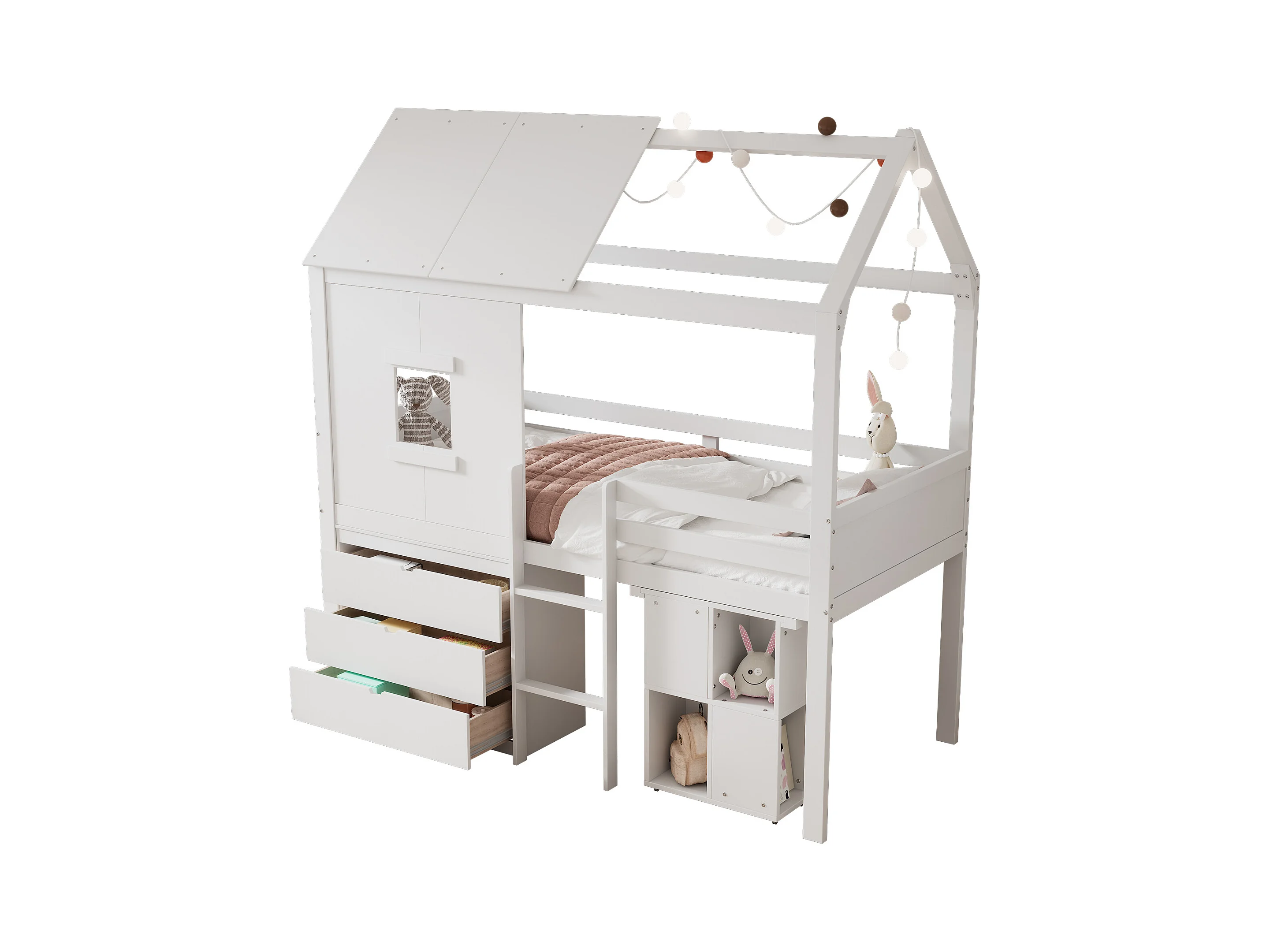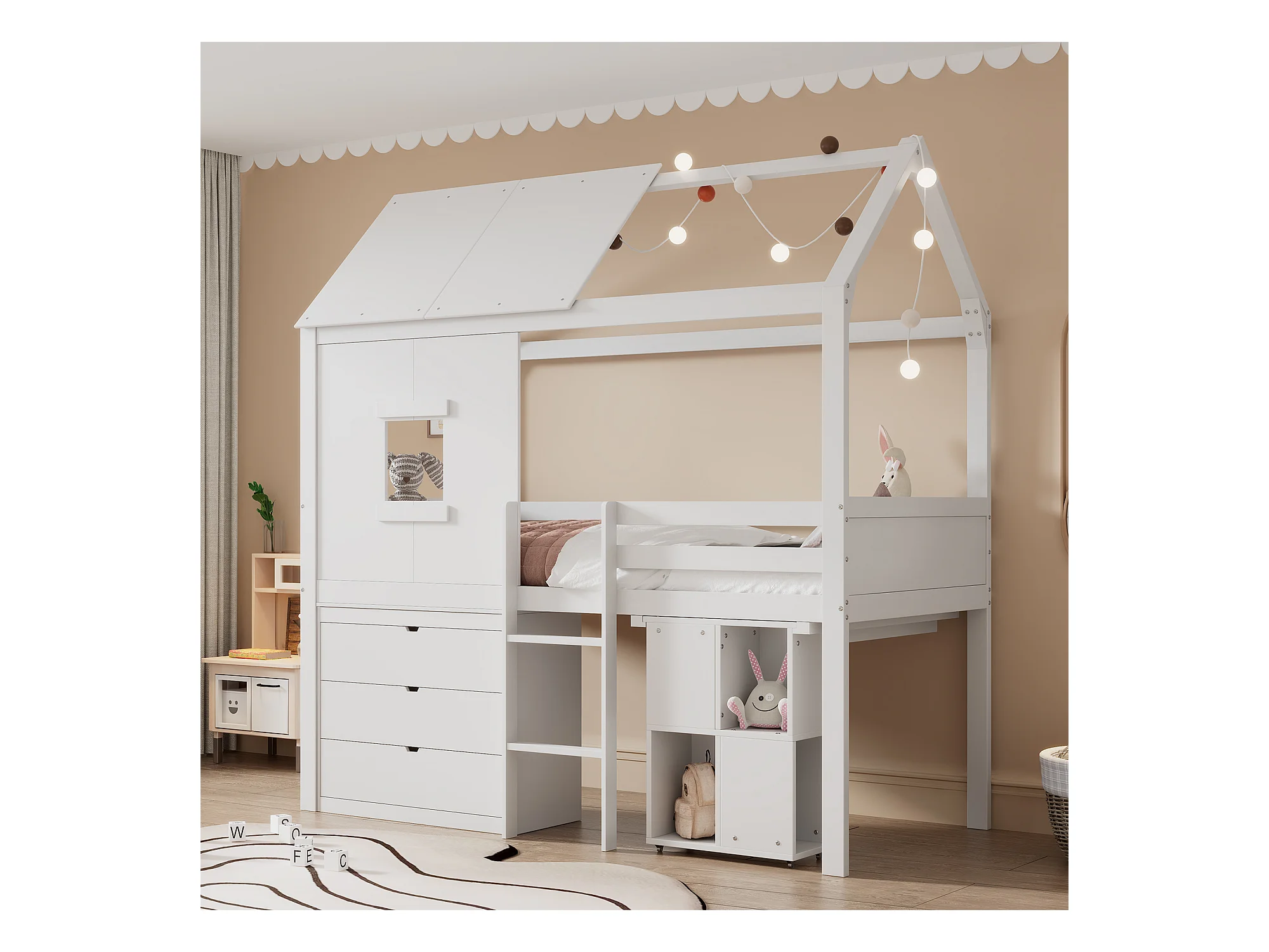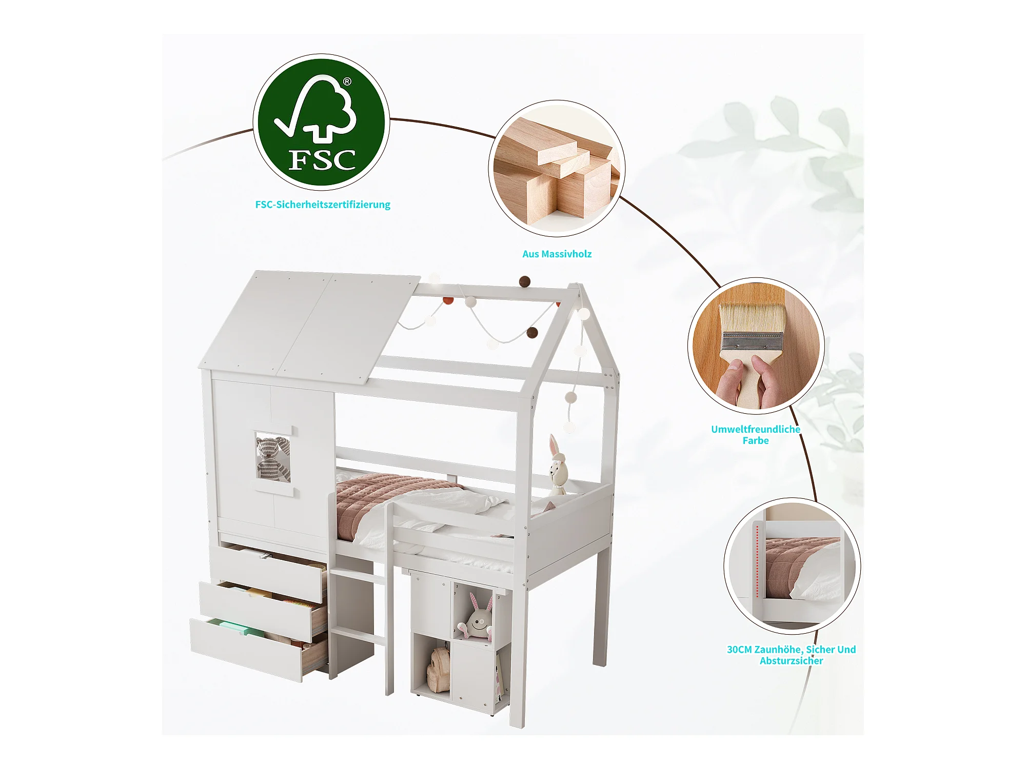 Mezzaninebed 90 x 200 cm met 3 lades en uitschuifbaar bureau - hoogslaper - MDF-hout - wit