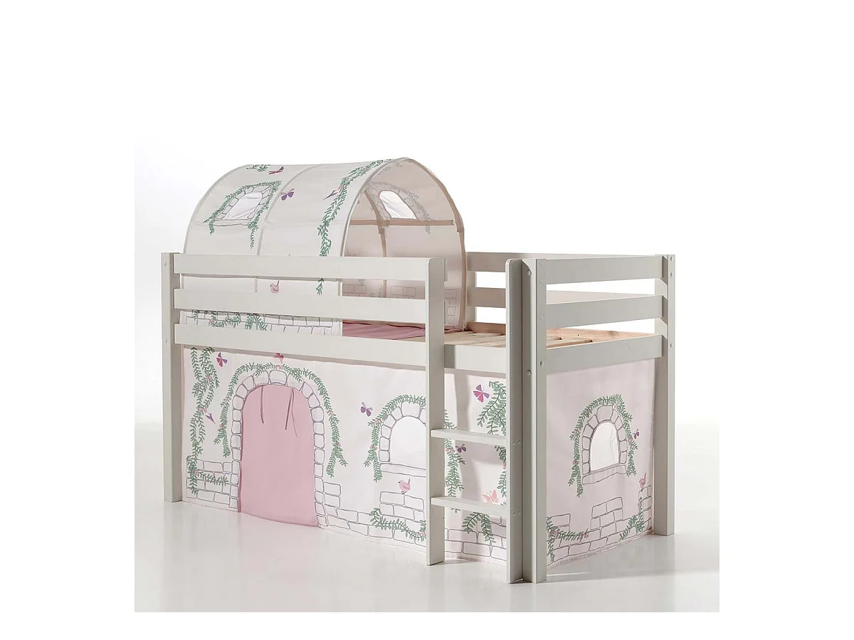 Mezzaninebed van 90x200 cm met tent en 3 prinsessenzakken van massief wit grenen Pino
