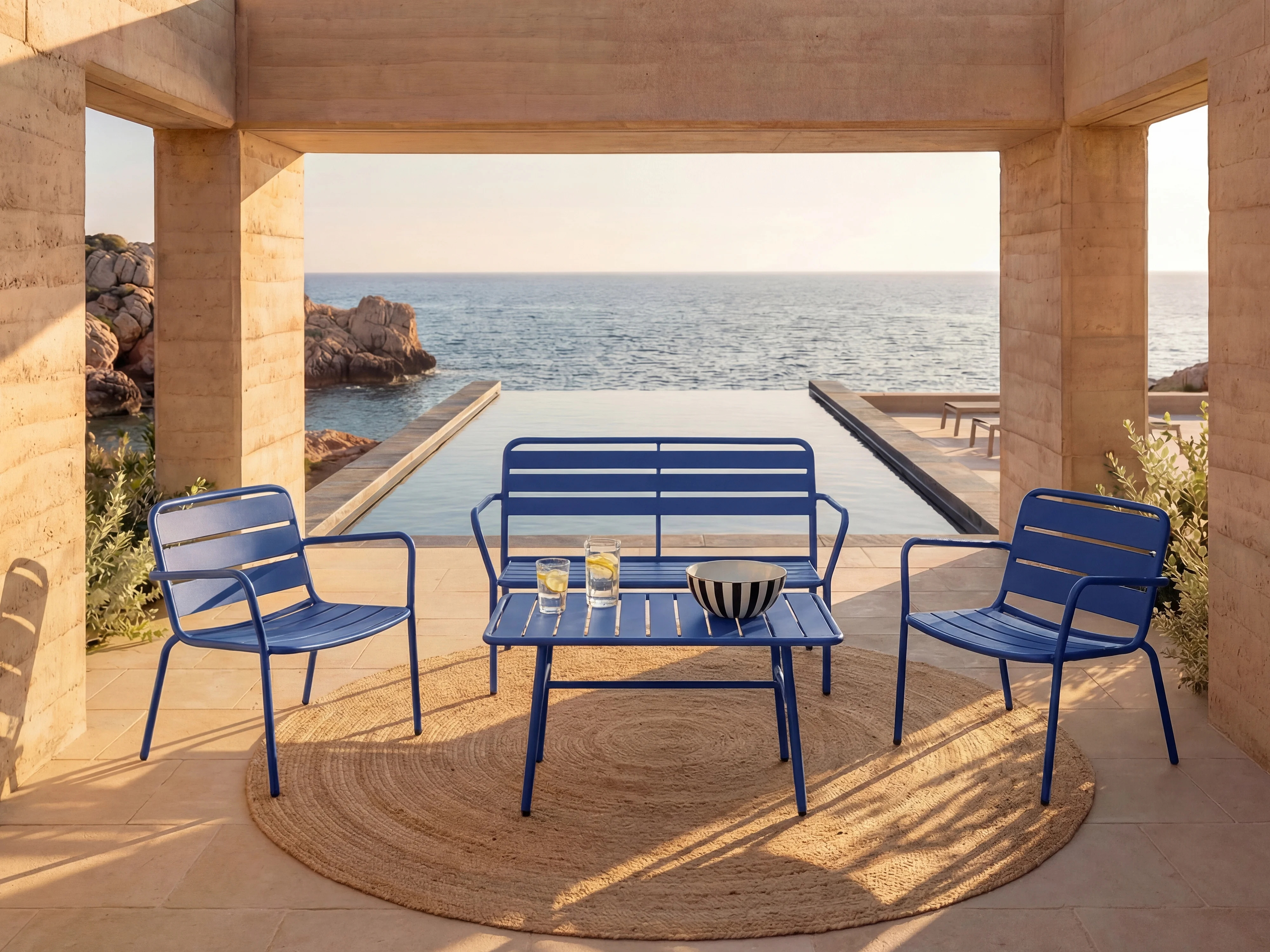 Metalen tuinset: een bank, 2 lage stoelen en een salontafel - Nachtblauw - MIRMANDE van MYLIA