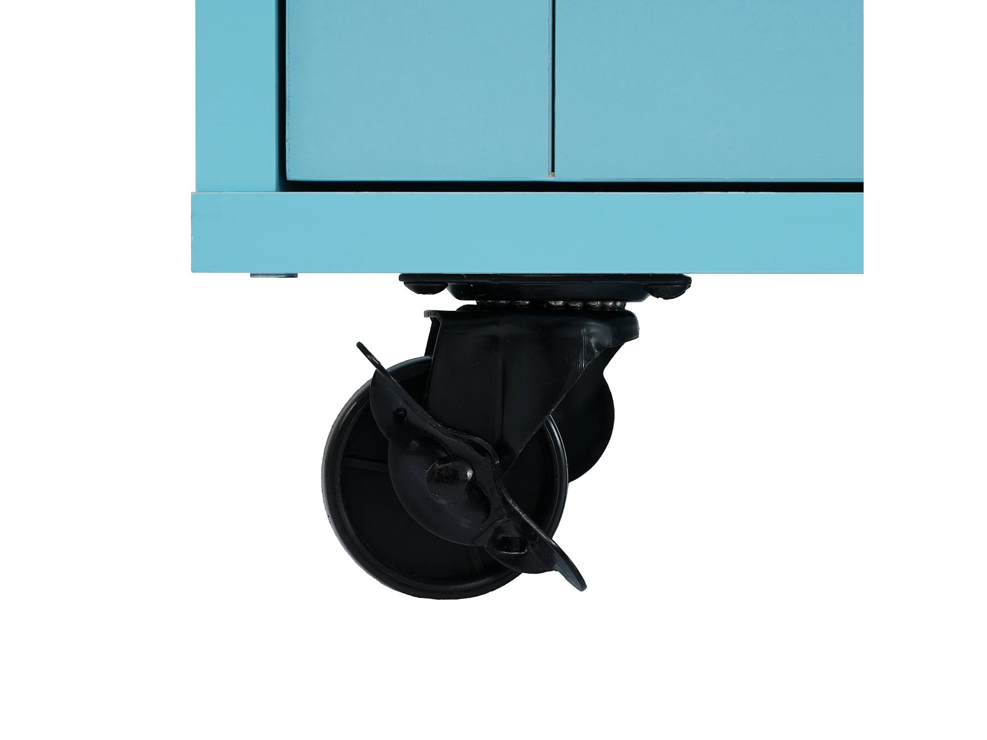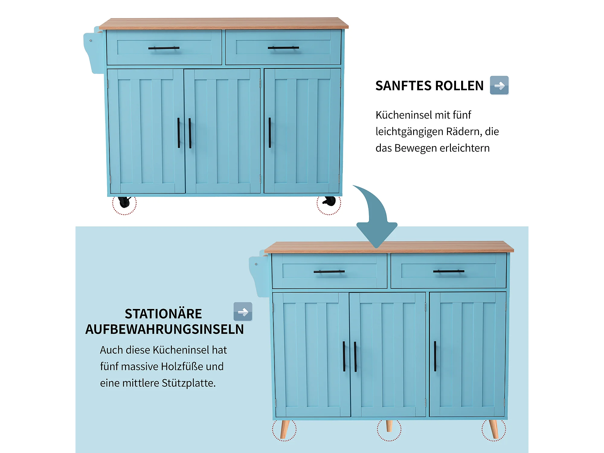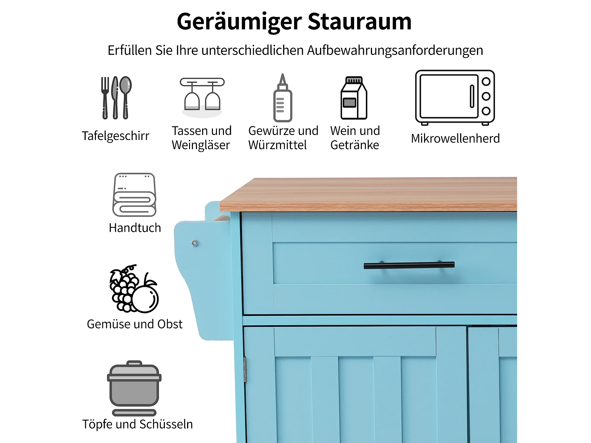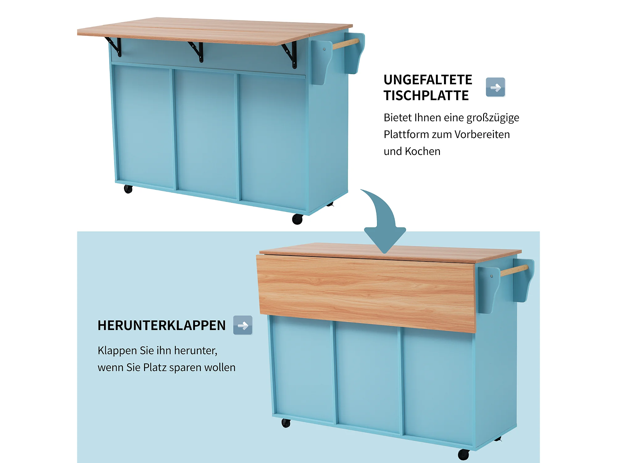 Mobiel centraal keukeneiland met 3 deuren en 2 laden - uitschuifbaar blad - 129x46/71x91,5 cm - MDF hout + metaal - Blauw