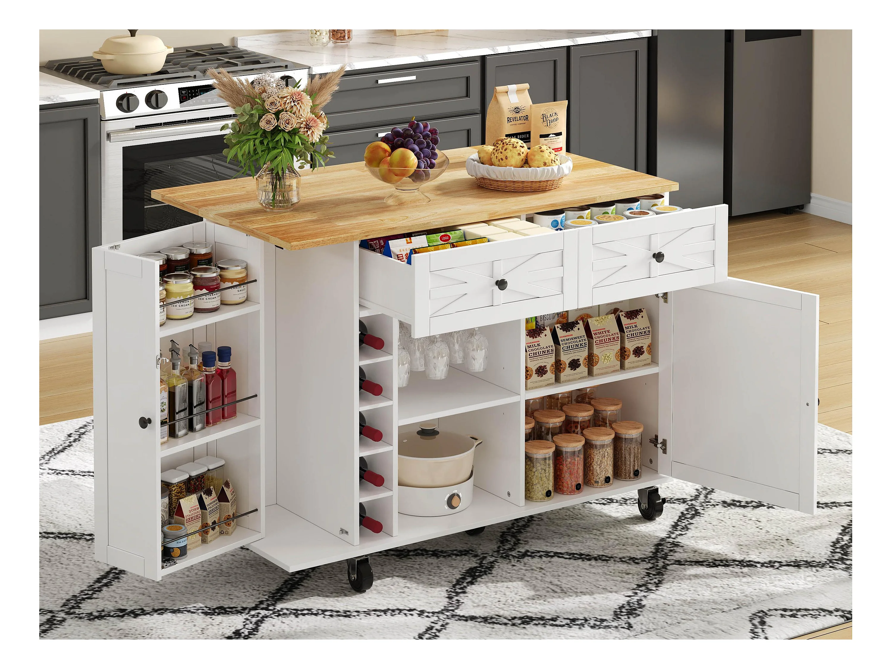 Mobiel keukeneiland - uitschuifbaar werkblad - met wijnrek en handdoekhouder - met 2 laden en 2 deuren - MDF - Wit