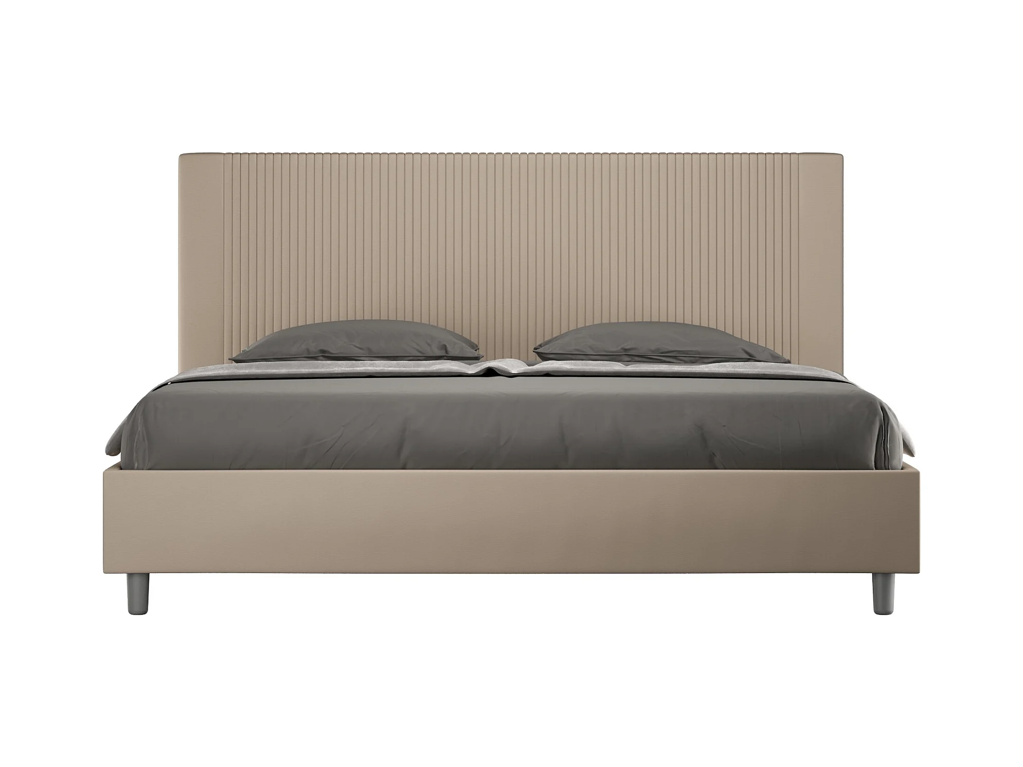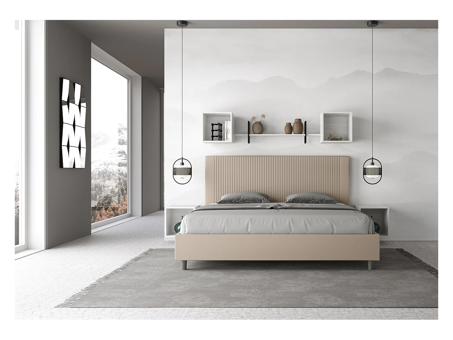 Modern bed met verticaal gestreept hoofdeinde, doorgestikt met kunstleer Bazen-Kleur Beige-Slapen 180x200cm-Keuze Zonder boxspring