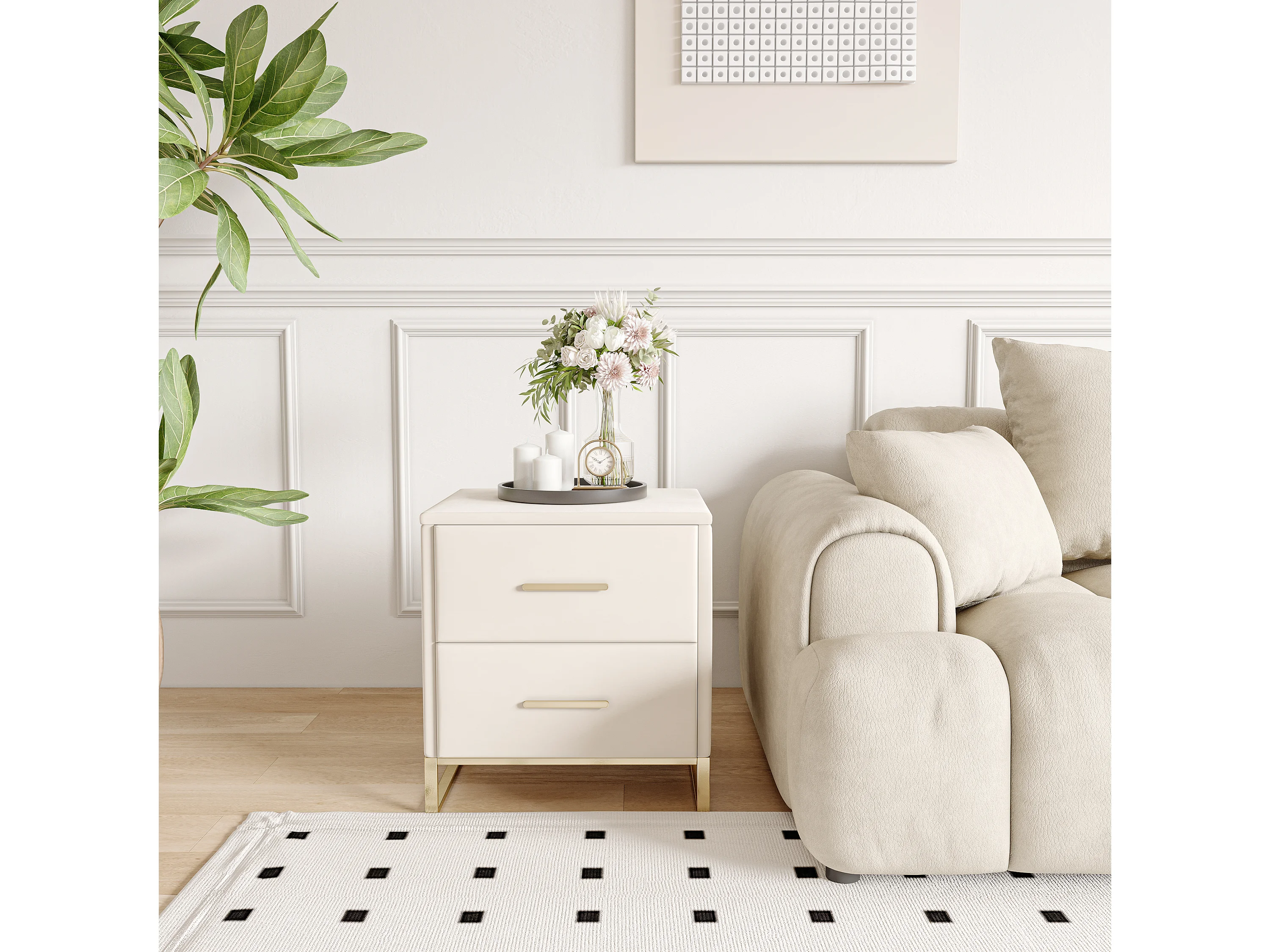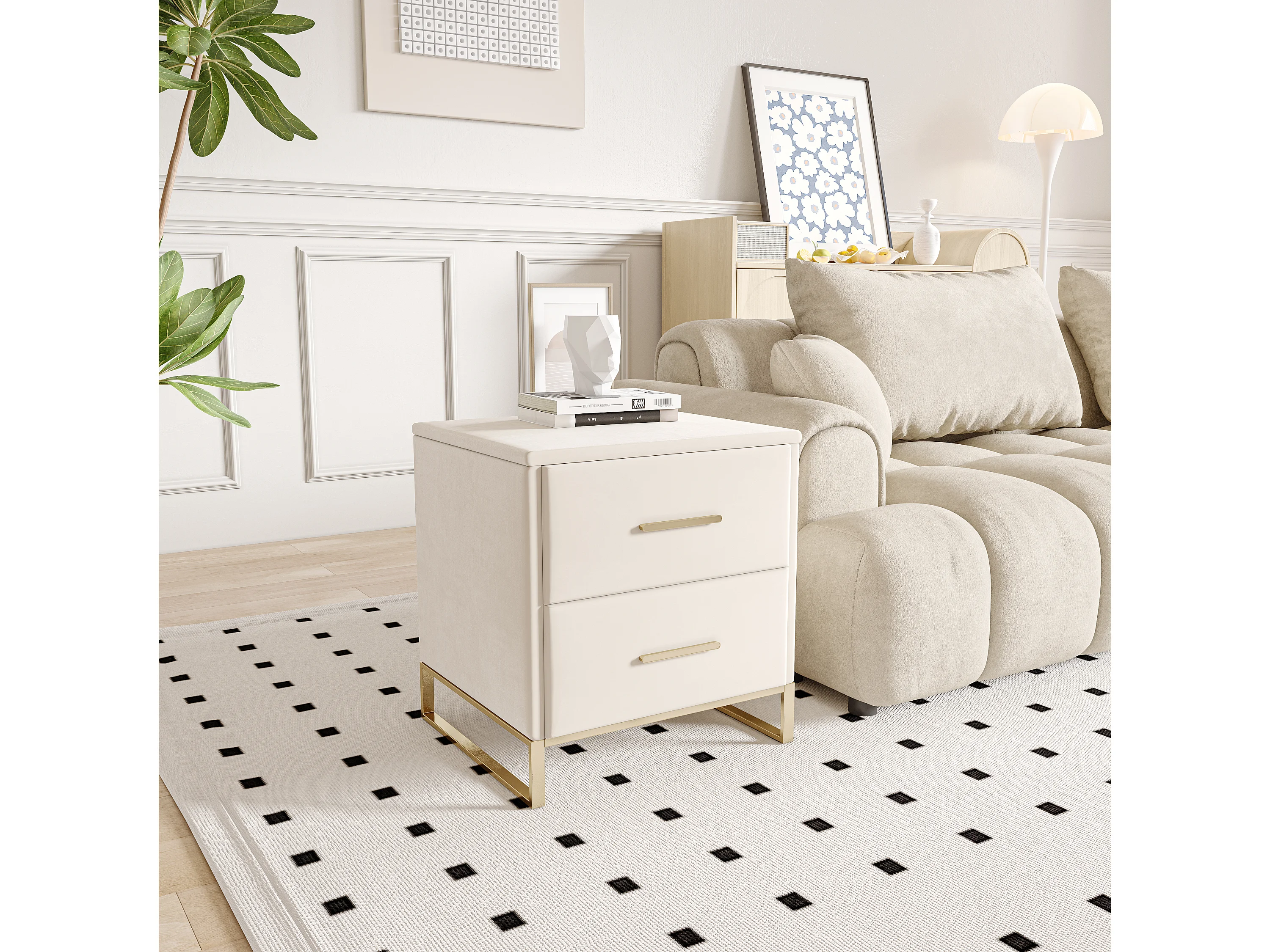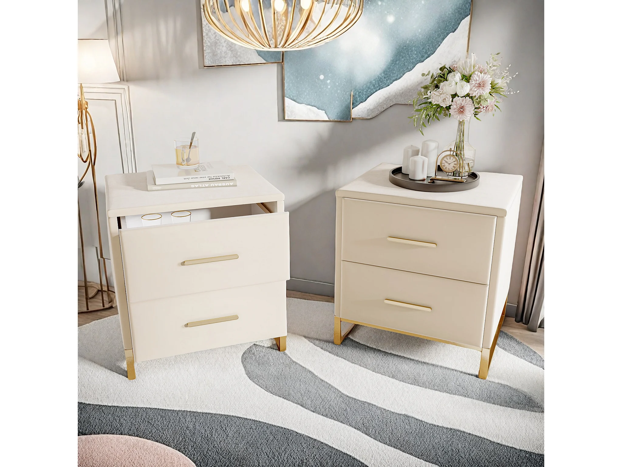 Modern beige nachtkastje met twee lades en goudkleurige metalen poten, fluwelen stof