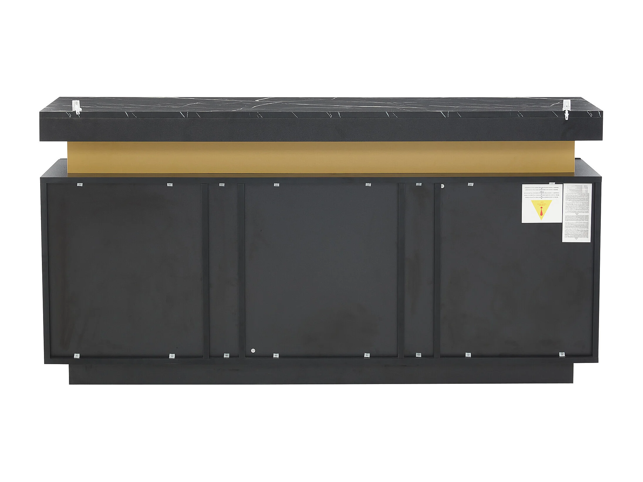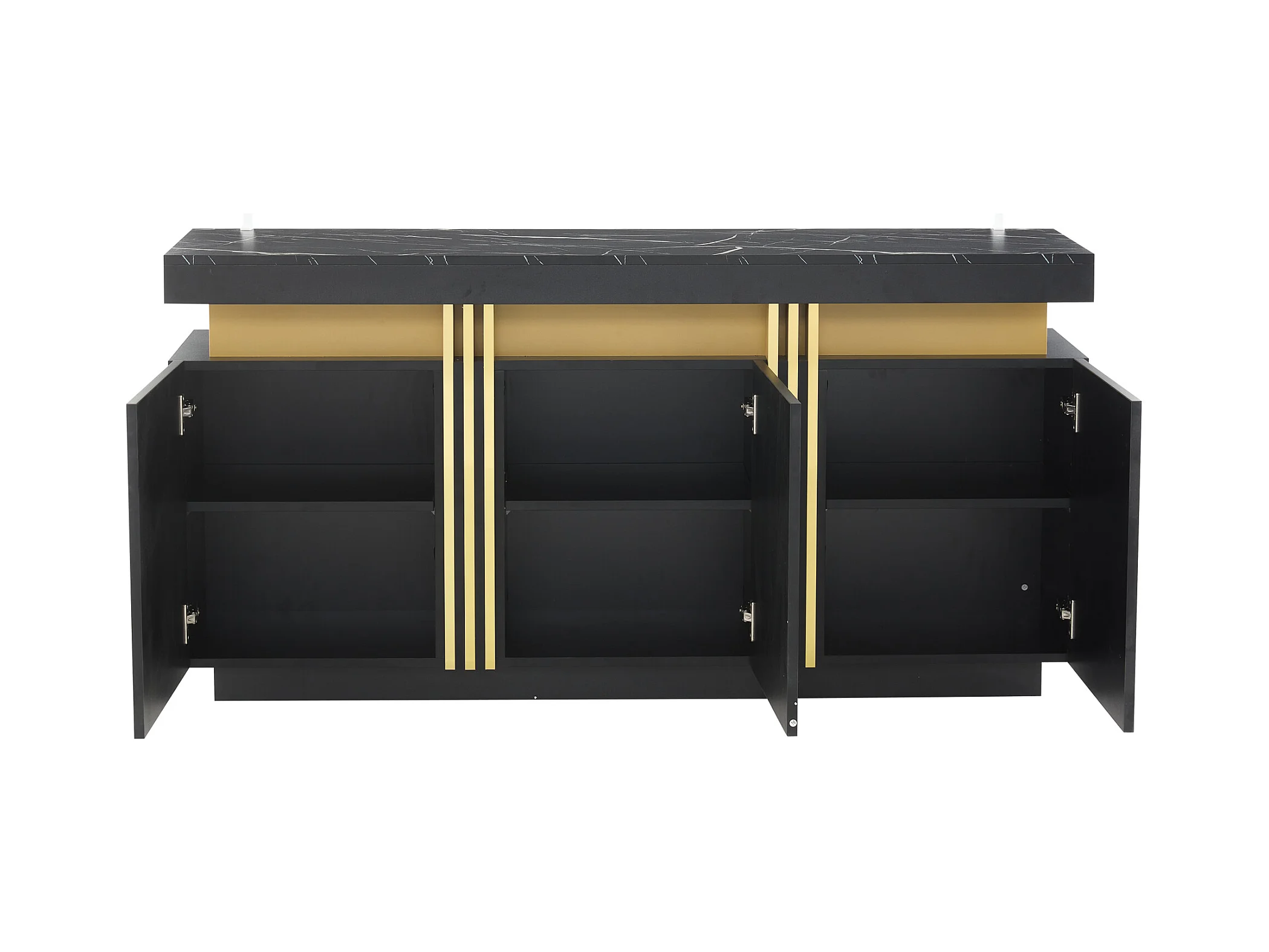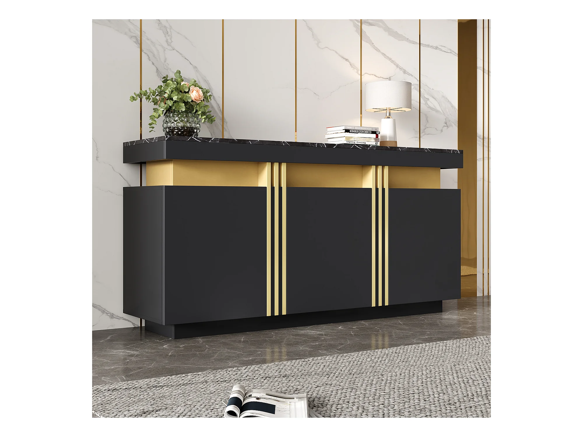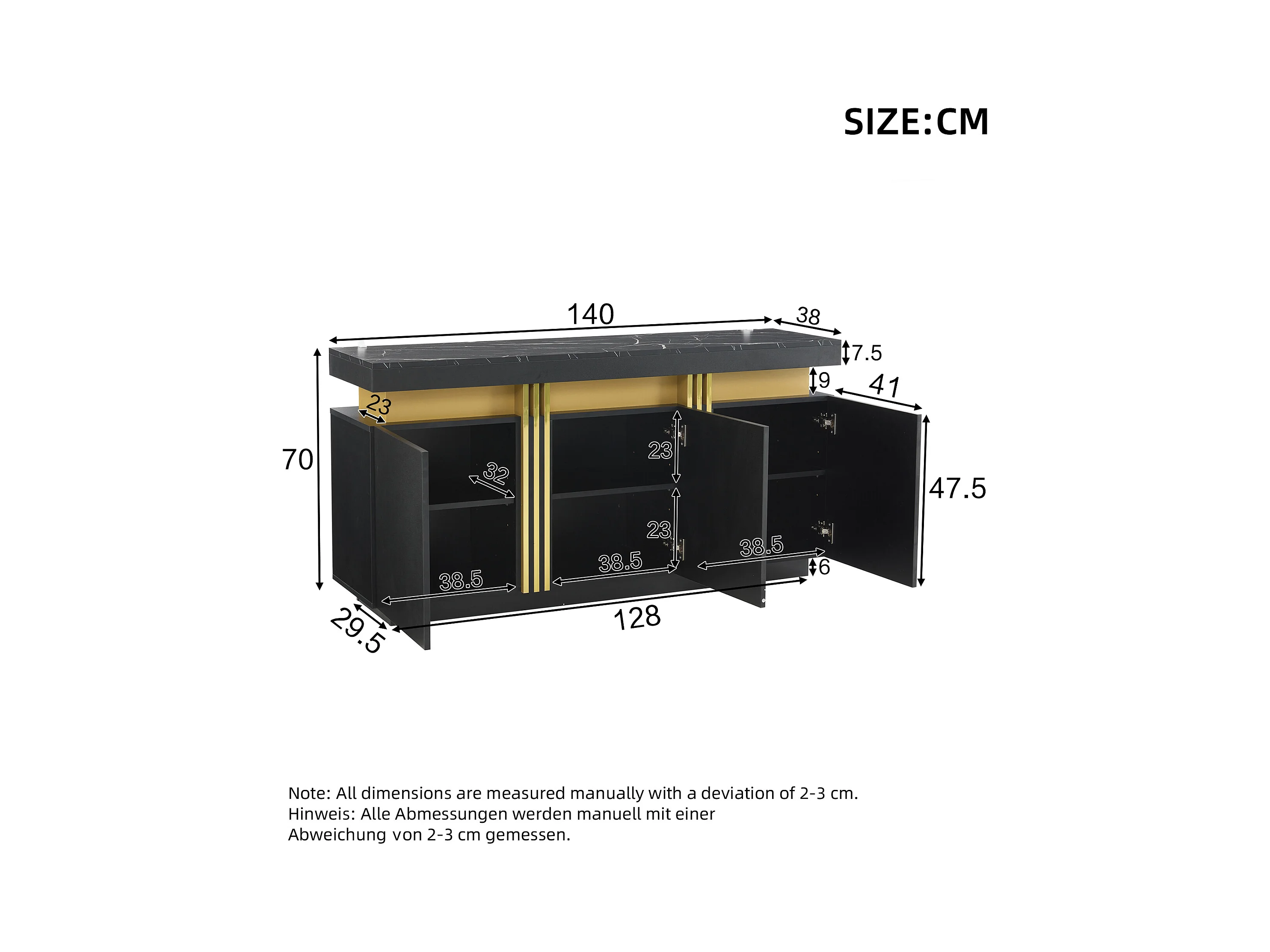 Modern dressoir 140x38x70cm met 3 deuren en een marmerlook bovenblad, zwart en goud