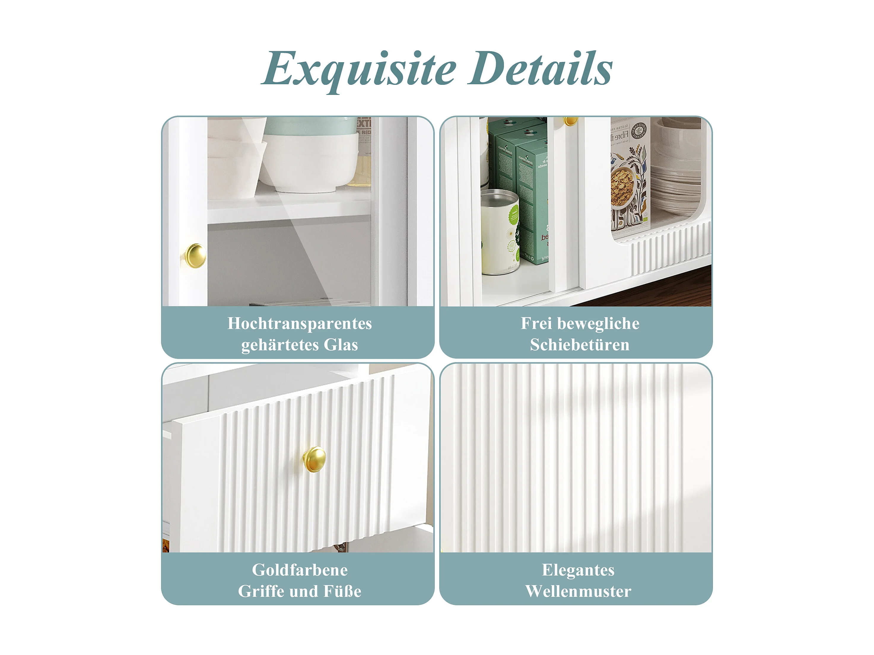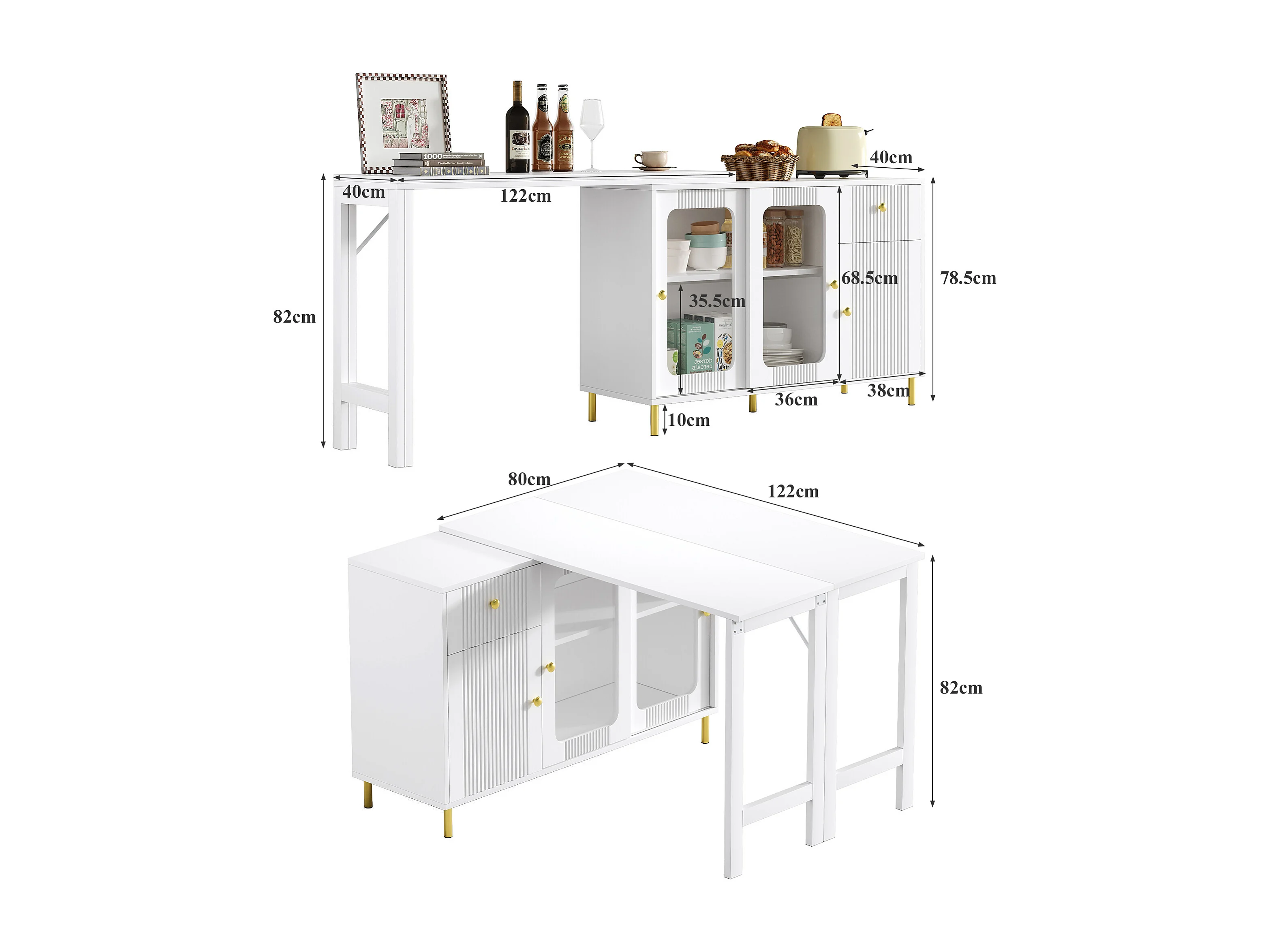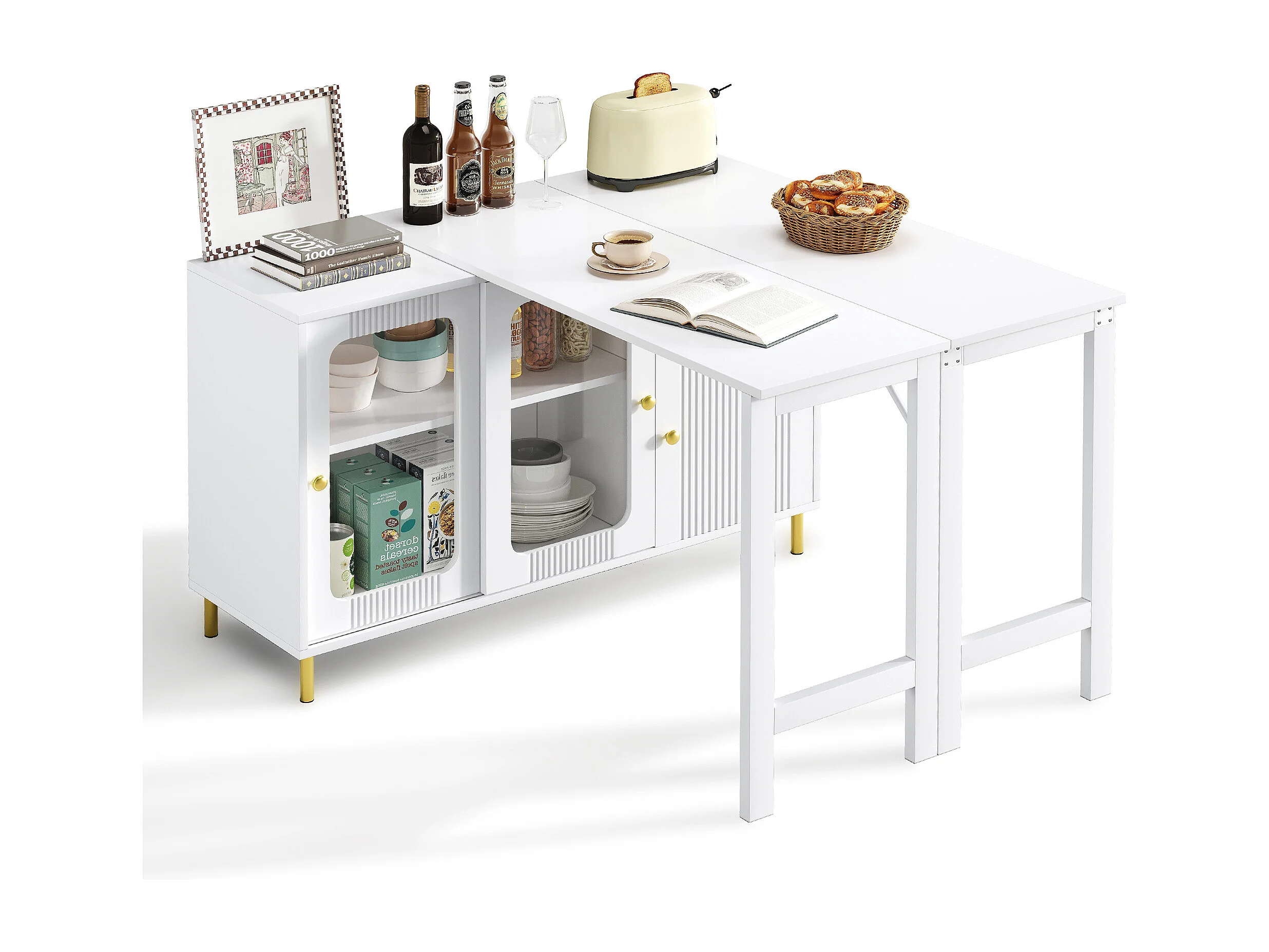 Modern dressoir met opklapbare en uitschuifbare tafel, 3 deuren, 3D-golfdesign, poten van goudkleurig metaal, gehard glas, MDF, wit (116x40x78,5 cm)