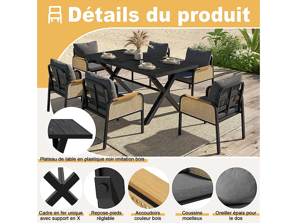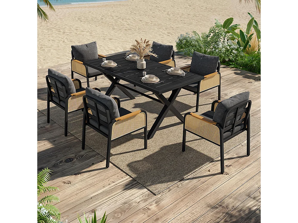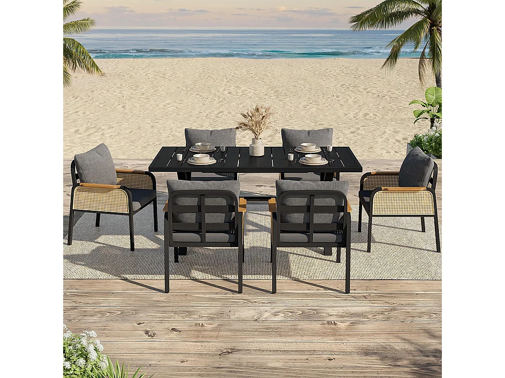 Moderne buitenbankenset, conferentieset, ijzeren frame, gevlochten armleuningen, inclusief kussens, zwart
