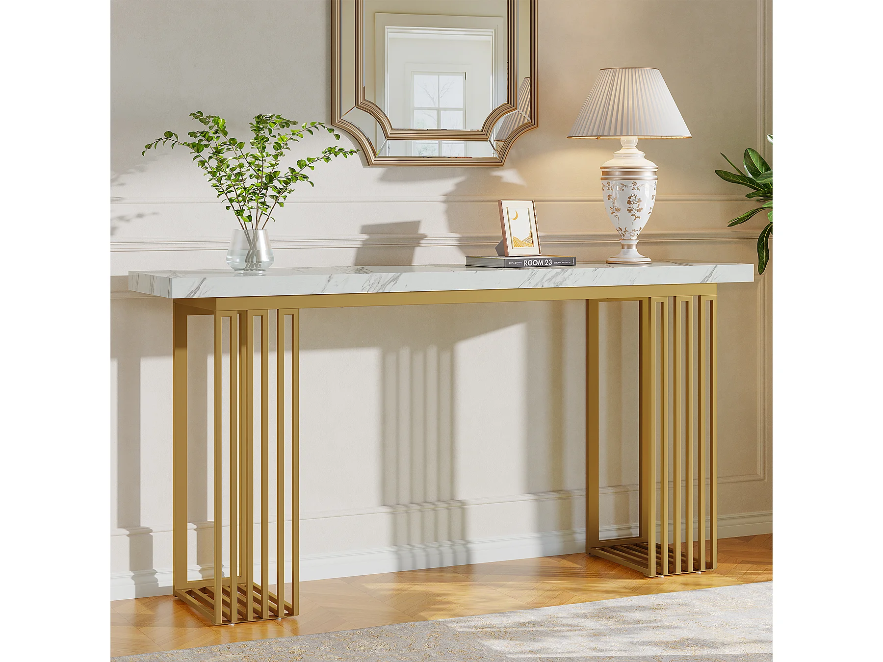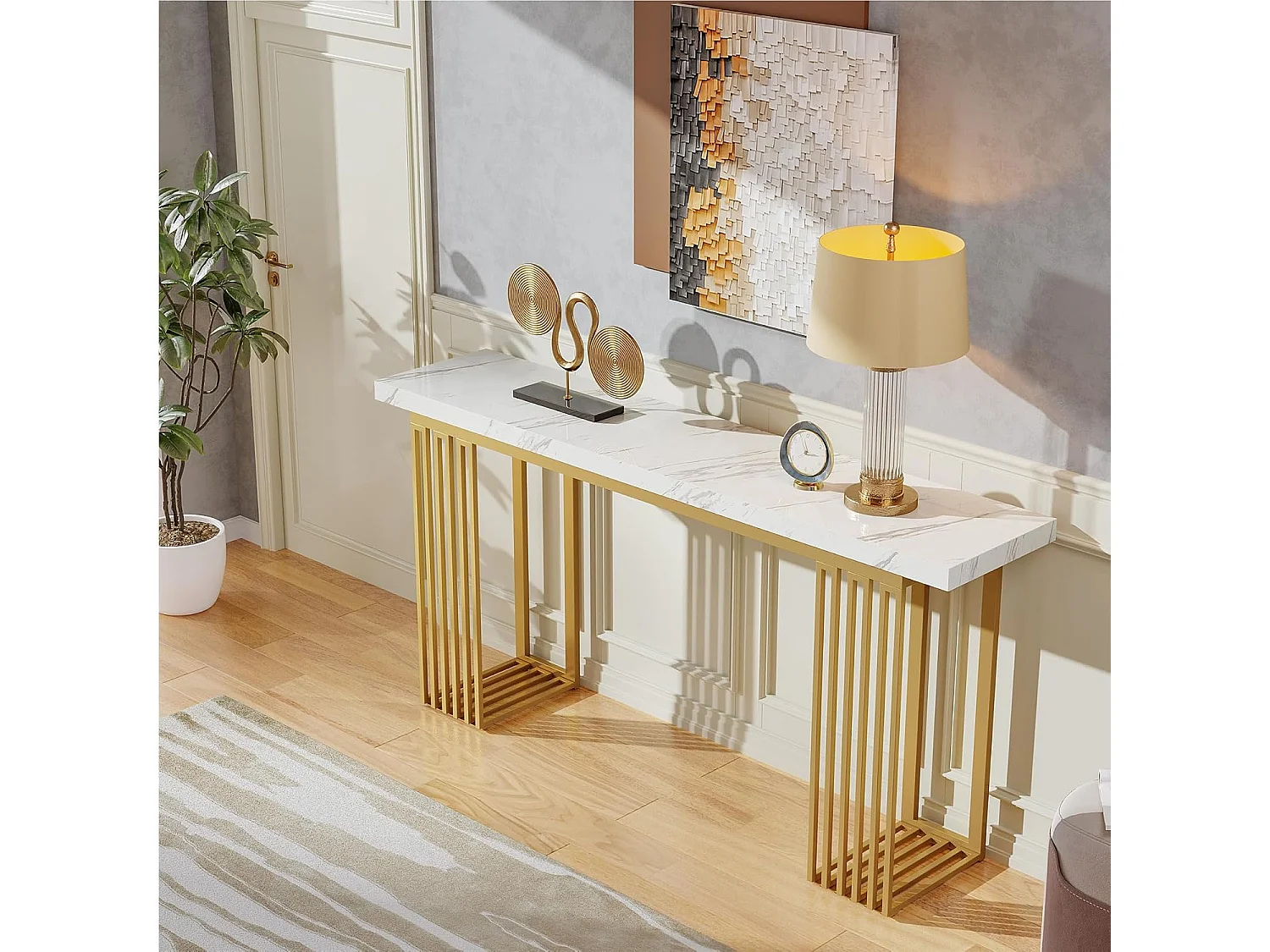 Moderne consoletafel met blad van wit imitatiemarmerfineer en gouden metalen onderstel, MDF