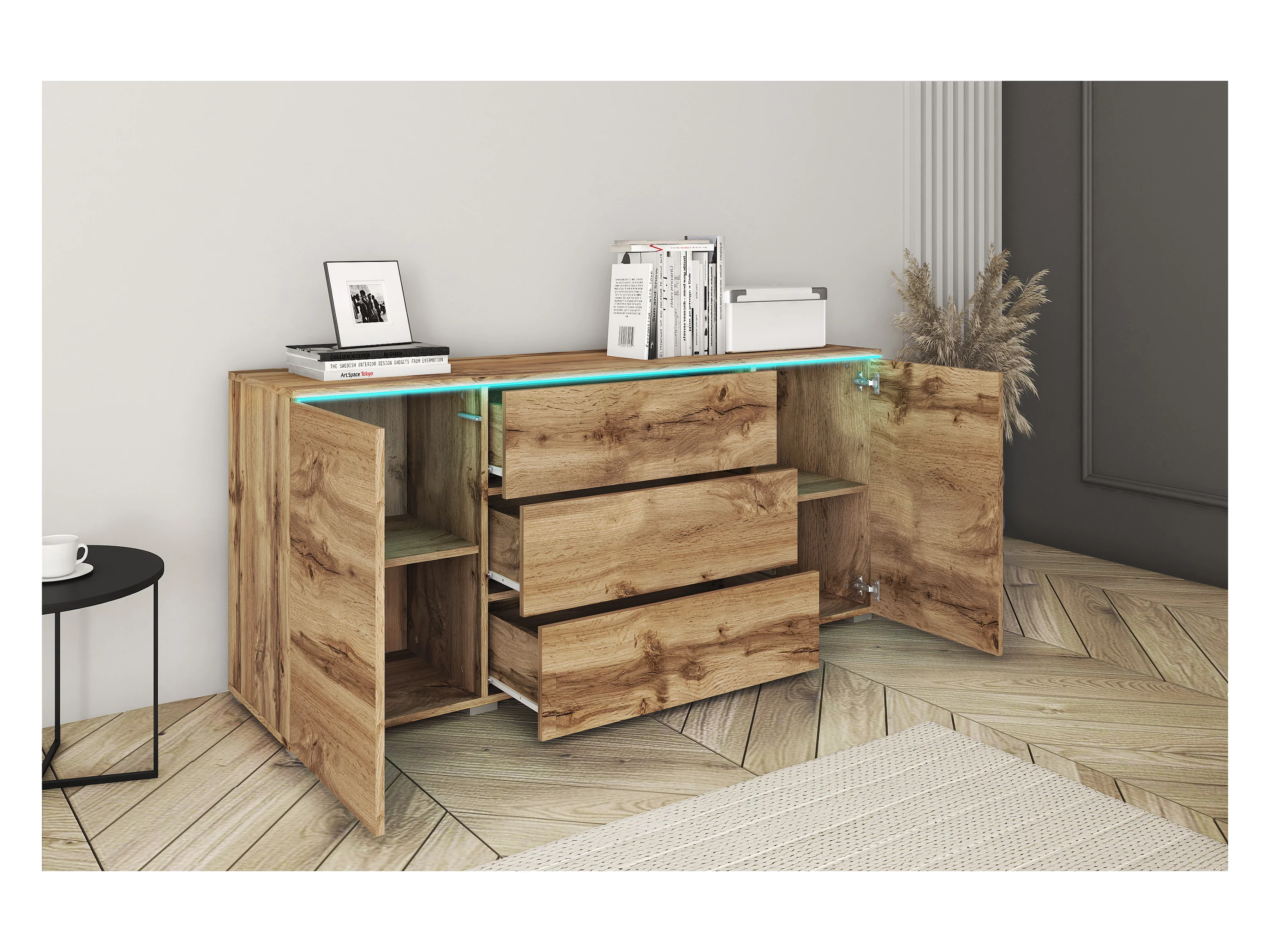 Moderne dressoir 150 cm met LED voor de woonkamer – mat afwerking, 3 lades en 2 deuren eiken wotan