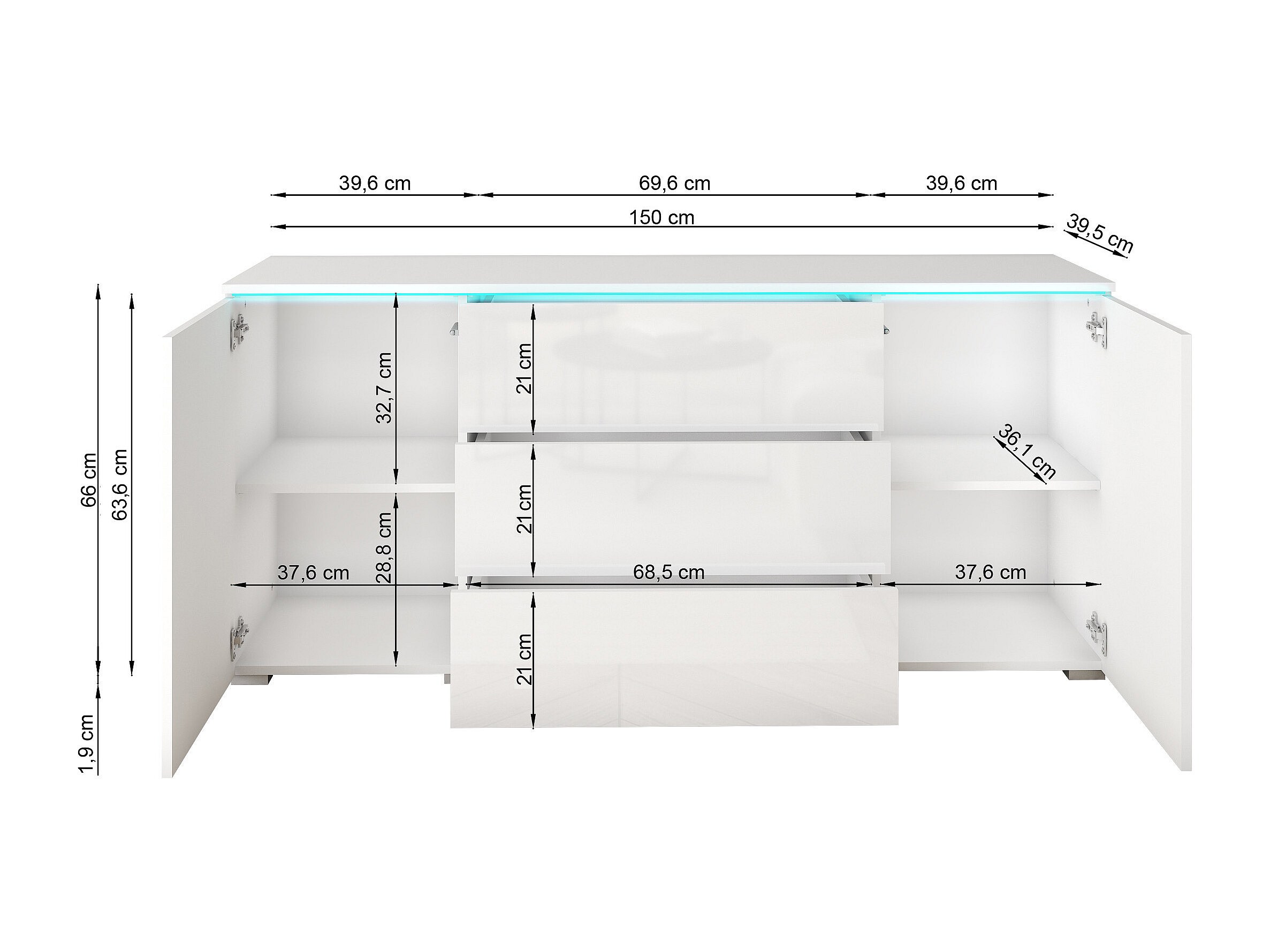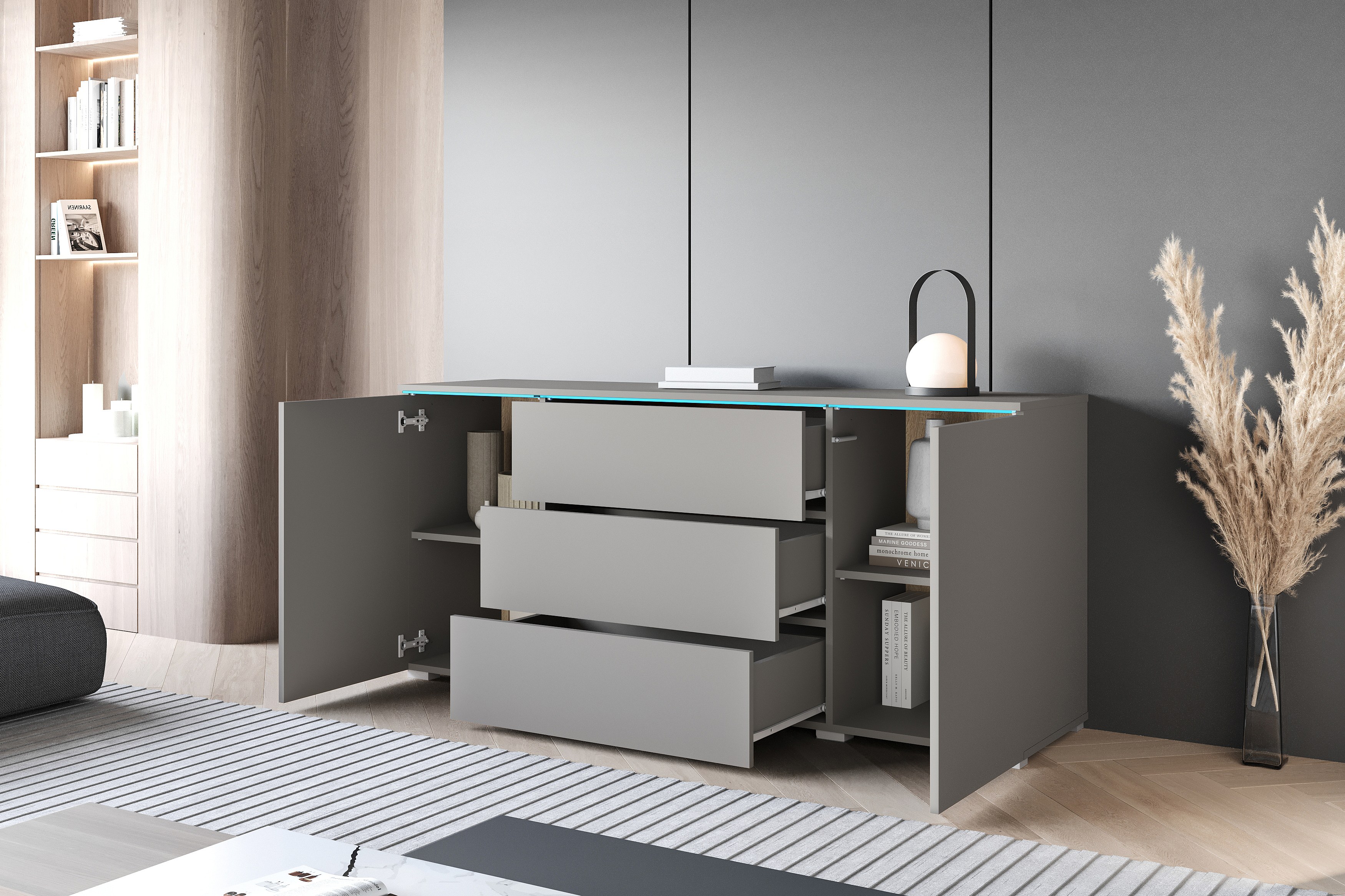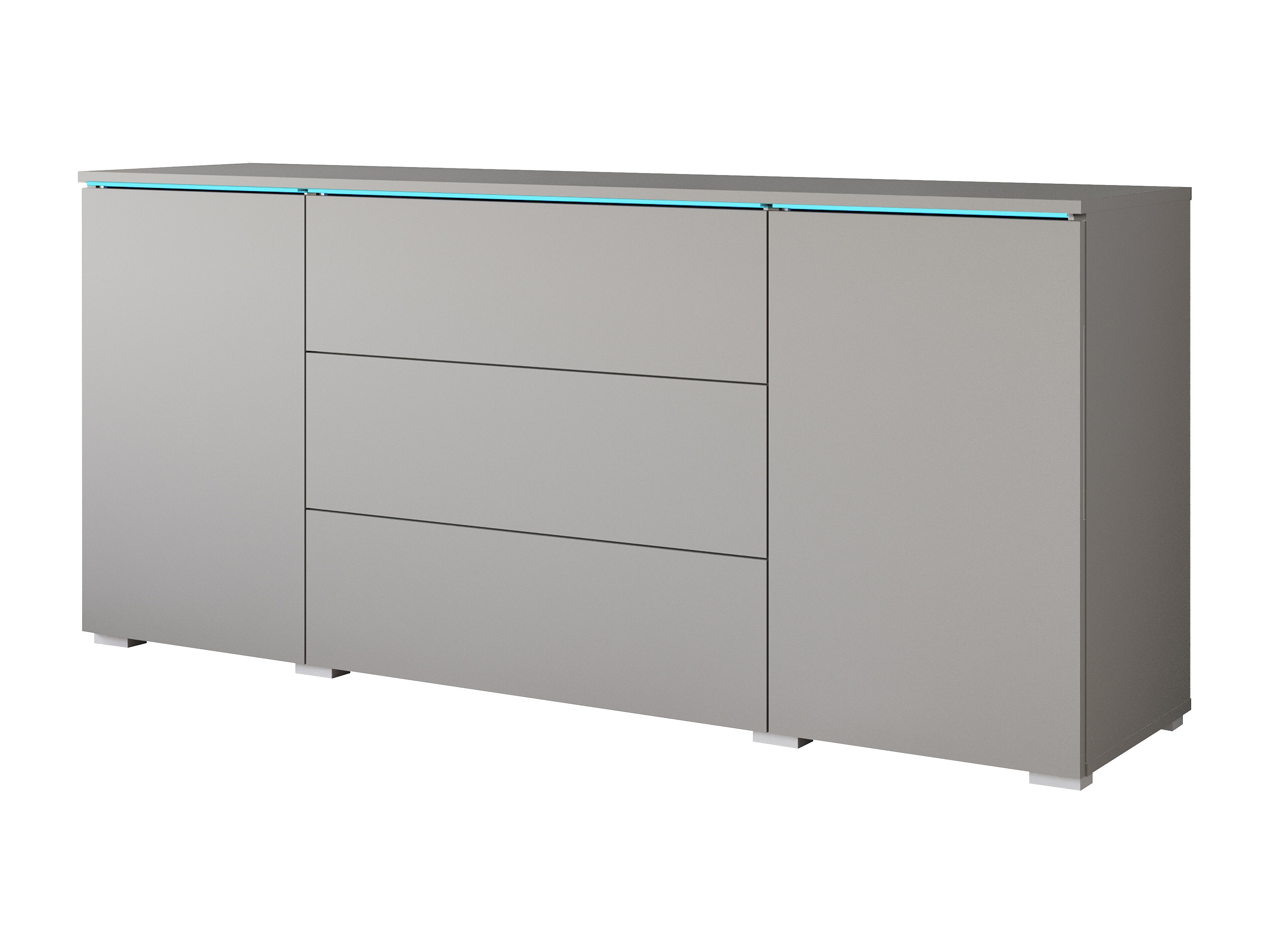 Moderne dressoir 150 cm met LED voor de woonkamer – mat afwerking, 3 lades en 2 deuren grijs pallad