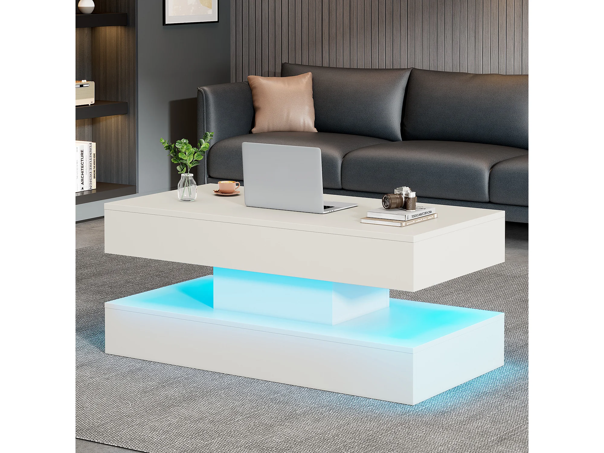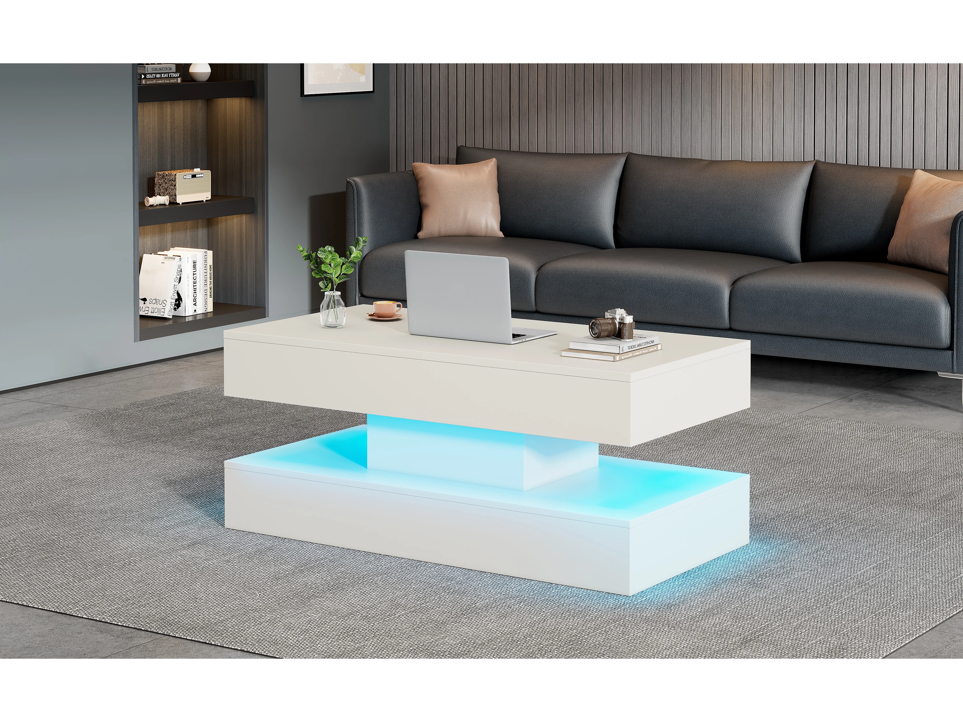 In hoogte verstelbare salontafel met LED, spaanplaat, wit, geïntegreerde opbergruimte en aanpasbare verlichting (100x50x33-46,5cm)