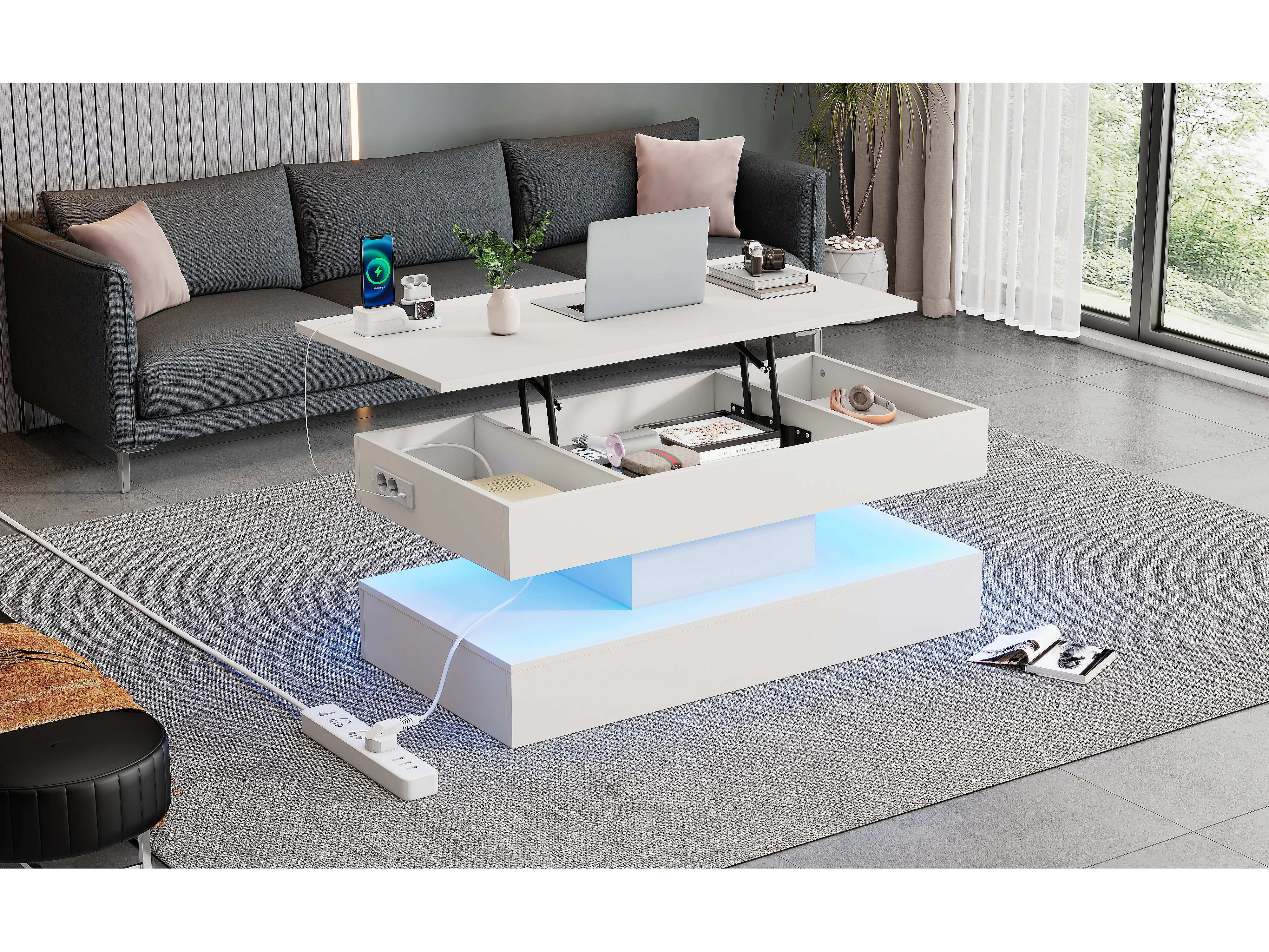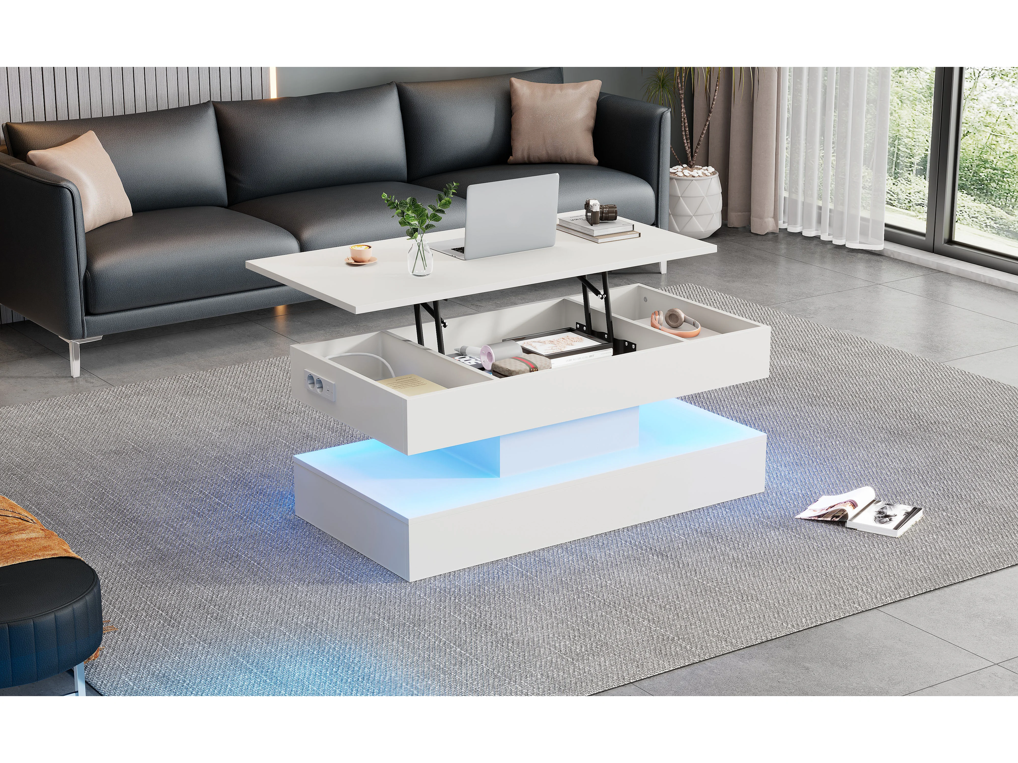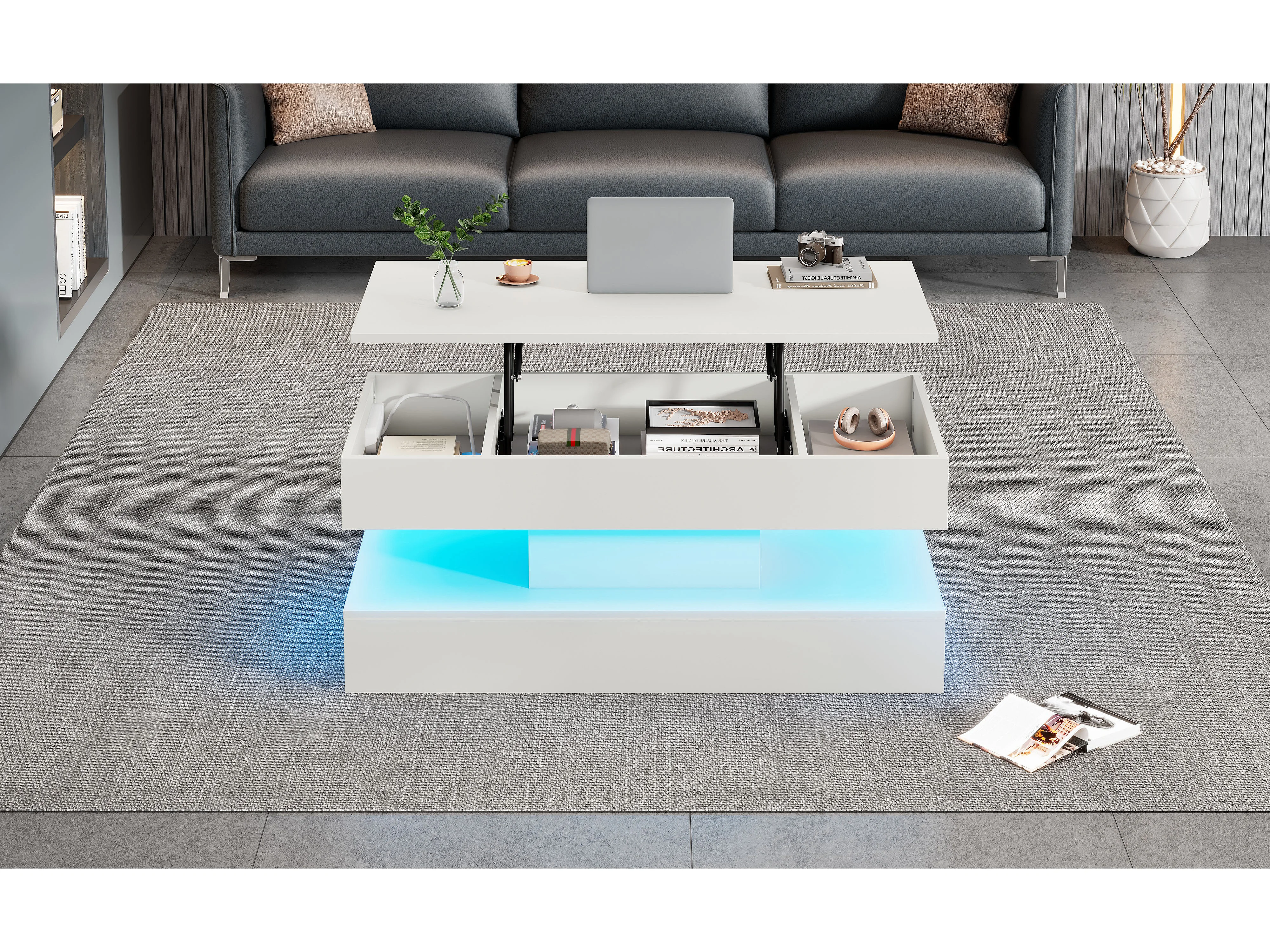 Moderne salontafel met LED-verlichting en verborgen opbergruimte, hydraulisch opklapbaar oppervlak, spaanplaat, wit (100x50x42 cm)