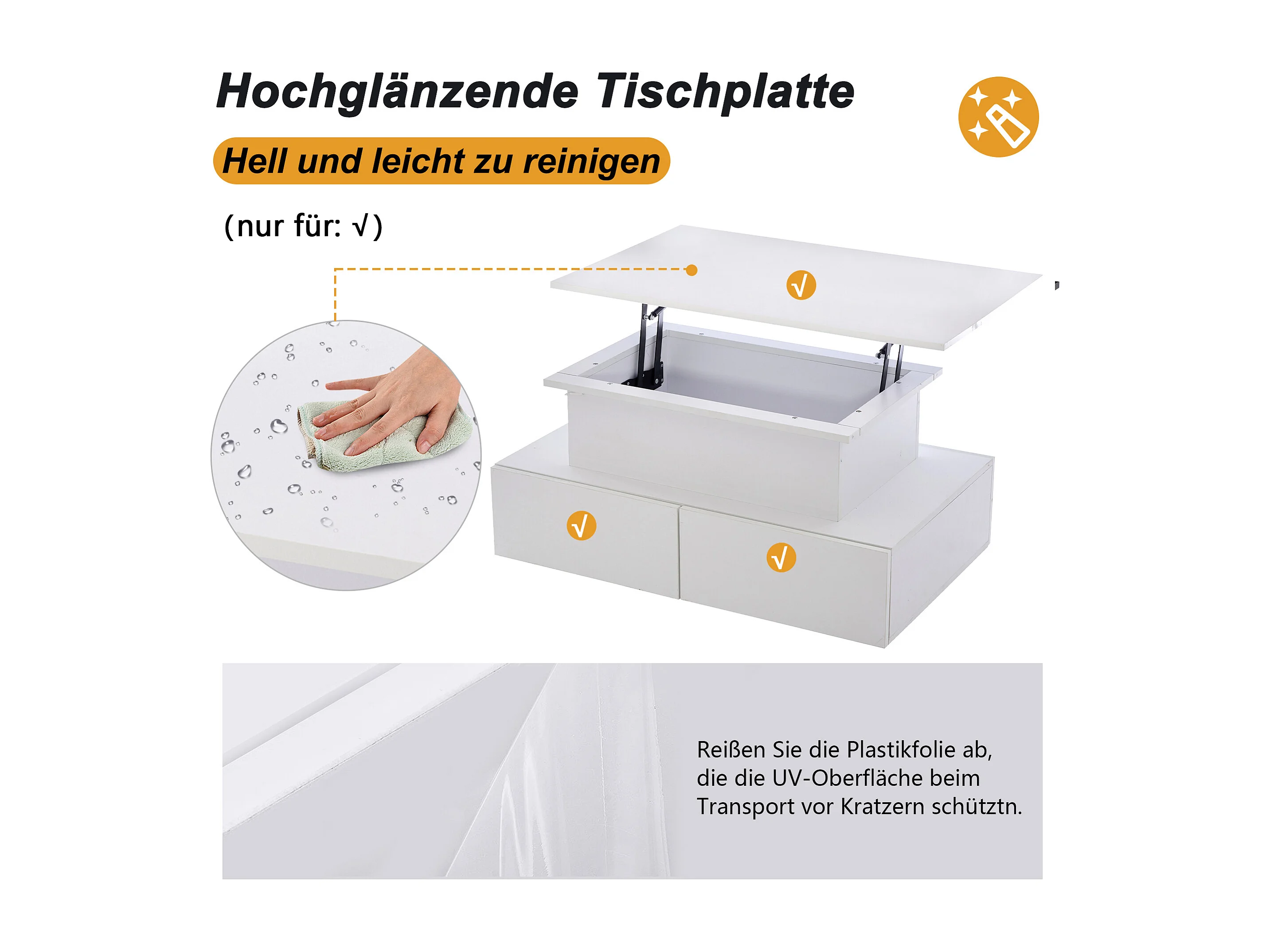 Moderne salontafel met ledverlichting, 4 lades en uitschuifbaar blad, glanzend witte spaanplaat (90x55x41cm)
