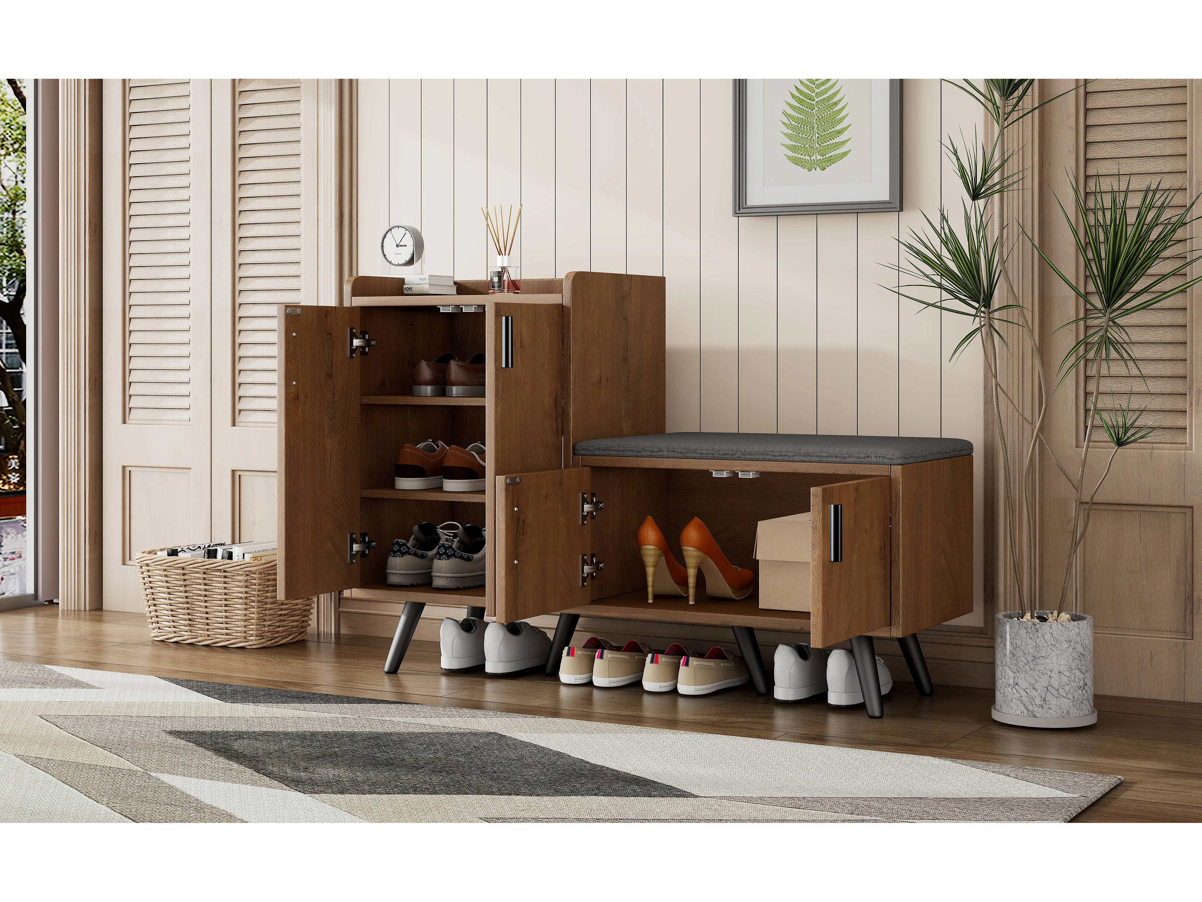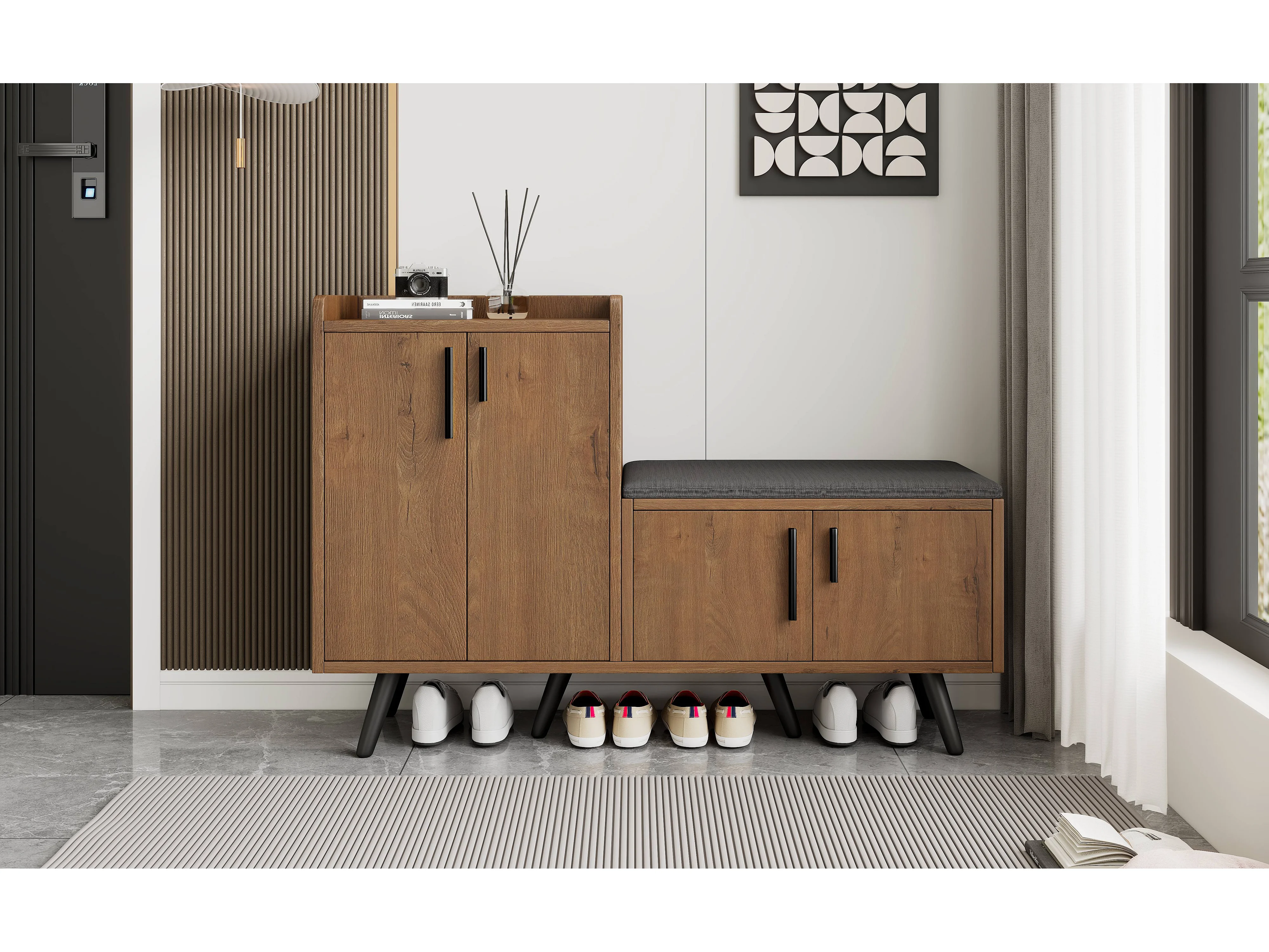 Moderne schoenenkast, natuurlijk hout, met 4 opbergdeuren, asymmetrische metalen handgrepen, (120x34x82 cm)